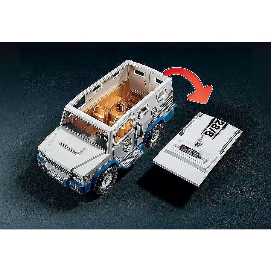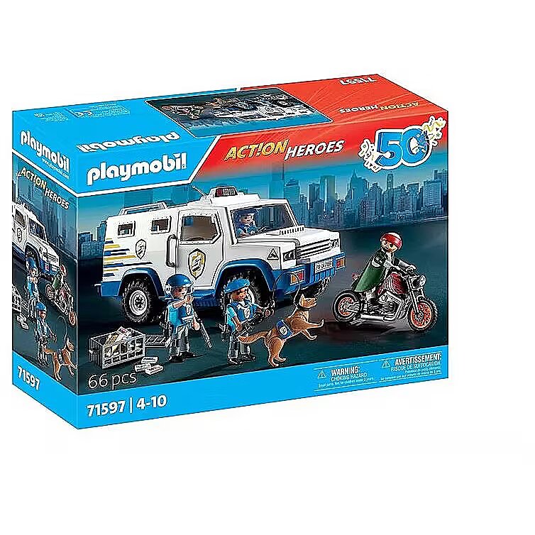 Description - Embark on a villain-hunting adventure with the fantastic PLAYMOBIL Money Transporter. Newly reissued in celebration of PLAYMOBIL's 50th anniversary! Join the Party! PLAYMOBIL turns 50 and it's time to celebrate! In 1974, a construction worker, a knight, and a Native American made their debut, capturing the hearts of children everywhere. For 50 years, these smiling toy figures have inspired kids to create their own stories, assume various roles, and embark on endless adventures in the realm of imagination. To mark the occasion, we're reintroducing the beloved Police Money Transporter set. During the daring heist of the grand money transporter, a greedy crook attempts to snatch the loot and escape on his speedy motorcycle. In this clever scenario, one of the transporter's companions can transform into a cunning thief by simply rotating his head. The transporter's roof is detachable, and its rear doors swing open, adding to the excitement!