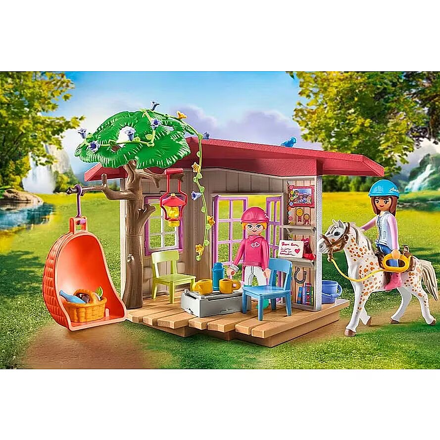 Embark on an equestrian adventure with the secret PLAYMOBIL Horse Lovers' Club! Behind a small waterfall, deep in the forest, the Waterfall equestrian group has built themselves a charming clubhouse with a cozy swing and a practical secret hideout! The perfect place to unwind after a long ride or for a secret club meeting. Isabella and Amelia always have a cup of hot chocolate and delicious bagels with them. The friendly horse listens to the giggles of the group and the chirping of birds.