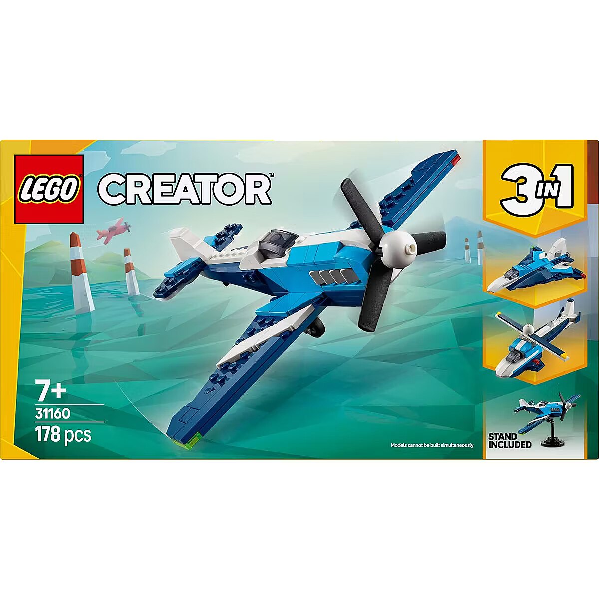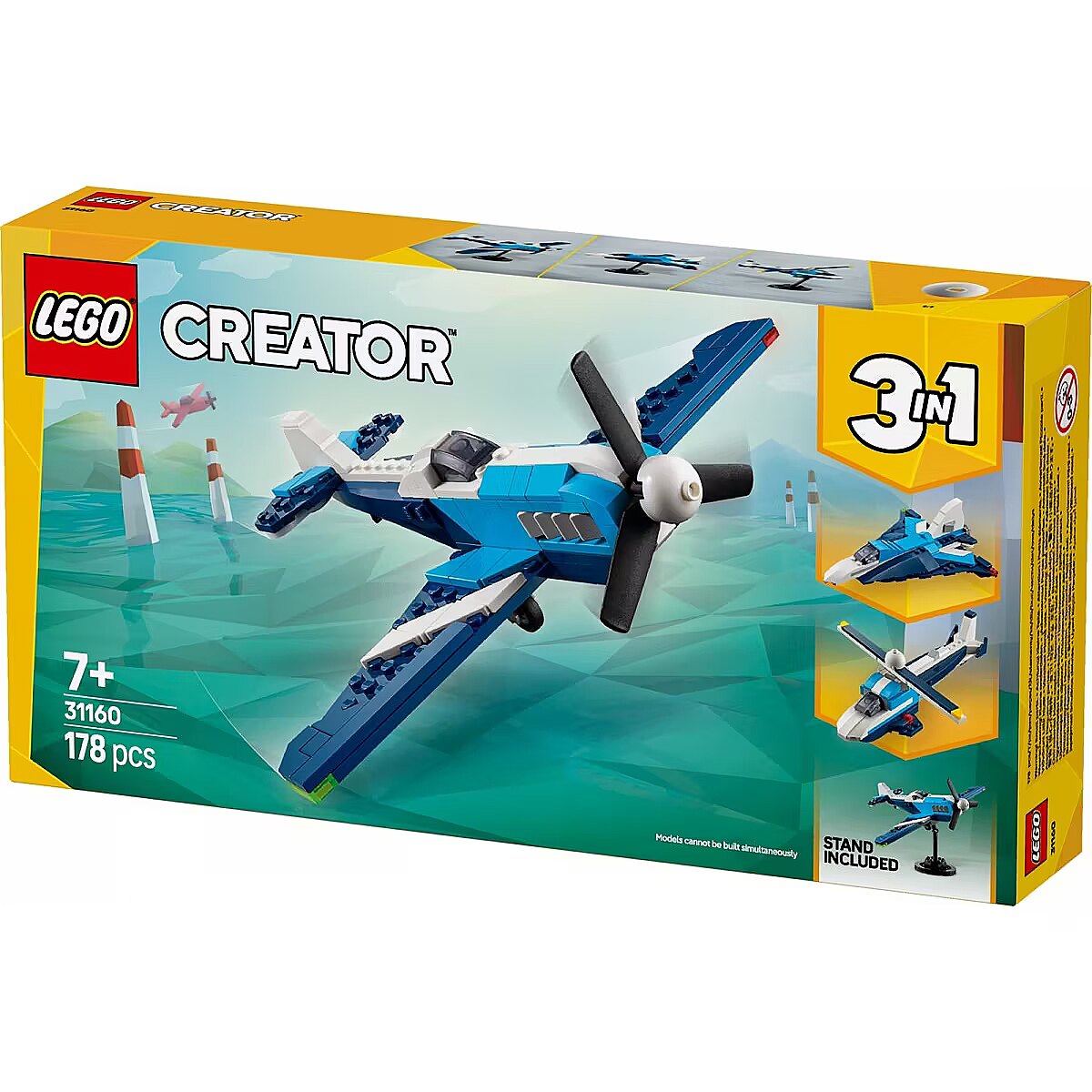 LEGO Creator 3in1 sets are great gifts for kids with 3 different models to create and recreate in every box. These 3in1transforming toy sets let them enjoy imaginative play and offer an impressive range that appeals to their biggest passions, including supercool vehicles, amazing animals and detailed houses. Please note that models cannot be built simultaneously.     3 kids toy vehicles in 1 box LEGO Creator 3in1 Aircraft: Race Plane toy playset lets boys and girls aged 7 and up build and rebuild 3 different vehicles with the same bricks     Nonstop play options Kids can stage aerial adventures with 3 different vehicle building options (models cannot be built simultaneously): a Race Plane toy, a jet plane toy and a helicopter model     Moving features The Race Plane toy has a rotating propeller and moving wheels; the jet plane toy has moving wheels; andthe helicopter model has a spinning rotor blade     Display models All 3 LEGO models can be displayed on a brick-built stand     Gift for boys and girls 3in1 toy provides a build-and-play experience for kids who love imaginative play and staging fast-paced action     More 3in1 fun Enjoy even bigger adventures with other sets (sold separately) from the LEGO Creator 3in1 range     LEGO Creator toys Every 3in1 set lets kids build 3 different models inspired by some of their biggest passions, including animals, vehicles and detailed houses     Measurements This 178-piece flying toy for kids playset features a LEGO Race Plane measuring over 3 in. (7 cm) high, 8 in. (20 cm) long and 8.5 in. (21 cm) wide