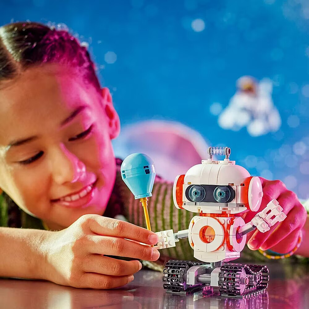 Description - Boys and girls aged 8 plus play out stories among the stars with this LEGO Creator 3in1 Space Robot (31164) science playset. This robot toy for kids is set on moving tracks and features a jetpack, a body and head that can spin around, posable arms and fingers, a balloon, and a light brick that illuminates its chest. LEGO fans build and rebuild 3 different action-packed space playsets with the same bricks: a robot toy on moving tracks; a posable space dog figure with a bone and a flying disc; or a space rocket. All 3 models are cool space-themed gifts for play and display and illuminate when kids press down on a light brick (batteries included). LEGO Creator 3in1 sets make great gifts for kids with 3 different models to rebuild in every box. These 3in1 transforming toy sets boost imaginative play and offer an impressive range that appeals to their biggest passions, including supercool vehicles, amazing animals and detailed houses. Please note that models cannot be built simultaneously. 3 space toy building options in 1 box LEGO Creator 3in1 Space Robot science playset lets boys and girls aged 8 and up build and rebuild 3 different toys using the same bricks Multiple play possibilities Kids can stage intergalactic adventures with 3 different playsets (models cannot be built simultaneously): a Space Robot toy, a space dog figure and a space rocket Posable space figures The robot toy has posable arms and fingers and a head and body that can spin around, while the space dog has a rotating head and 4 posable legs Illuminated models All 3 LEGO space models light up when kids press down on a special light brick (batteries included) Robot gift 3in1 toy provides a fun build-and-play experience for space fans and can be given as a birthday gift for hours of imaginative play More 3in1 fun Expand kids adventures with other sets (sold separately) from the LEGO Creator 3in1 range LEGO  Creator toys Every 3in1 set lets kids build 3 different models inspired by some of their biggest passions, including animals, vehicles and houses Measurements This 281-piece space playset features a buildable LEGO robot standing over 5 in. (13 cm) tall