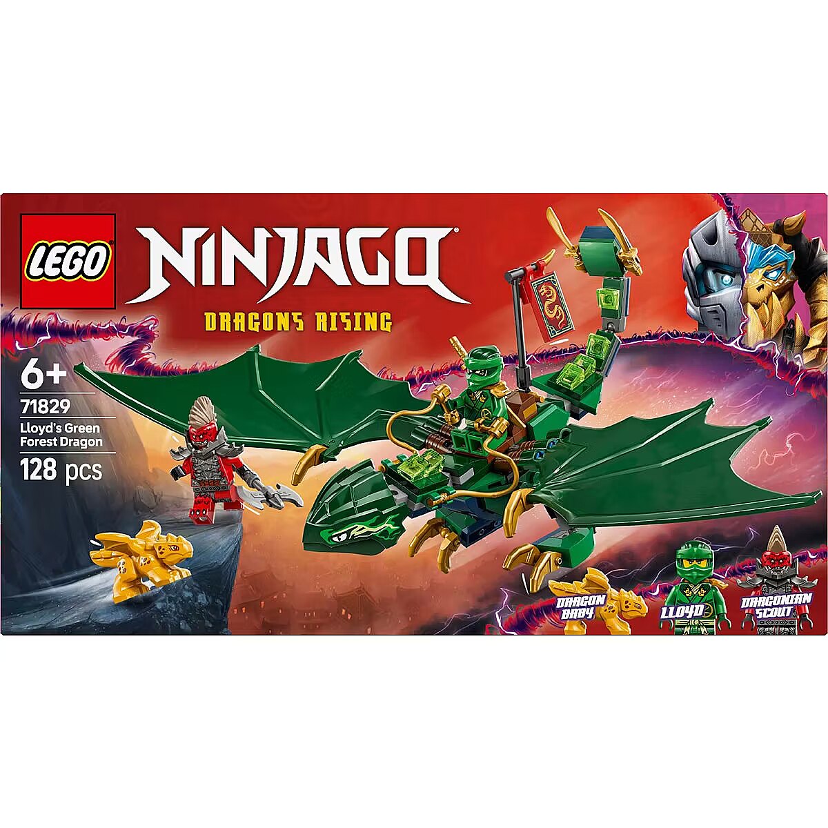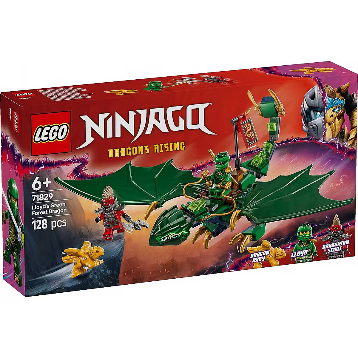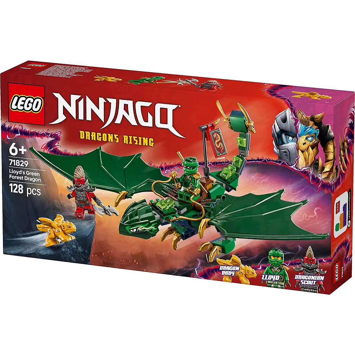 The LEGO NINJAGO range of buildable ninja toys includes mechs, vehicles and temples for kids to escape into a fantasy world of adventure alongside their heroes. Each action toy playset can be created with the LEGO Builder app, which guides you and your child on an easy and intuitive building adventure.     Dragon toy for kids Boys and girls aged 6 years old and up can recreate aerial scenes from season 3 of the NINJAGO Dragons Rising TV show with Lloyds Green Forest Dragon     Posable NINJAGO dragon A buildable model of Lloyds Green Forest Dragon with a posable tail, neck, legs, hands and large wings, plus a saddle so a minifigure character can ride on its back     2 minifigures Lloyd armed with a golden katana sword accessory and a villainous Dragonian Scout warrior with an axe accessory so kids can enjoy exciting ninja action     Baby dragon model This building kit also comes with a golden Dragon Baby model so ninja fans can enjoy even more nurturing play possibilities     Ninja gift This action toy playset provides a fun build-and-play experience and is a gift idea for kids who love to play out action-packed ninja stories     Bigger ninja adventures Look out for more NINJAGO toys (sets sold separately) featuring temples, mechs and vehicles     A universe of ninja toys LEGO NINJAGO sets let kids escape into a fantasy world of adventures with their ninja heroes     Measurements This 128-piece LEGO building set for kids includes a posable dragon toy measuring over 4 in. (10 cm) high, 9.5 in. (24 cm) long and 13 in. (33 cm) wide