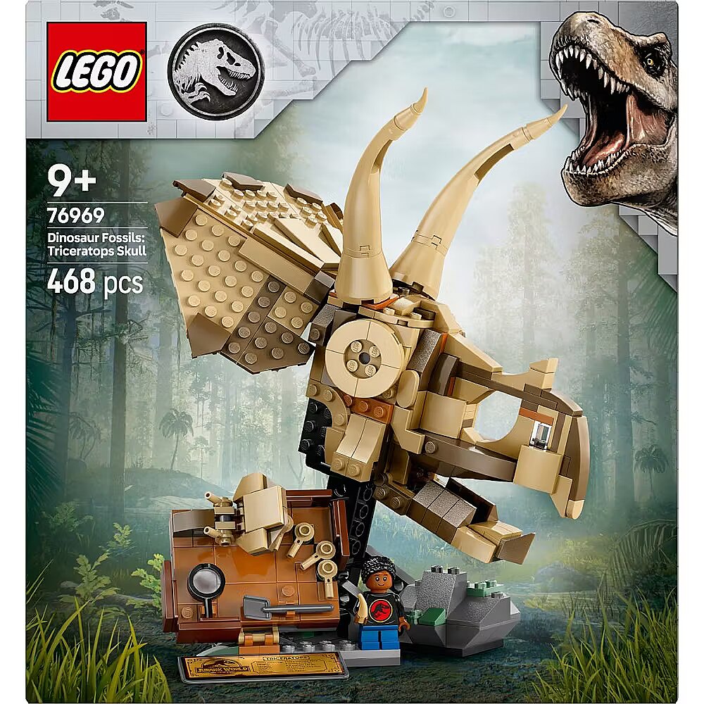 Dziewięciolatki i starsze dzieci interesujące się paleontologią będą zachwycone zestawem LEGO Jurassic World Szkielety dinozaurów: czaszka triceratopsa (76969). Ten model z serii Szkielety dinozaurów zawiera czaszkę triceratopsa z otwieraną szczęką, podstawkę ze skałą, tabliczkę z miejscem wykopalisk z małymi skamieniałościami i narzędziami do wykopalisk, minifigurkę LEGO, tabliczkę z informacjami oraz element bursztynu z zatopionym komarem.