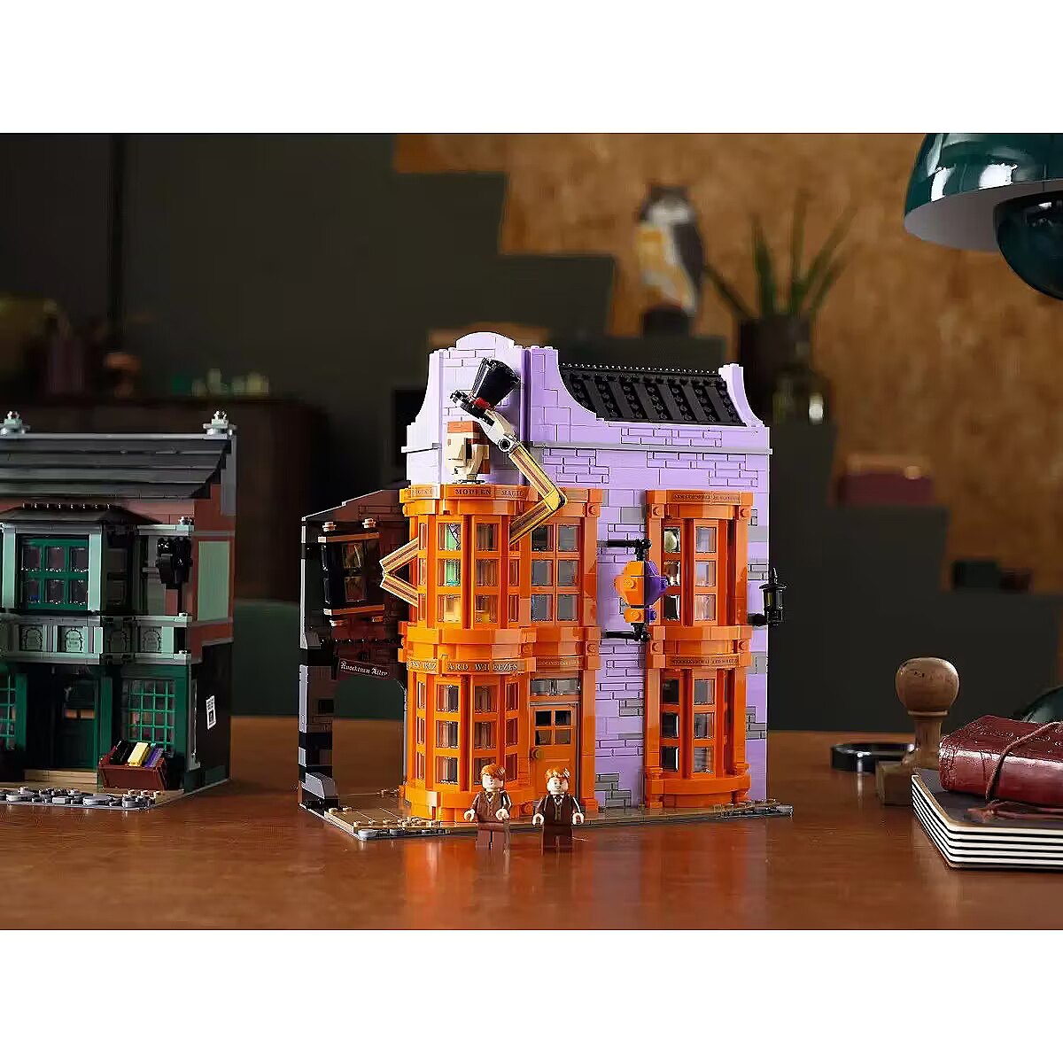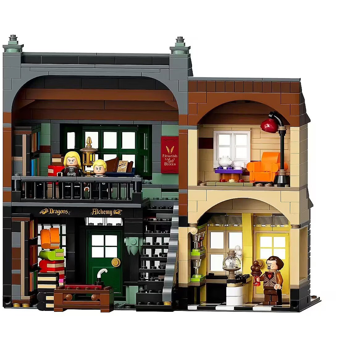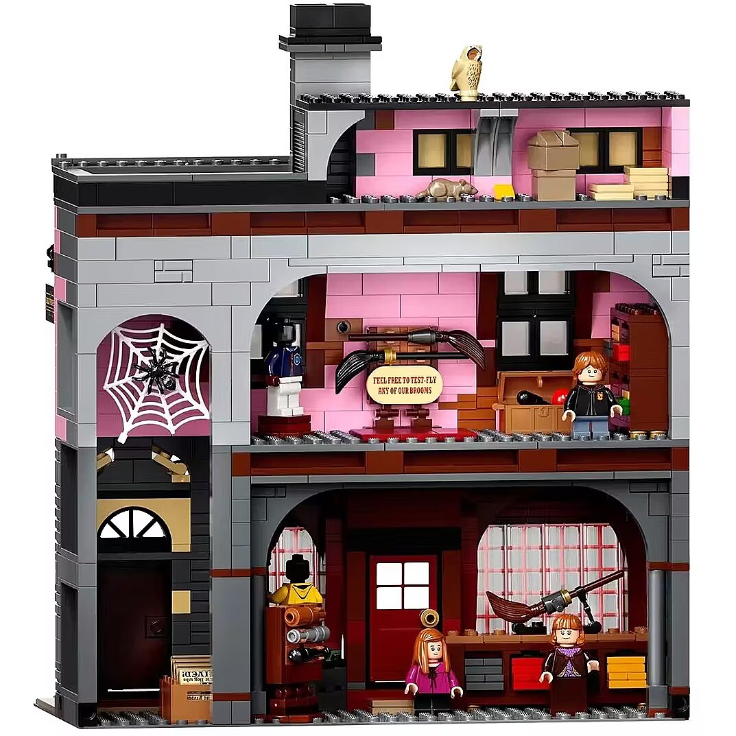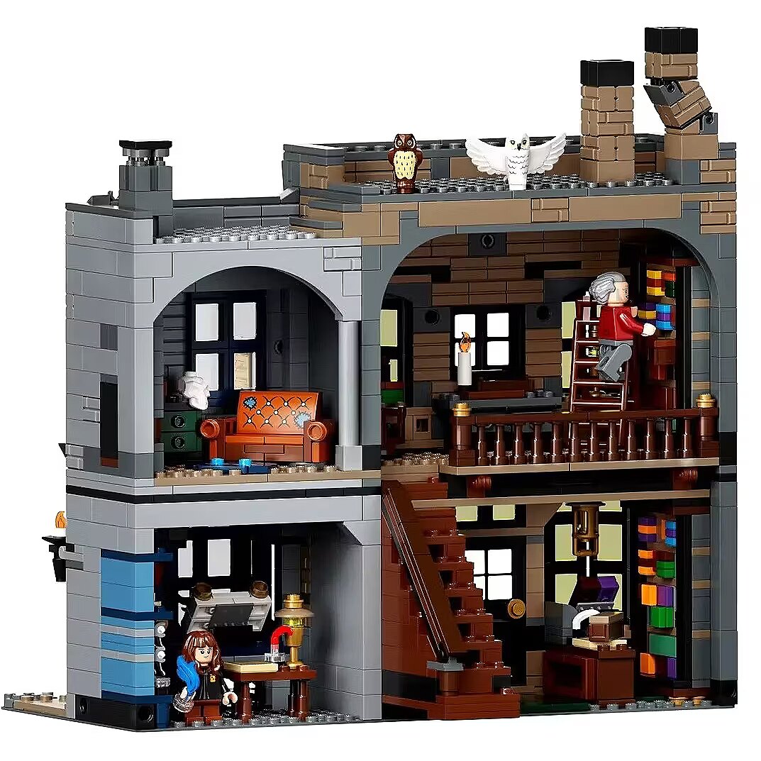 This impressive model, over a meter wide, captures the scale and atmosphere of the place where the magical world does all its essential shopping. Beautiful facades hide incredibly detailed interiors with fascinating features and familiar characters. You can see wands at Ollivanders, have Gilderoy Lockhart sign a book at Flourish and Blotts, pick up a love potion at Weasleys Wizard Wheezes, browse writing supplies at Scribbulus, check out official Quidditch gear, enjoy ice cream at Florean Fortescues, and visit the Daily Prophet offices. Collector-worthy building experience