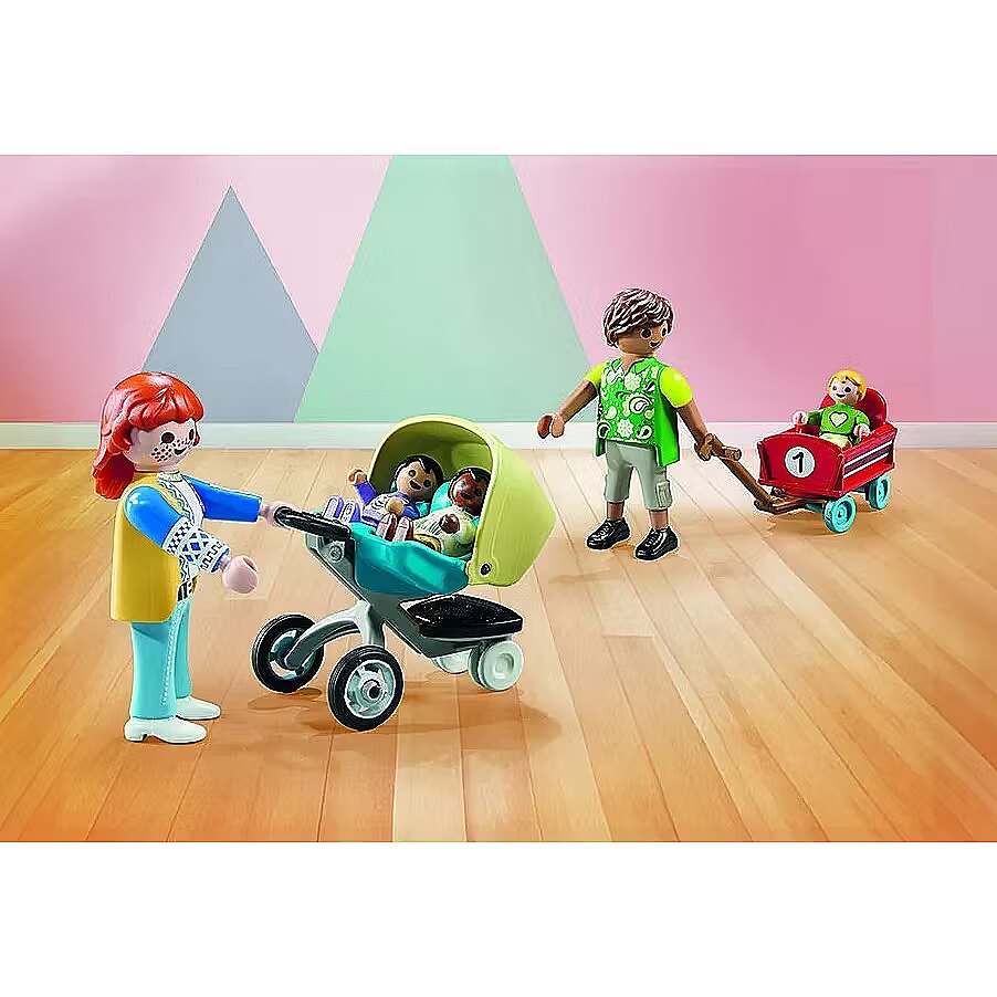 Accessories included - Figurki: kobieta, mężczyzna, 3 niemowlęta Akcesoria: różne zabawki, wózek, wózek bliźniaczy, łóżeczko, przewijak, krzesełko do karmienia, śliniak, miarka