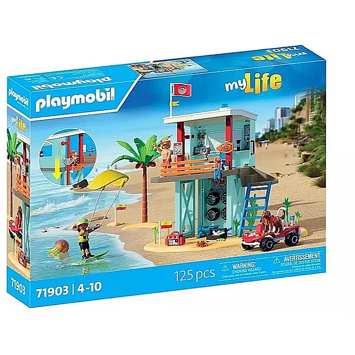 Description - O nie! Meduza złapała kitesurfera za nogę. Jak dobrze, że ratownik z wieży ratowniczej stale obserwuje plażowiczów i kąpiących się w wodzie. Błyskawicznie chwyta deskę ratunkową i pędzi na miejsce zdarzenia. Jego pies w kamizelce ratunkowej aktywnie wspiera go w bezpiecznym doprowadzeniu poszkodowanego na plażę, a następnie opatrzeniu go. W przypadku misji odbywających się z dala od wieży ratowniczej, ratownik korzysta z pojazdu plażowego. W dolnej części wieży znajduje się mały warsztat naprawczy z szeroką gamą akcesoriów. Słońce, plaża i akcje ratunkowe to codzienność w wieży ratowniczej PLAYMOBIL! Dwupoziomowy budynek z rurą zjazdową i w pełni wyposażonym stanowiskiem ratownika pozwala szybko reagować na wezwania z plaży. Meduza ognista i krab dodają scenerii życia, a plażowy pojazd mieści jedną figurkę i deskę ratunkową - idealnie do błyskawicznego ruszenia na pomoc! Na dolnym poziomie znajduje się warsztat z narzędziami i zapasowymi oponami. W misji pomaga też dzielny pies ratowniczy w kamizelce oraz zestaw do kitesurfingu. Ten bogaty w szczegóły zestaw PLAYMOBIL to mnóstwo akcji, akcesoriów i letniej zabawy bez końca!