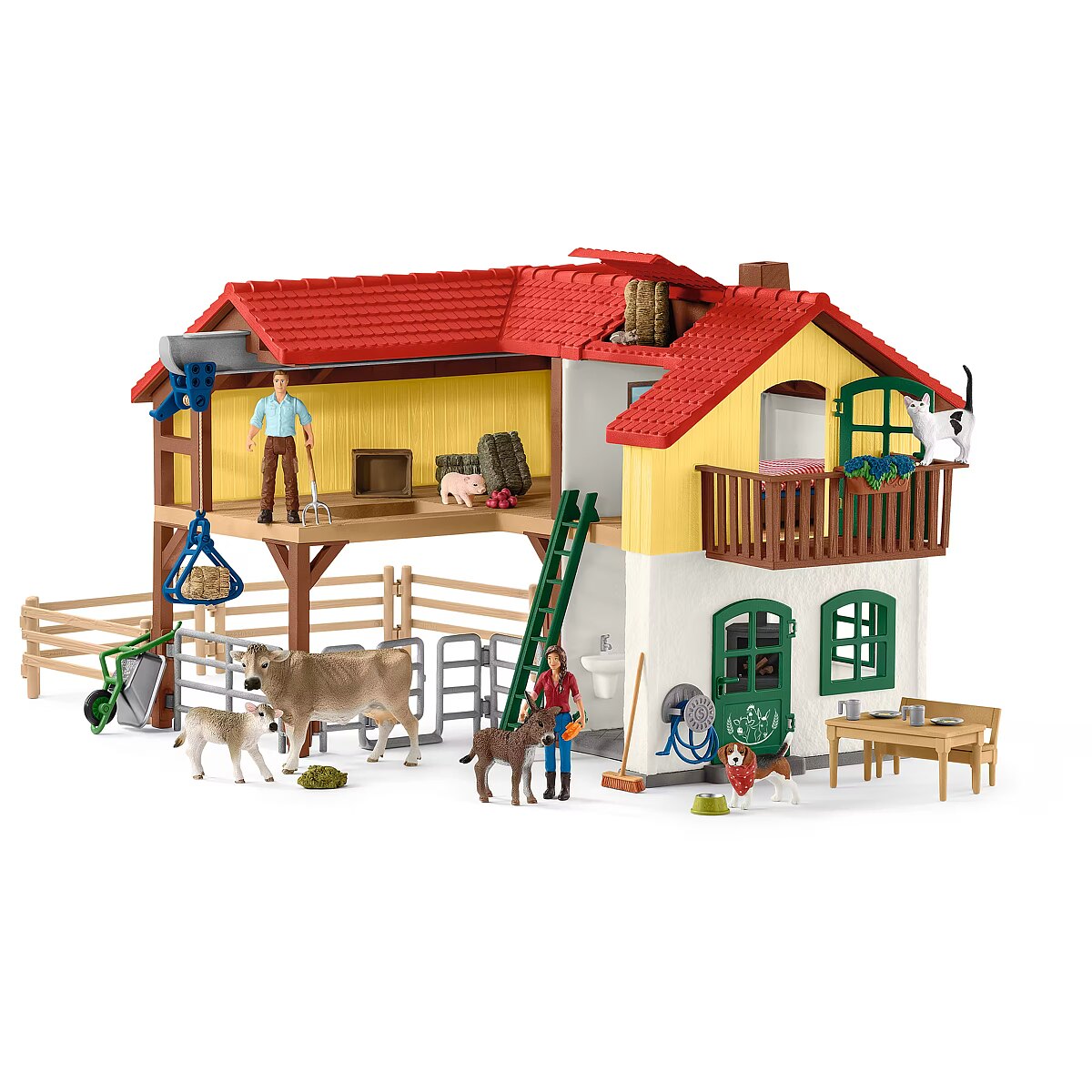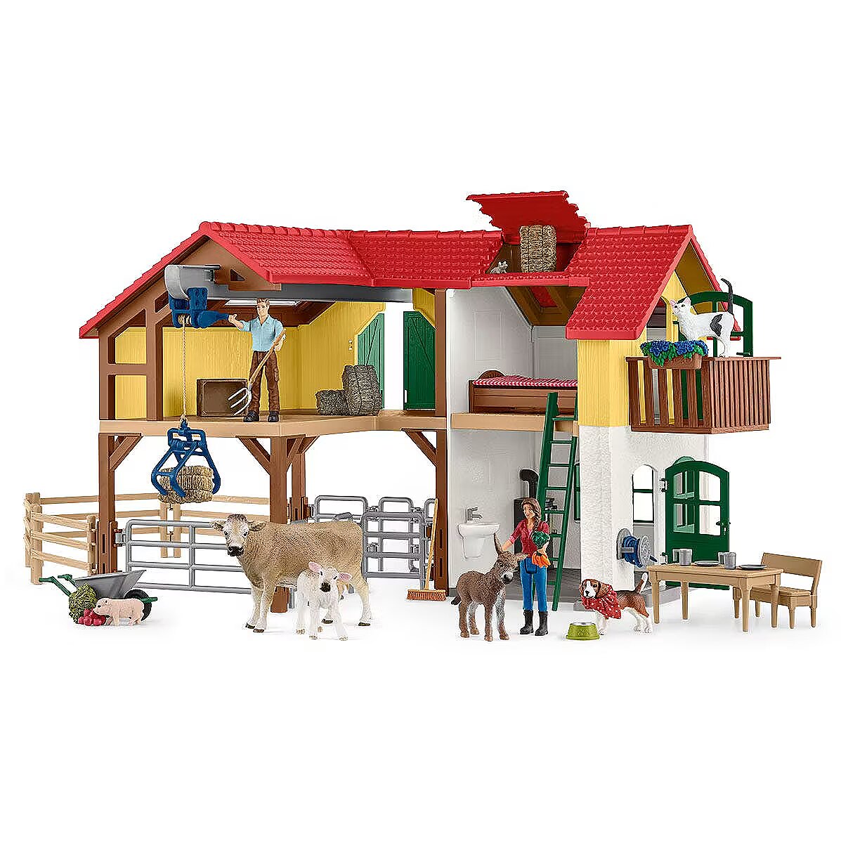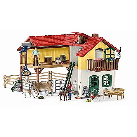 LongDesc - The large farmhouse playset from schleich® is the heart of the schleich® FARM WORLD and includes nine figurines and dozens of accessories for hours of storytelling and imagination. Give the ultimate farm-themed gift for kids 3 and up. The schleich® figurines are crafted with the detail and authenticity that make schleich® toys famous worldwide. This set also plays nicely with our other toys, like the Happy Cow Wash.From their family homestead, the farmers lovingly care for all the animals on the farm. The friendly donkey foal munches on carrots, while in the cow and her calf enjoy fresh hay in the paddock. Has anyone seen the farm cat? There she is napping in the hay loft!The large farmhouse playset from schleich® is the heart of the schleich® FARM WORLD and includes dozens of accessories for hours of storytelling and imagination. The farmhouse features a spacious living area with kitchen, dining area and bedroom. The stable provides comfortable living quarters for the animals, and there's plenty of storage in the hay loft for hay - there's even a winch to lift the hay bales. Fences give the paddocks and stable area multiple configuration options. Add a hay conveyor and tractor (each sold separately) to expand your farm! This farm playset includes two farmer figurines and seven animal figurines. schleich® farm toys for toddlers and kids introduce the endless possibilities of storytelling and imaginative play. From little donkey foal figurines to big barns filled with horses and cows, schleich® FARM WORLD has all the animal figures and farmer figures and sets you need to let your stories run wild! For even more action and adventures, our farm toys and figures play well with schleich® unicorn toys, dinosaur toys, wild animal figures and toy horses! schleich® playsets are built to last. All our toys meet the highest national and international safety standards.