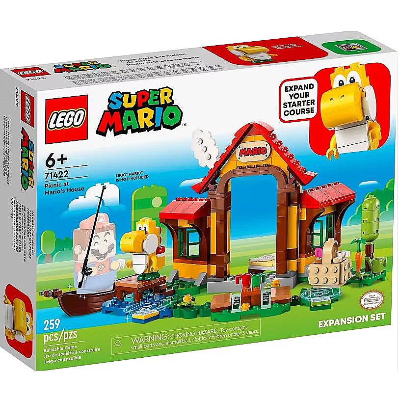 Description - Kids can create a fun-packed level with this cool LEGO Super Mario Picnic at Marios House Expansion Set (71422). The detailed brick-built house and garden offer rich role-play options and ways for players to earn digital coins with their interactive LEGO Mario, LEGO Luigi or LEGO Peach figures (not included). Say Hi to the Yellow Yoshi, sleep on the bed, eat cookies from the picnic basket, water the vegetables in the garden, play hockey or go fishing in the boat. Note: the 71360, 71387 or 71403 Starter Course is required for interactive play. Top gift This collectible toy playset makes an awesome gift for kids aged 6 and over who like to be part of the latest trends. Download the LEGO Super Mario app for building instructions, inspiring tips and other fun stuff to enhance childrens creative experience. Endless possibilities LEGO Super Mario Starter Courses and Expansion Sets allow fans to expand, rebuild and create unique levels for hours of coin-collecting play. Picnic at Marios House (71422) Children can build a detailed version of Marios home for coin-collecting play and role-play fun with this LEGO Super Mario Expansion Set 1 LEGO Super Mario toy figure A Yellow Yoshi for LEGO Mario, LEGO Luigi or LEGO Peach (note: these 3 interactive figures are not included) to say Hi to Fun features LEGO Mario can sleep on the bed, eat a snack from the picnic basket, water the vegetables in the garden, play hockey using the picnic table as a goal and more Go fishing Place LEGO Mario in the boat and a fishing rod appears on his belly screen. Move the boat around and lift it to try and catch a fish. A fish appears on screen if you catch one Gift idea for ages 6 and over Give this 259-piece set as a treat or Christmas gift to kids who own a LEGO Super Mario Starter Course (71360, 71387 or 71403), which is required for play Rebuild and mix Measuring over 14 cm (5.5 in.) high, 24 cm (9.5 in.) wide and 20 cm (7.5 in.) deep in its basic formation, this modular set combines with other LEGO Super Mario toy playsets Companion app Download the LEGO Super Mario app for building instructions, inspirational ideas and more. For a list of compatible Android and iOS devices, visit LEGO Nurture kids imaginations LEGO Super Mario sets are designed for solo or social play, offering hours of coin-collecting fun and limitless creative challenges through expansion and rebuilding Premium quality Since 1958, LEGO building bricks and pieces have met strict industry quality standards to ensure that they connect simply and securely Safety assurance LEGO components are tested in almost every way imaginable to make sure they comply with rigorous global safety standards