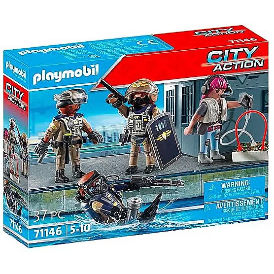 Technical_details - With this set of four PLAYMOBIL figures you can put together a powerful task force for security in Playmobil City. The three SWAT teams are equipped with plenty of equipment - including diving accessories and appropriate clothing. You are hunting a villain who is included as a fourth character. Item no.: 1888957 Kind of construction toy EAN 4008789711465 Manufacturer no. 71146 City Action series Parts 37 pieces Contents/Features Figures: 3 SWAT officers, a villain. Accessories: 1 map, 1 crowbar, 1 harpoon, 1 baton, 2 pistols, 1 GPS device, 1 diving lamp, 2 fins, 1 protective shield, 1 diving mask with diving bottle, 1 diving watch, 2 visor helmets, 1 boom microphone, 1 diving vest. Age recommendation from 5 years to 10 years Target group kindergarten children, school children Material: Plastic Warnings Warning: Not suitable for children under 36 months! Caution: Danger of suffocation due to small parts that can be swallowed!