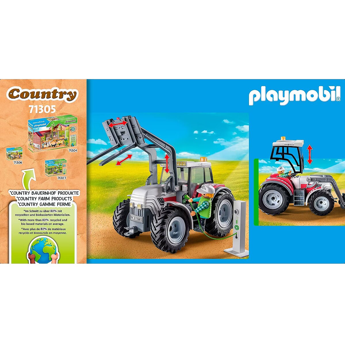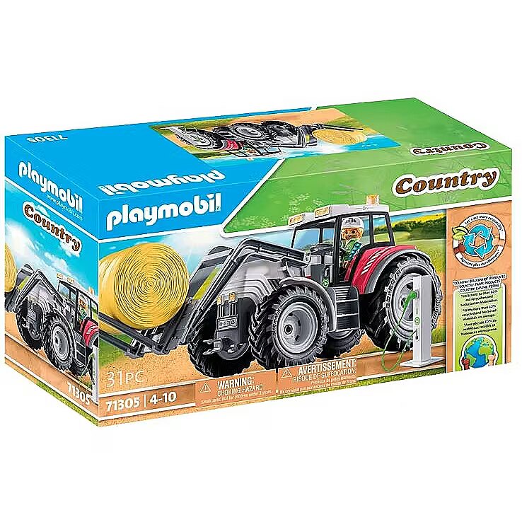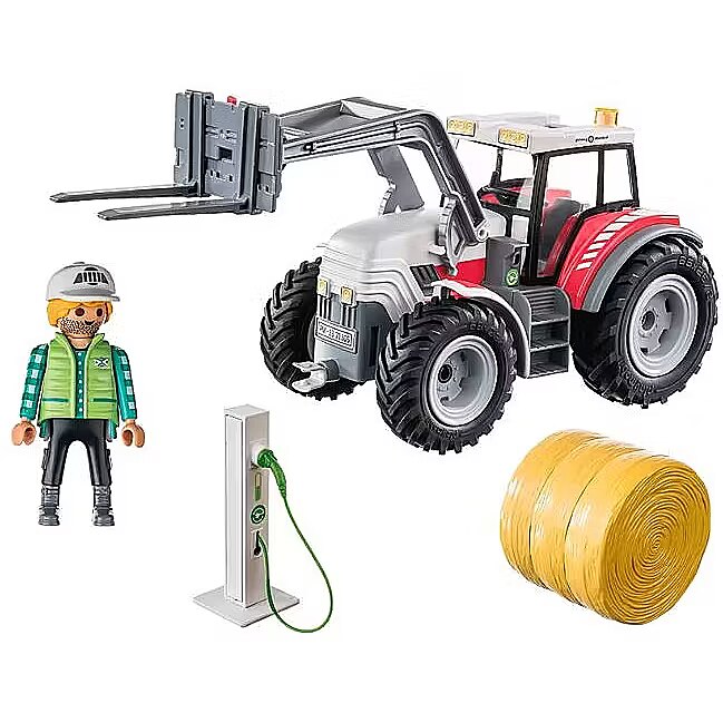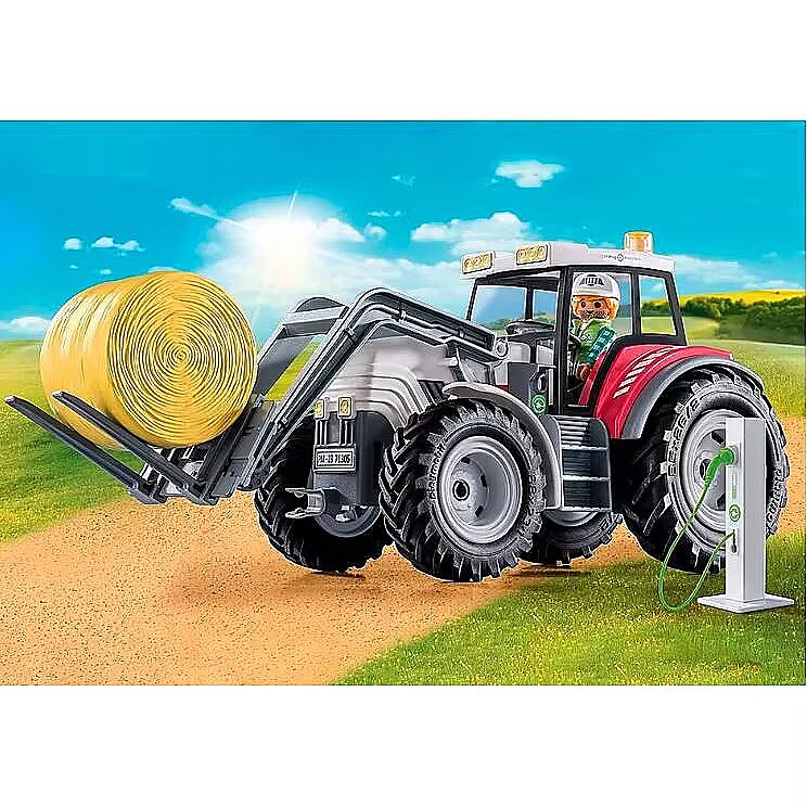 Description - The large, electric tractor with folding roof can transport heavy hay bales effortlessly. It "refuels" with new energy at the e-charging station. The cool large tractor from PLAYMOBIL has everything nature-loving children need to support the farmer's family in the field work. With the modern tractor, the heavy hay bales can be lifted and transported effortlessly, and thanks to the electric drive, it's also environmentally friendly. After work, the e-charging station can be used to "refuel" the vehicle. Makes a great birthday, holiday or any-day treat for creative kids who love agriculture. The large organic farm from PLAYMOBIL invites children aged 4 and up to discover a new side of country life. The richly detailed sets with lovely characters inspire kids to imaginative roleplay adventures and encourage a mindful use of our natural resources. The 31-piece toy set includes a PLAYMOBIL figure, a tractor with a folding roof and movable forklift plate, as well as an electric charging station and other great extras. Our step towards a more sustainable future In the future, our new logo will identify all of our products that are made from an average of more than 80% sustainable materials. These are composed of recycled and bio-based plastics. Foil bags made from 100% recycled plastics are used for packaging. Shipping, retail packaging, and building instructions, are made from almost 100% recycled cardboard or recycled paper.
