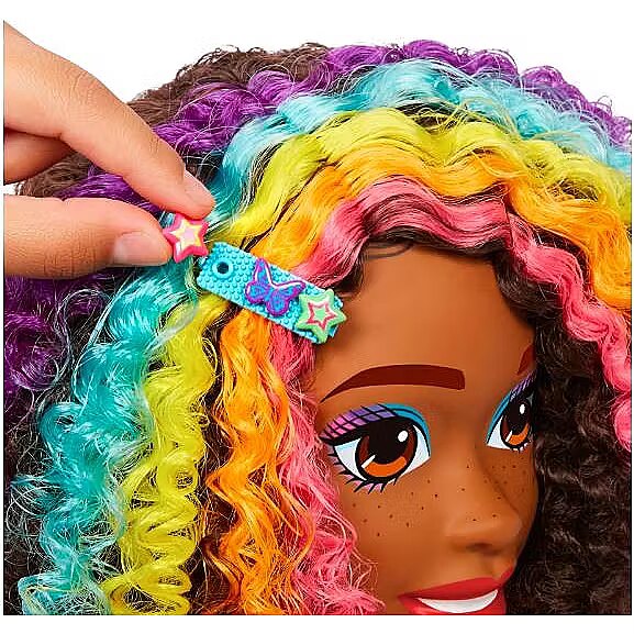 Packaging content - Packaging content - Includes 1 Barbie doll styling head with storage base, 1 hair pick, 1 hair dye brush, 1 hair dye bowl, 1 makeup sponge, 4 customizable barrettes, 8 Colour Reveal plug-ins, 1 colour-change hair extension, 1 customizable headband and 6 hair ties. Other dolls and playsets sold separately, subject to availability.