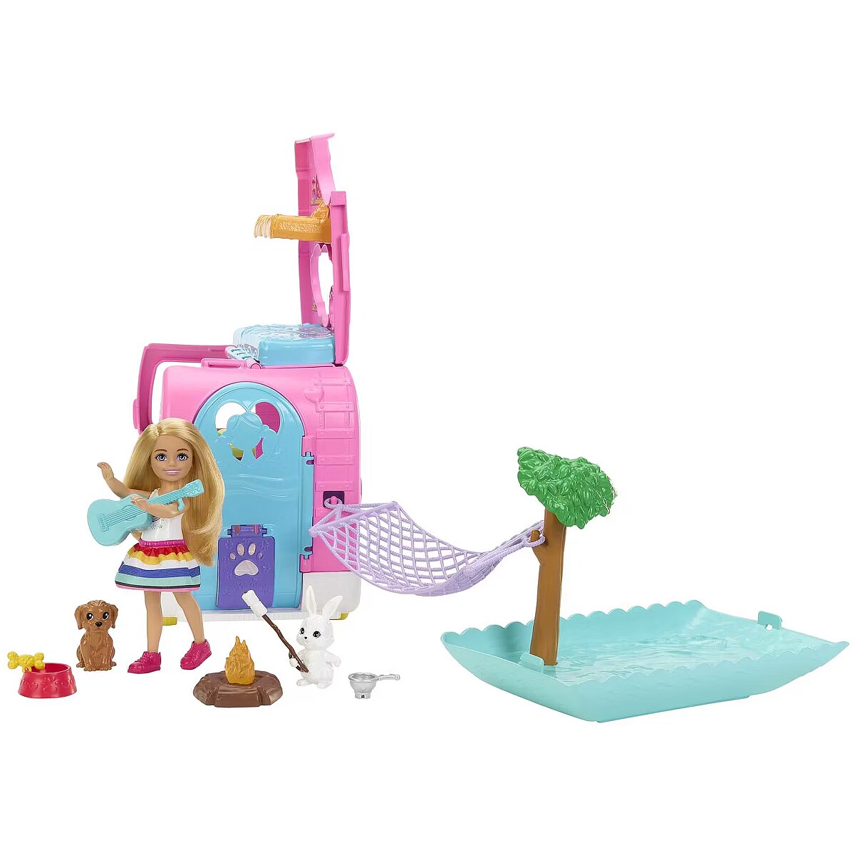 Packaging content - Packaging content - Includes 1 Chelsea doll earing a removable look and shoes, 1 transforming camper, 1 dog, 1 bunny, 1 pool, 1 hammock, 1 tree, 1 campfire, 1 guitar, 1 camera, 8 storytelling pieces and 1 sticker sheet.