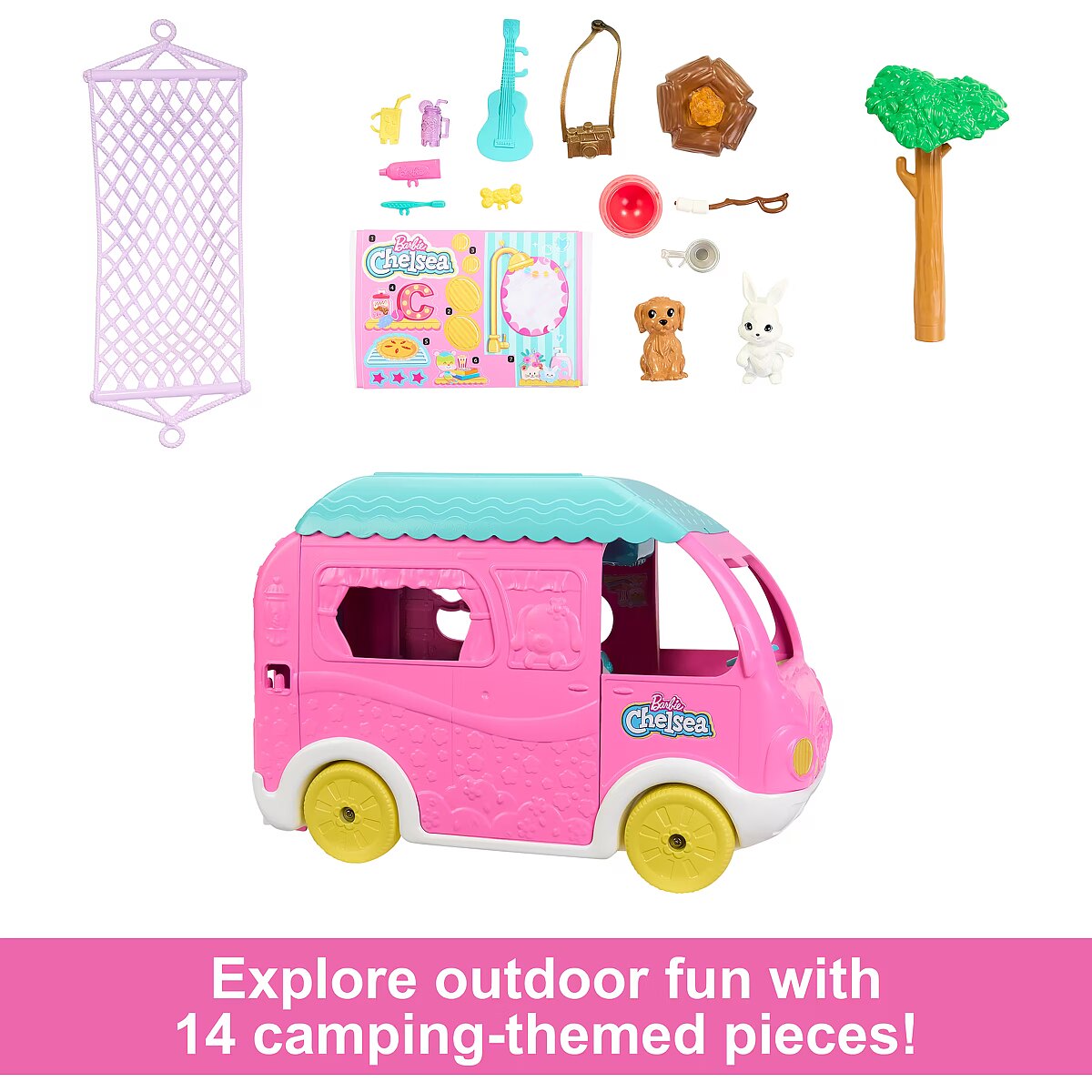 LongDesc - Imaginations can take the open road with Chelsea doll and her two pets with the Barbie Chelsea 2-in-1 Camper playset! The transforming vehicle opens to reveal six play areas, including a kitchen. Flip over the dashboard for a dining space and flip up the roof for a bedroom with beds for Chelsea doll and her two pets, all included! Kids can turn the roof over and fill with water to dive into a pool of storytelling. An additional 14 pieces, like a tree, hammock and more, inspire all kinds of tales by the campfire. With so much fun packed in, the versatile camper makes a great gift for kids 3 years and older, especially those who love adventure and the outdoors. Doll cannot stand alone. Colours and decorations may vary.