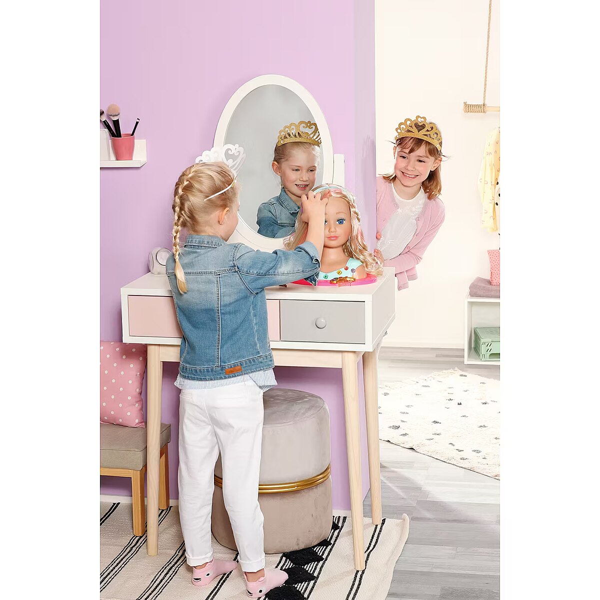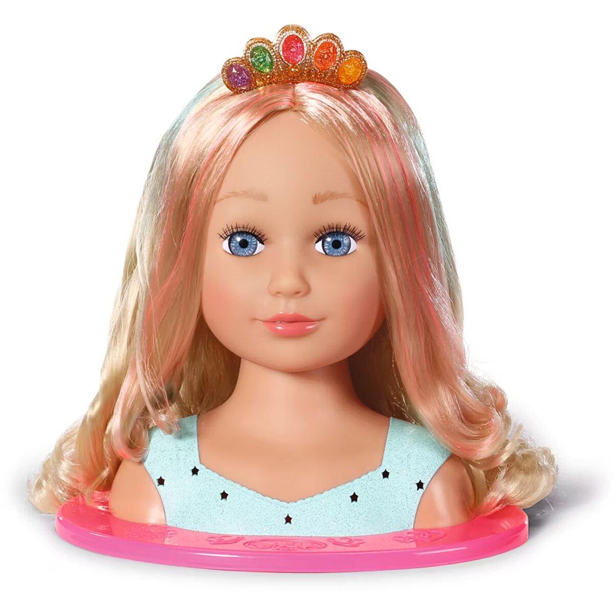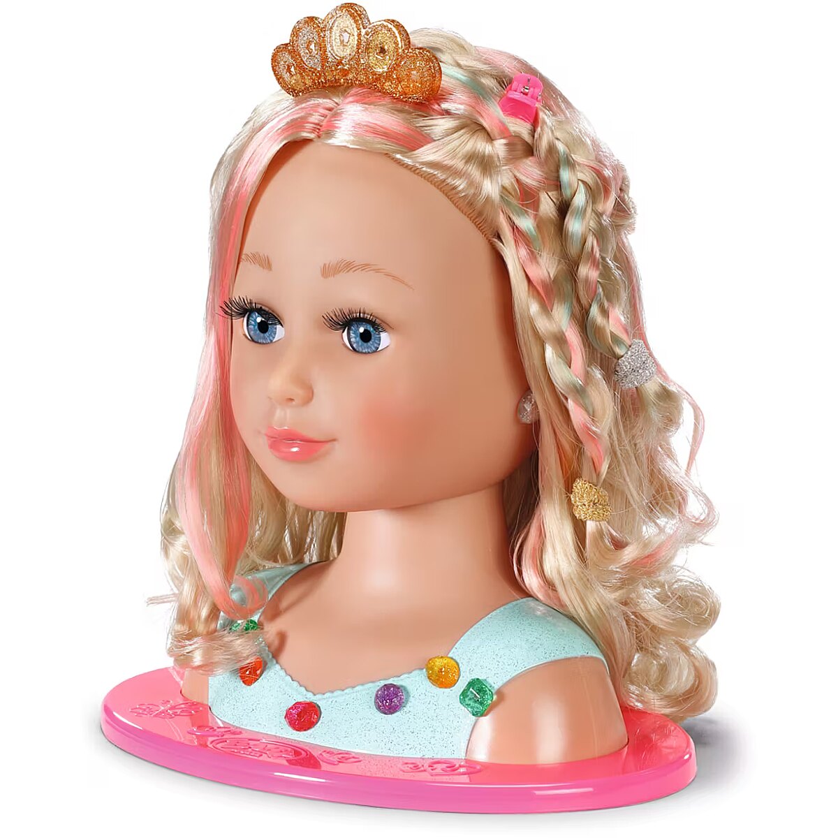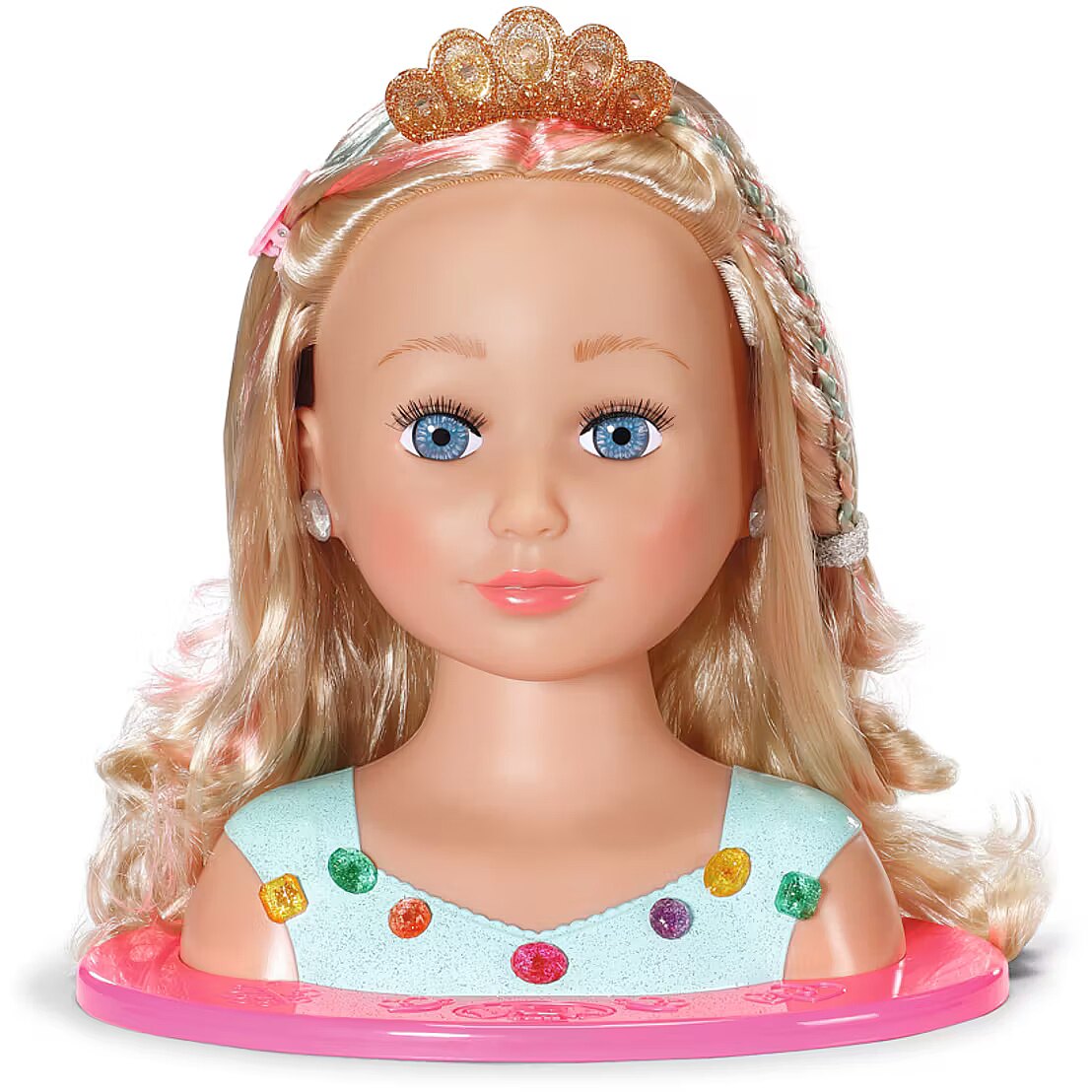 LongDesc - Welcome to the make-up studio for little princesses with an eye for style! Young make-up artists can now create stunning looks with the colourful and dermatologically tested make-up palette. The styling head with its premium-quality blonde hair and subtle, coloured highlights is easy to style using hair bobbles, hair clips, bobby pins and a hair brush. Whether it be romantic curls, elegant up-dos or supercool plaits and ponytails – royal stylists can let their imaginations run wild. The crowning glory comes in the form of the brightly coloured jewelled pins that can be used to make the transparent glittery tiara shine like stars. Now all that is missing are the perfect earrings and our princess is ready to make her grand entrance.• Make-up, styling and hairdressing • Varied (role) play boosts the imagination and supports motor skills• For enhanced and long-lasting fun through play• In a closed box ready to be shipped by online retailersBABY born Sister Styling Head Princess complete with a make-up palette, hair brush, 4 hair clips, 8 bobby pins, 4 hair bobbles, a tiara and 14 jewelled pins.