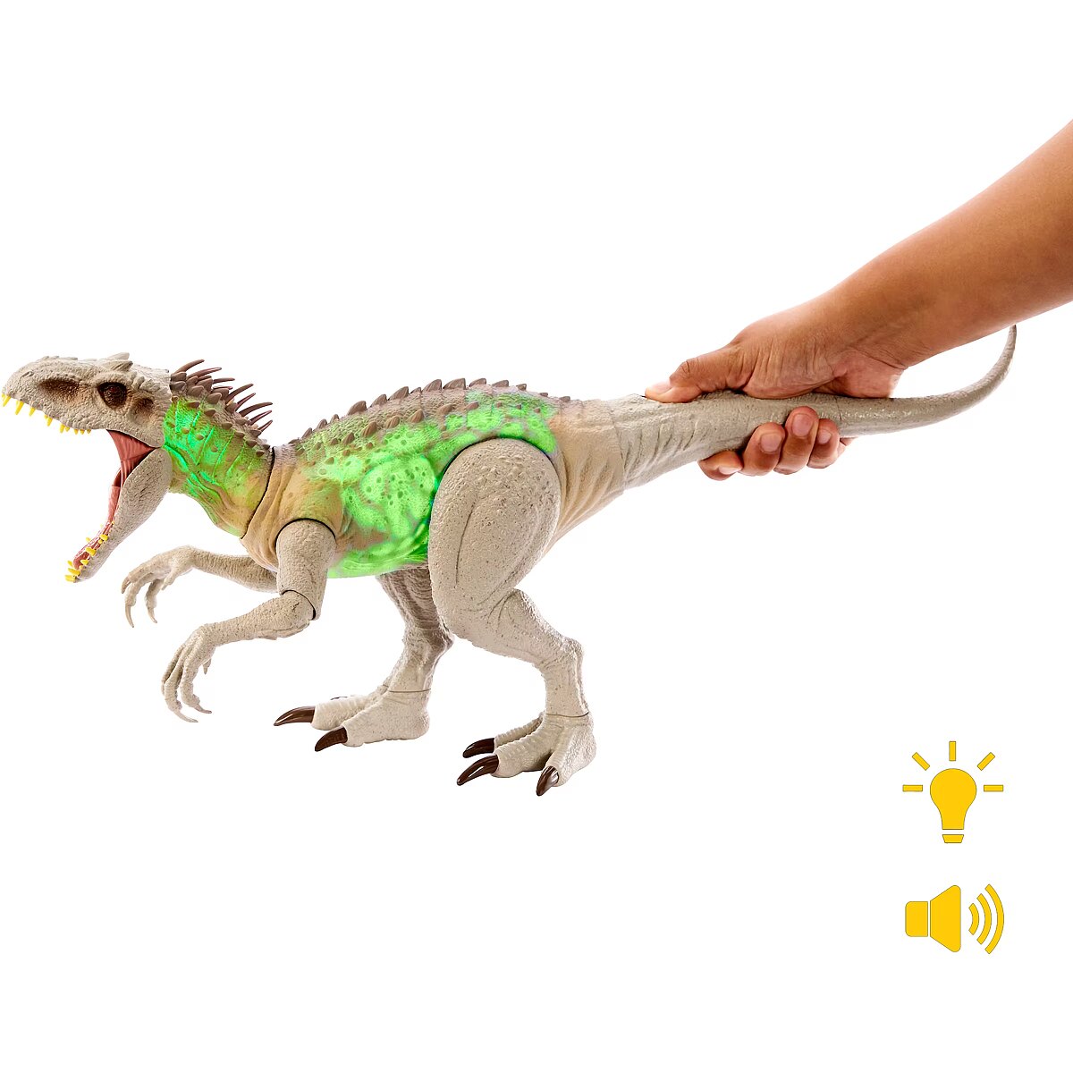 LongDesc - This Indominus rex dinosaur toy can Camouflage 'N Battle, with button-activated camo-style lighting that moves along its body! While blending into its habitat with jungle-style deco, the camouflage lighting and ROAR take it to the next level. This notorious Jurassic World villain hybrid dinosaur also has a wide chomping attack controlled by a button on its tail. Bring the dinosaur 'TO LIFE' using Augmented Reality! Scan the hidden Tracking Code in the free Jurassic World Facts App with a compatible smart device (Android or iOS, not included) to unlock AR experiences and games! Colours and decorations may vary.