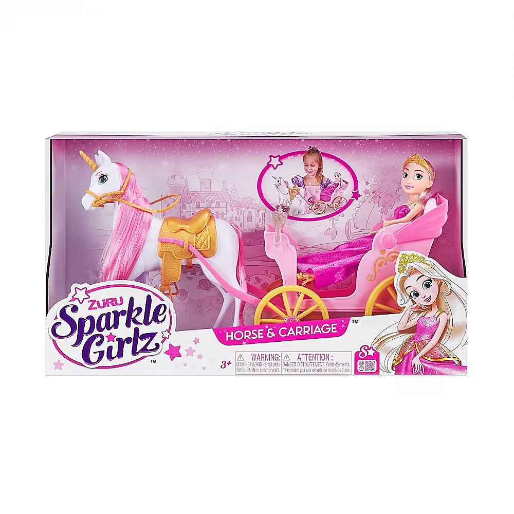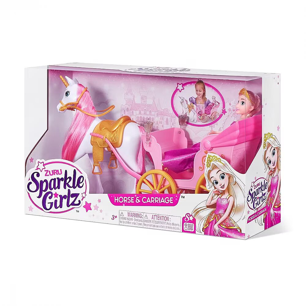 LongDesc - Sparkle Girlz Unicorn and Princess Doll with Carriage Set ZURUSparkle Girlz Unicorn and Carriage set is the perfect playset to build your very own Sparkle Kingdom! Meet the gorgeous Sparkle Girlz Princess with a sparkly long multi-layered pink dress, elegant high heel shoes and a glittery tiara. The princess comes with a gorgeous white unicorn with a pink mane and tail, pearlised hooves a pink horn, matching the princess’ tiara. Put the princess in her royal pink and gold carriage, covered in intricate designs and finished off with some spinning gold wheels. The Carriage is detachable from the unicorn’s saddle, allowing for even more play patterns. Both the princess and the unicorn have long silky hair perfect for brushing and styling, what intricate hair styles will you come up with? Join the princess in a world of magic with this Sparkle Girlz set! All outfits and accessories are interchangeable with other Sparkle Girlz dolls (sold separately). Sparkle every day at an amazing value too!