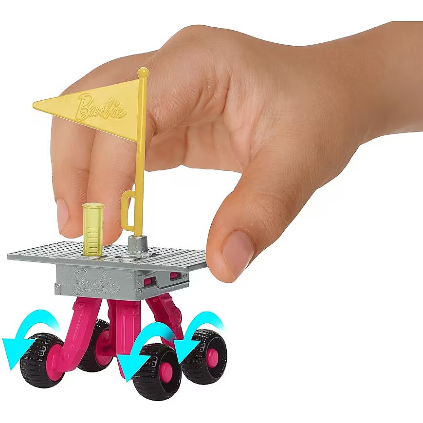 Accessories included - Barbie doll in space suit and boots Helmet with tilting face shield Pair of gloves Space rover Laptop Headset Flag Test tube Toothbrush Tube of toothpaste Space snack