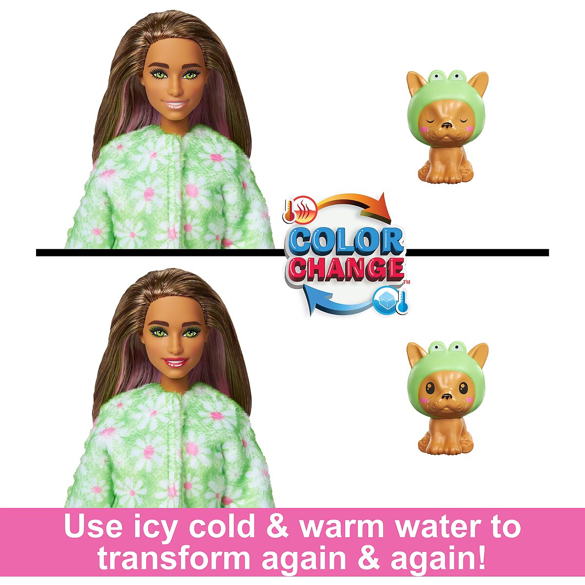 Description - Barbie Cutie Reveal animal costume-themed dolls offer the cutest unboxing experience with 10 surprises! Discover a Kitten in a Red Panda costume, a Dog as a Frog, a Teddy Bear as a Dolphin or a Bunny as a Koala. Remove the plush costume to reveal a posable Barbie doll with long, colorful hair. Discover more surprises to open like a pair of shoes, a purse and a matching mini pet. Reverse the plush top for a fleece jacket and flip the costume head for a pet bed. Icy cold water adds even more cuteness with color-change transformations on the doll's face and mini pet; warm water changes them back for repeat fun! Kids will love discovering -- and collecting -- all the cute surprises in this adorable Barbie Cutie Reveal series. Each doll sold separately, subject to availability. Dolls cannot stand alone. Colors and decorations may vary.