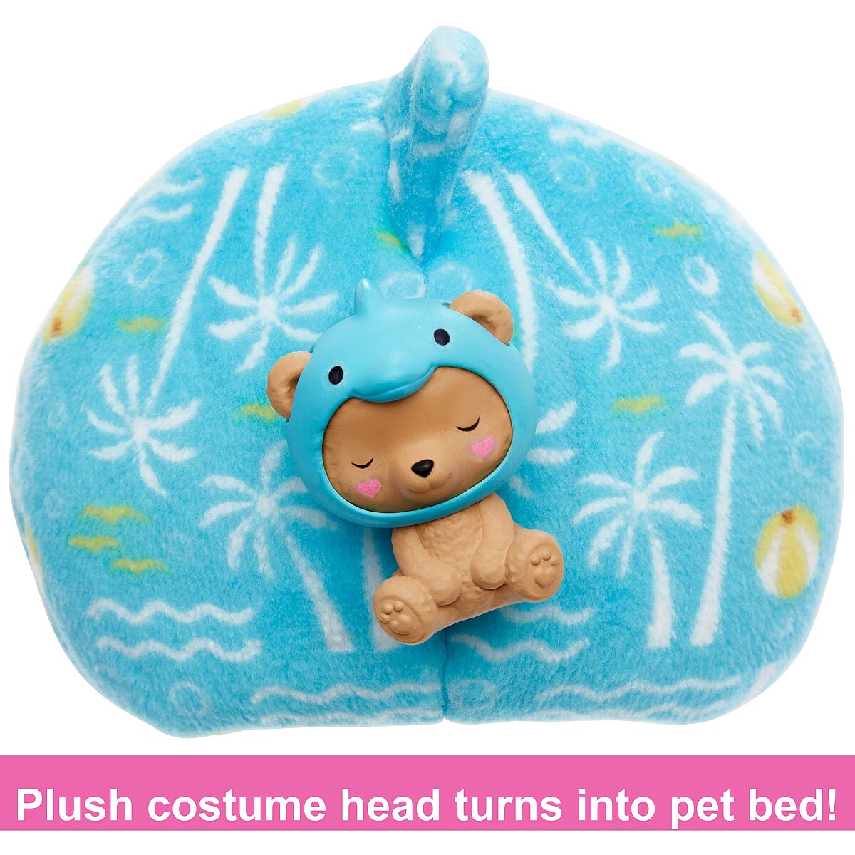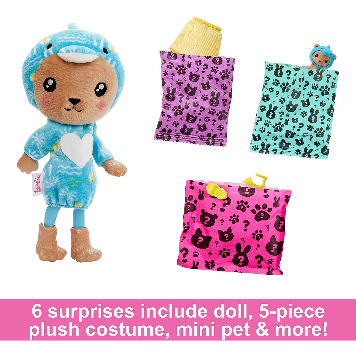LongDesc - Barbie Cutie Reveal costume-themed series Chelsea dolls offer the cutest unboxing experience with six surprises! Discover a Kitten in a Red Panda costume, a Dog as a Frog, a Teddy Bear as a Dolphin or a Bunny as a Koala. Remove the plush costume to reveal a Chelsea doll. Which doll will you reveal? Get cozier with more surprises like a skirt and mini pet that matches the doll's costume. Flip the plush top for an over-sized jacket and the costume head for a pet bed. Icy cold water adds even more cuteness with colour-change transformation on the mini pet; warm water changes it back for repeat fun! Kids will love discovering all the surprises in this cozy cute Barbie Cutie Reveal series. Each doll sold separately, subject to availability. Dolls cannot stand alone. Colours and decorations may vary.
