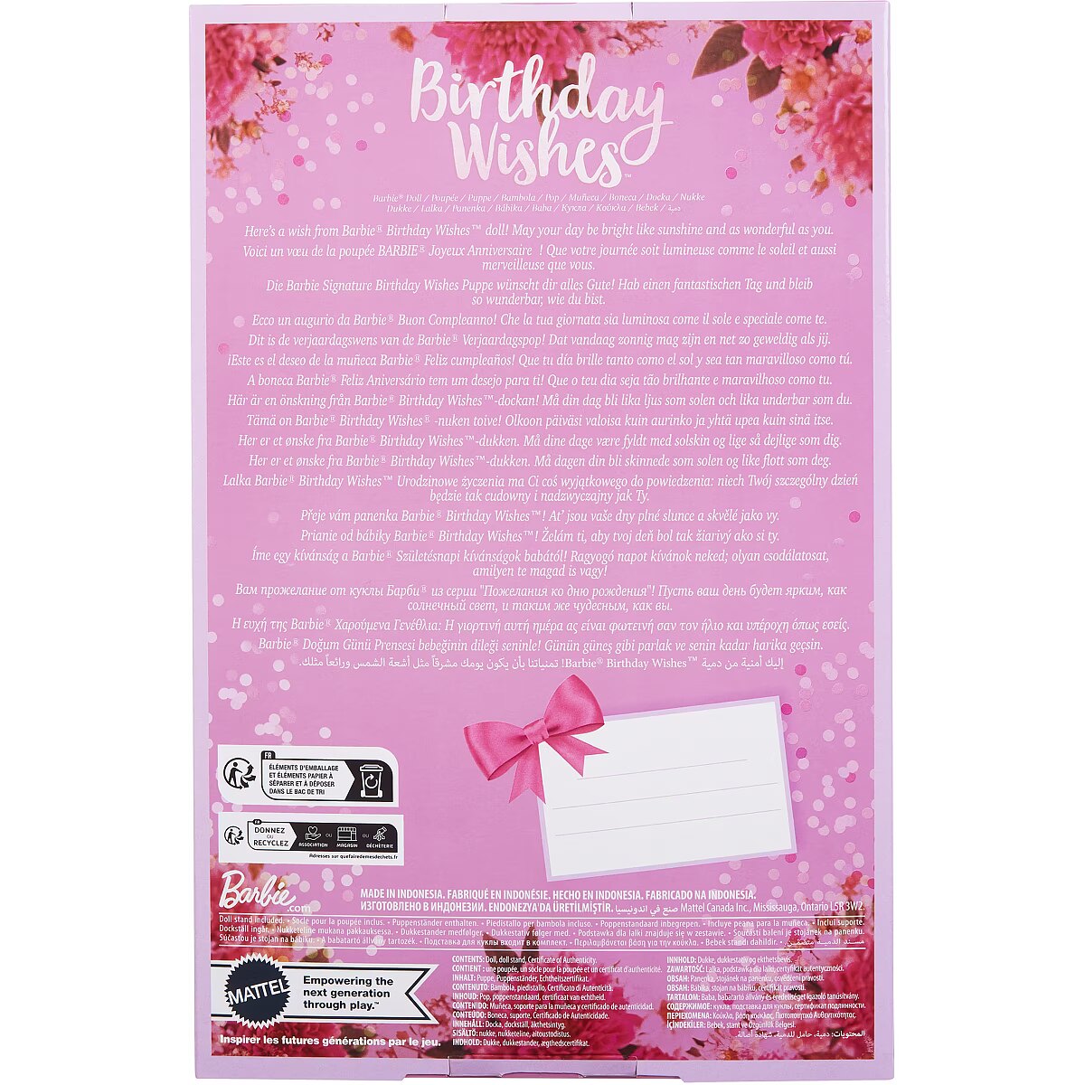 LongSummaryDescription - Barbie Signature Birthday Wishes Doll. Doll type: Fashion doll, Doll's gender: Female, Recommended age (min): 6 yr(s), Suggested gender: Girl. Height: 330.2 mm. Material: Fabric, Plastic, Product colour: Multicolour