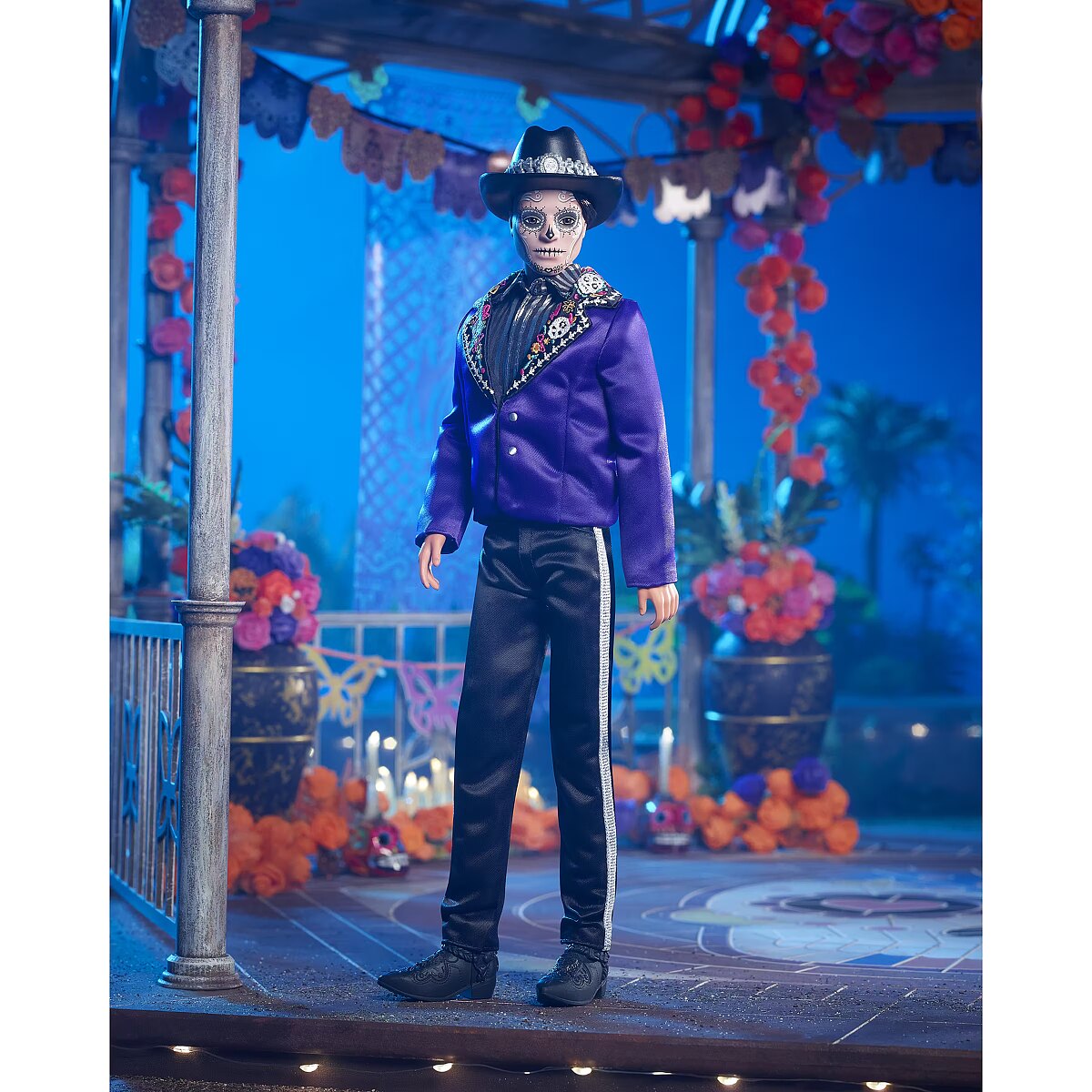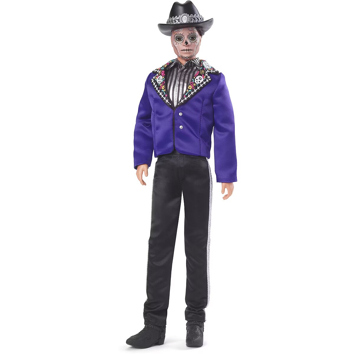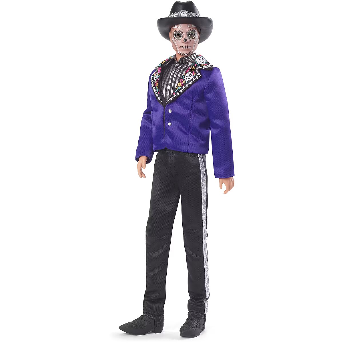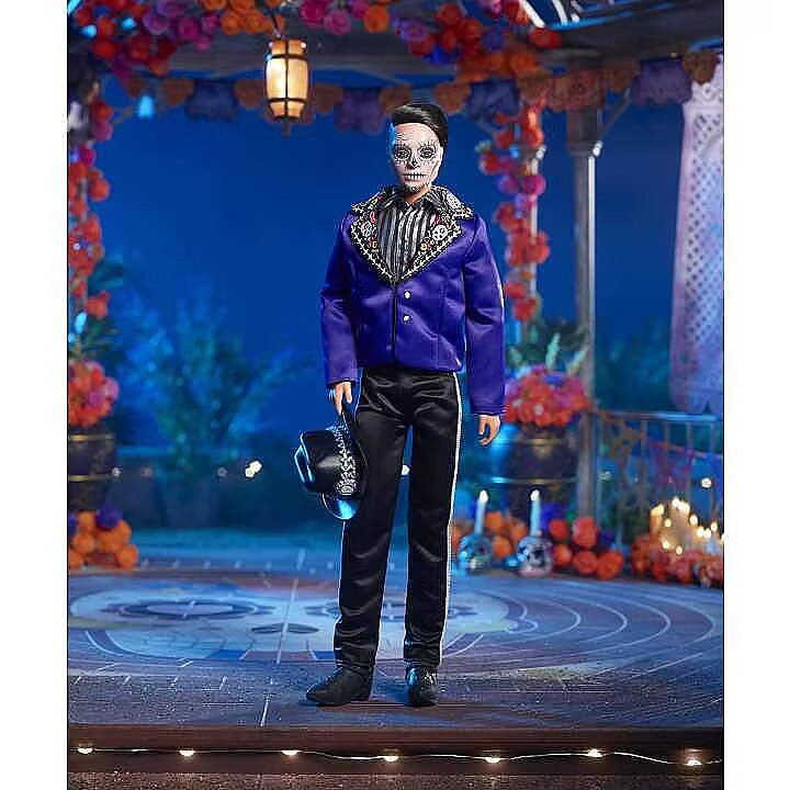 LongDesc - The Barbie Día De Muertos series honors the customs, symbols and rituals often seen throughout the festive time of remembrance. Ken doll is strikingly handsome in a blue jacket with embroidered bone detail at the lapels. A sugar skull-accented hat frames his calavera face paint. May the 2023 Día De Muertos Ken doll become a treasured holiday tradition! Includes doll stand and Certificate of Authenticity. Doll cannot stand alone. Colours and decorations may vary.