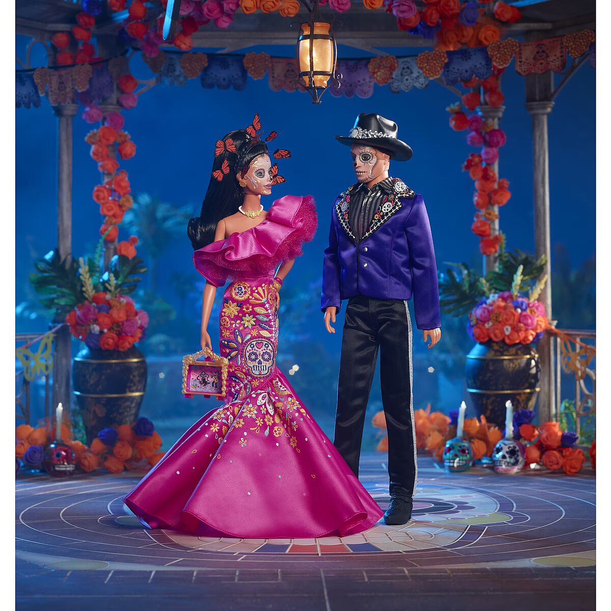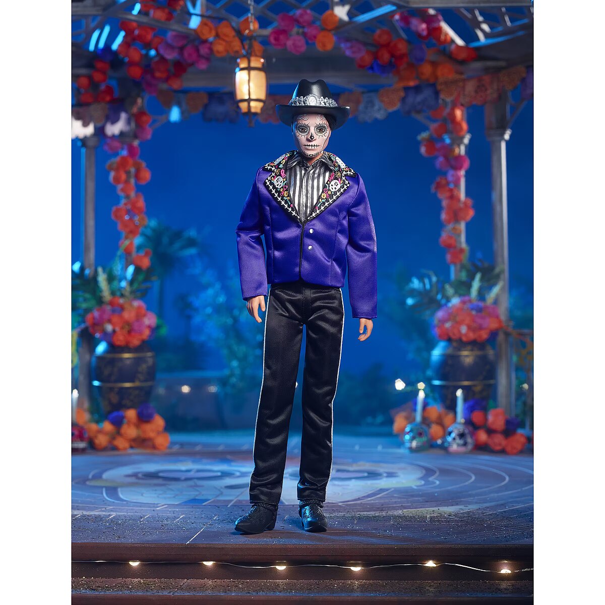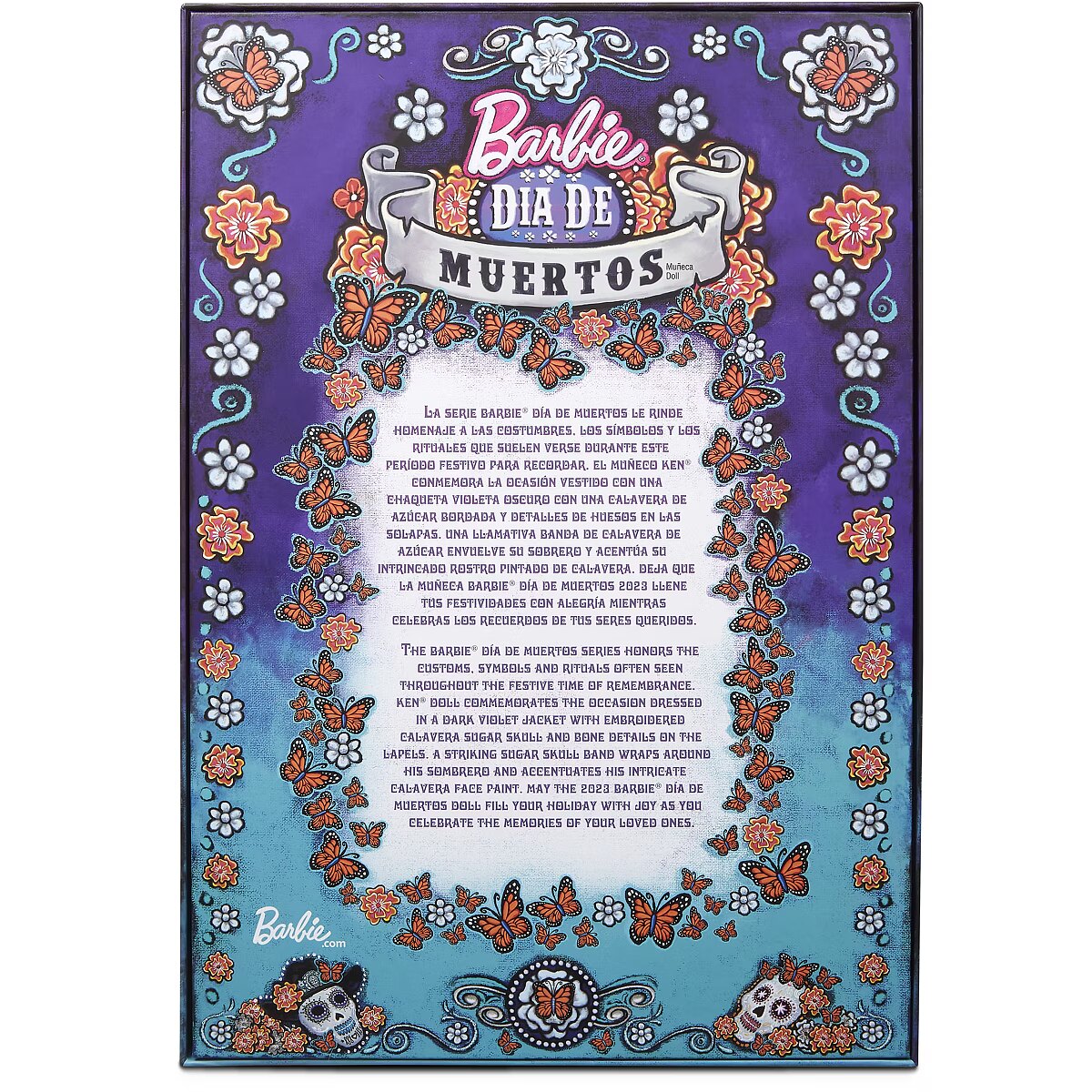 LongDesc - The Barbie Día De Muertos series honors the customs, symbols and rituals often seen throughout the festive time of remembrance. Ken doll is strikingly handsome in a blue jacket with embroidered bone detail at the lapels. A sugar skull-accented hat frames his calavera face paint. May the 2023 Día De Muertos Ken doll become a treasured holiday tradition! Includes doll stand and Certificate of Authenticity. Doll cannot stand alone. Colours and decorations may vary.