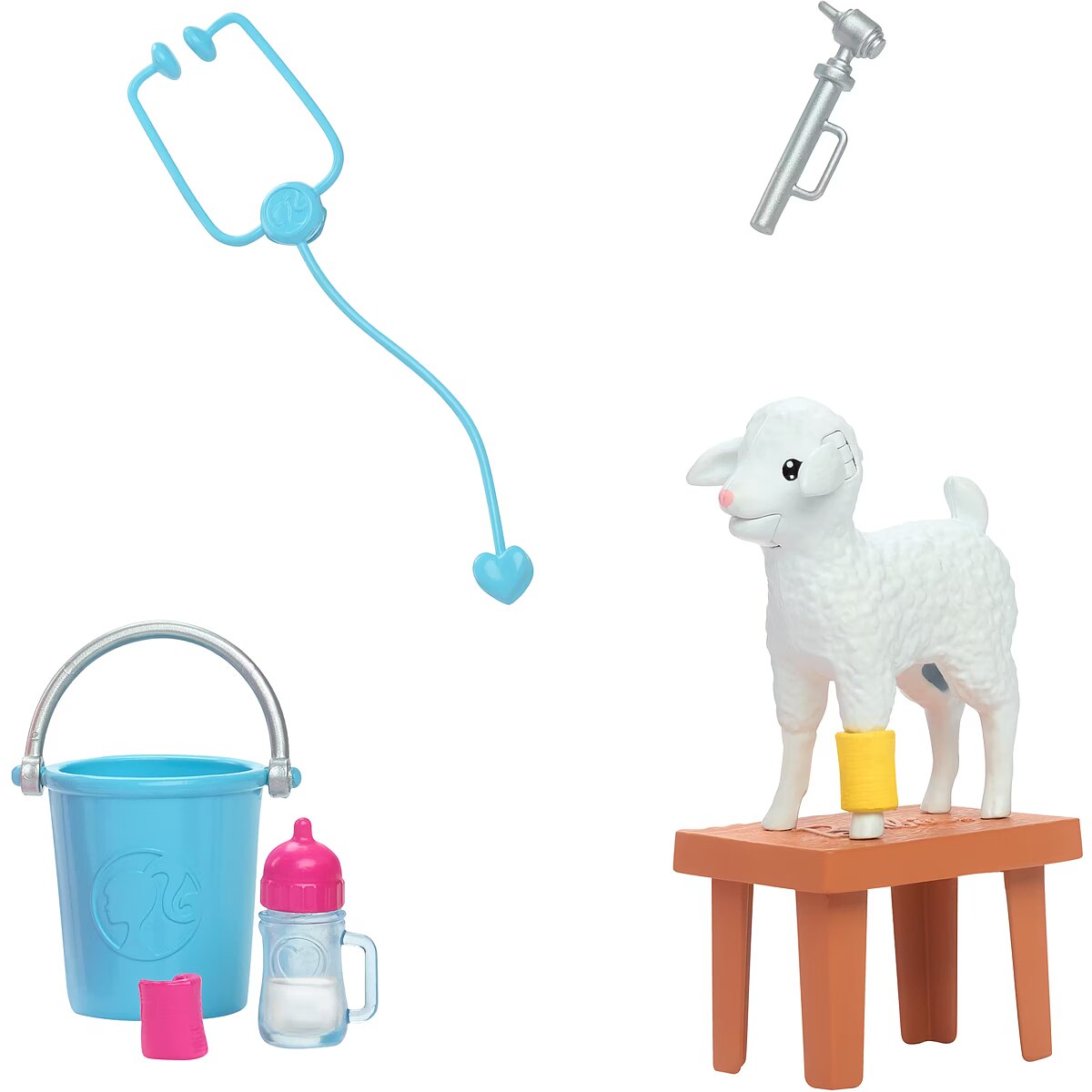 Packaging content - Packaging content - Includes 1 farm vet doll wearing 1-piece overalls and boots, 1 lamb figure with moving ears, 1 bench, 1 medicine bottle, 1 pail, 1 stethoscope, 1 reflex hammer, 1 clipboard, 1 hay bale, 1 blanket and 2 casts.