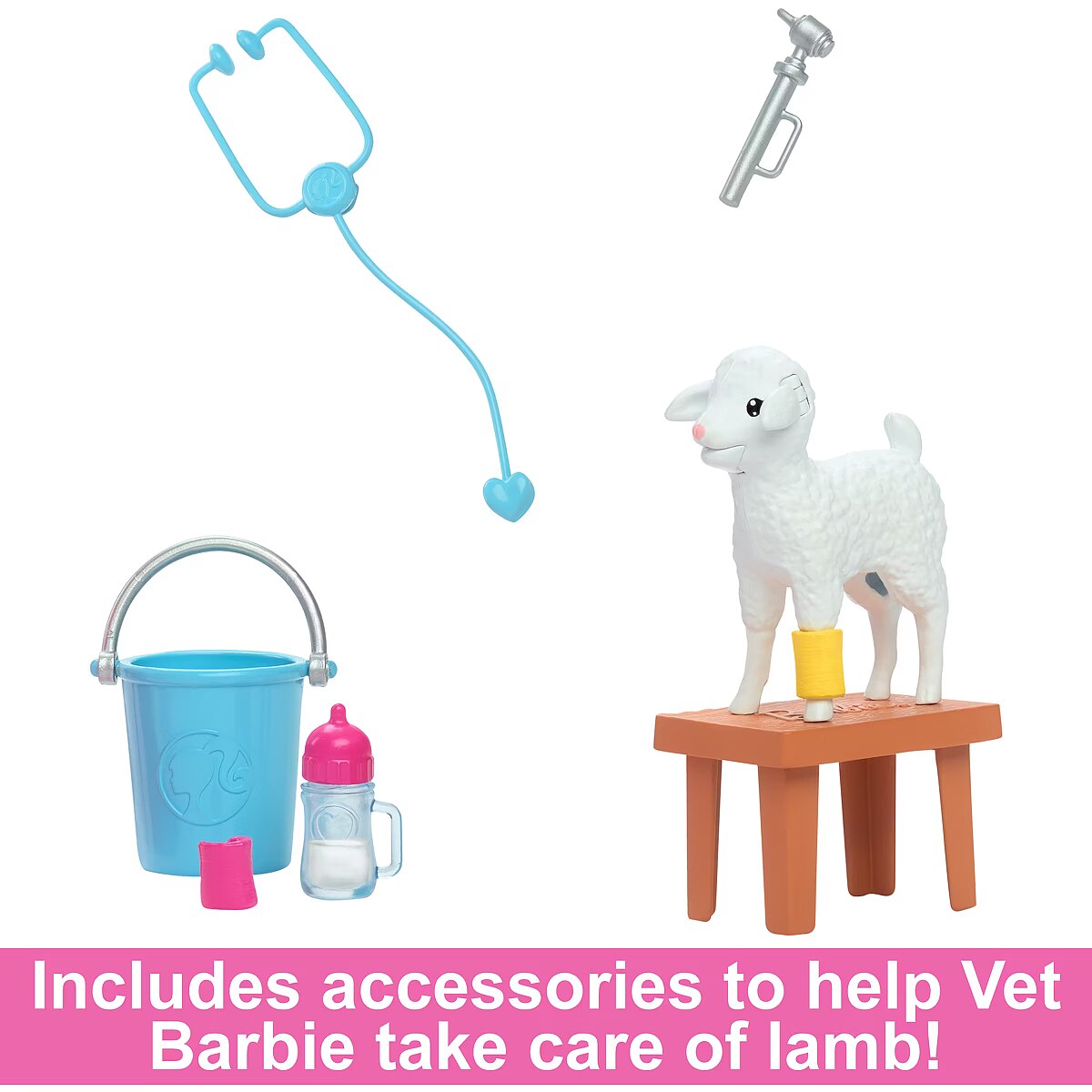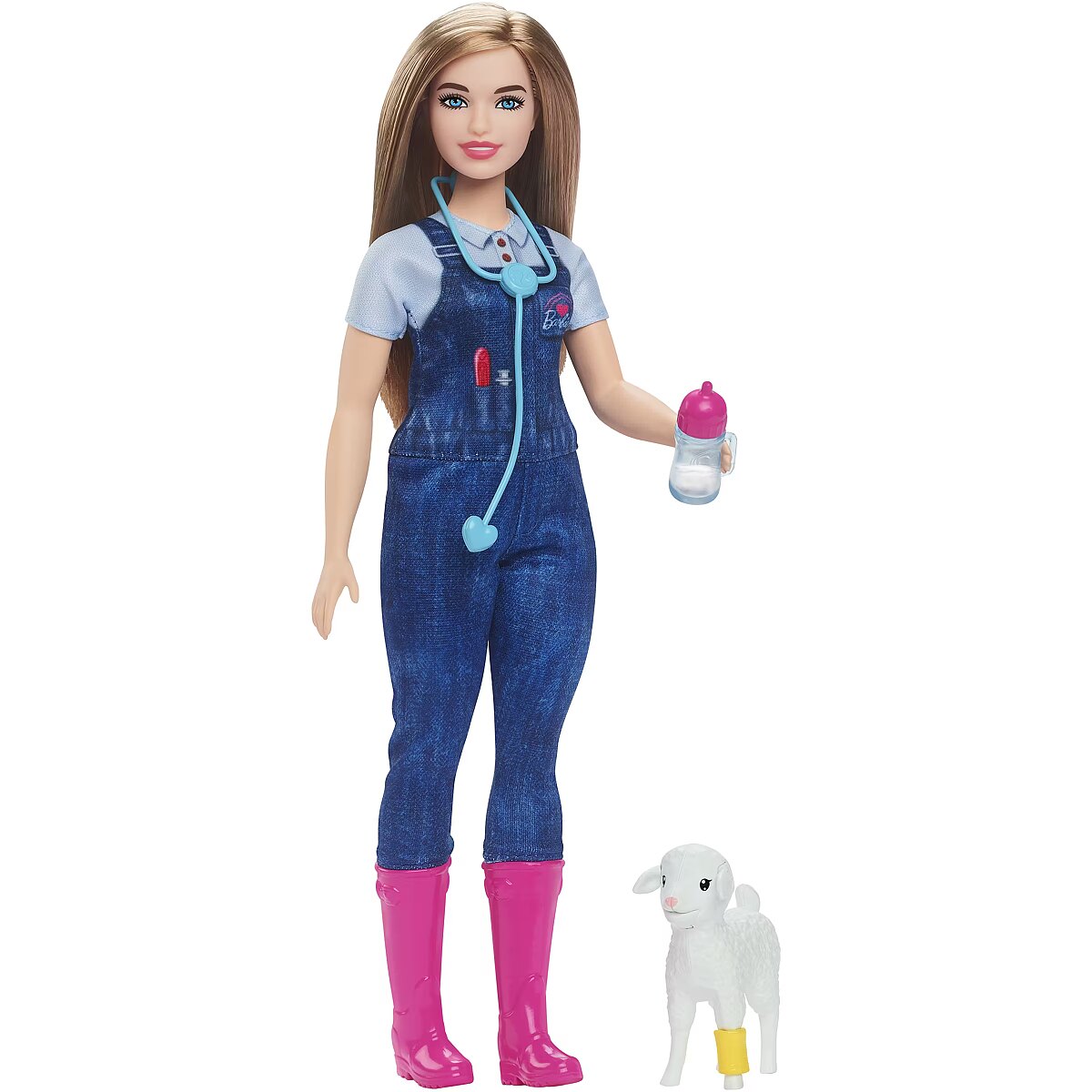 LongDesc - Celebrate Barbie doll's 65th anniversary with a collection of fashion dolls highlighting fan-favourite careers like this farm vet set. Barbie doctor doll wears a professional outfit with iconic pink boots and comes with 10 themed accessories, including a lamb with interactive wiggling ears! Kids can role-play and dream big -- collectors will want them all! Each doll sold separately, subject to availability. Dolls cannot stand alone. Colours and decorations may vary.