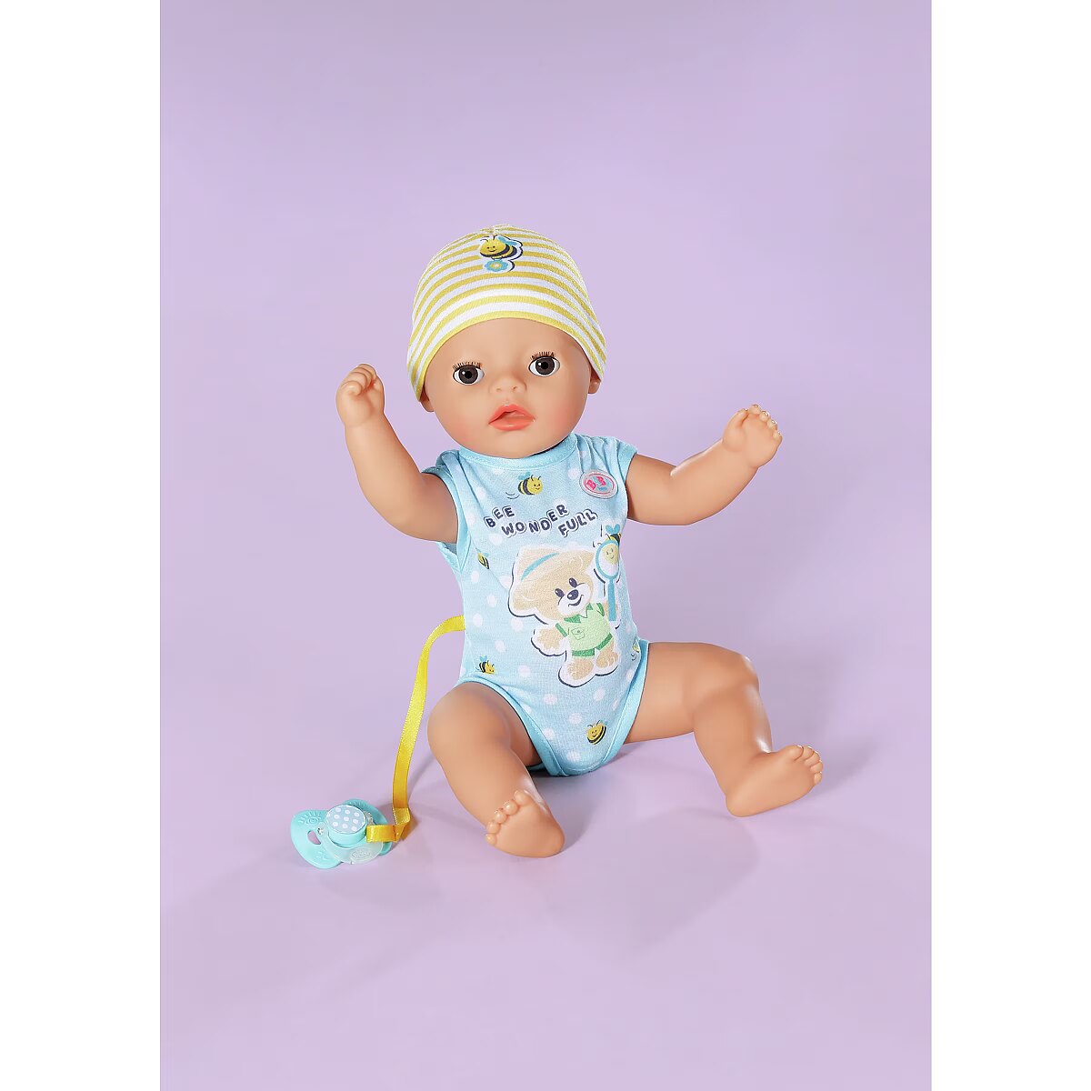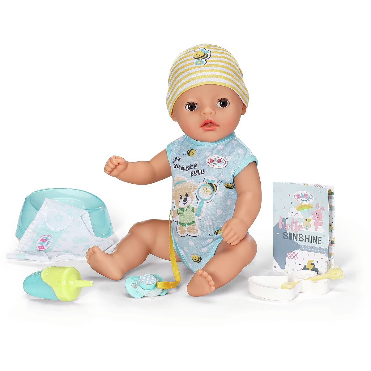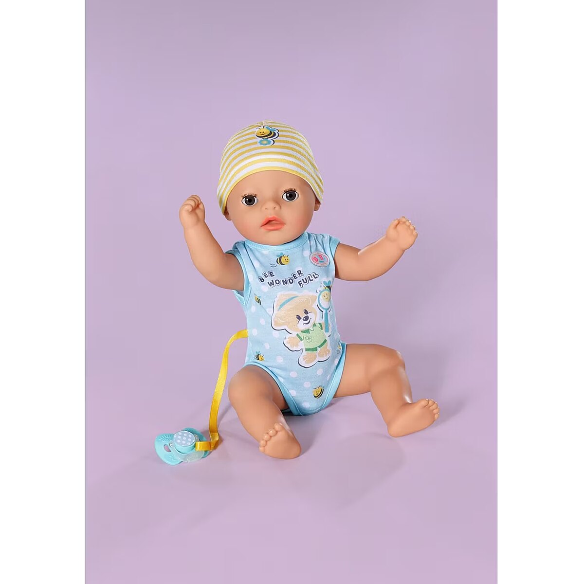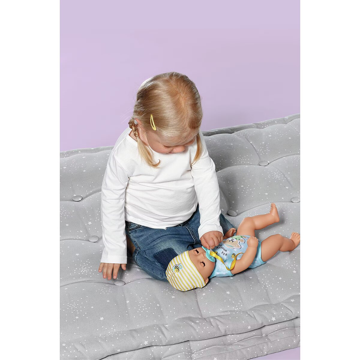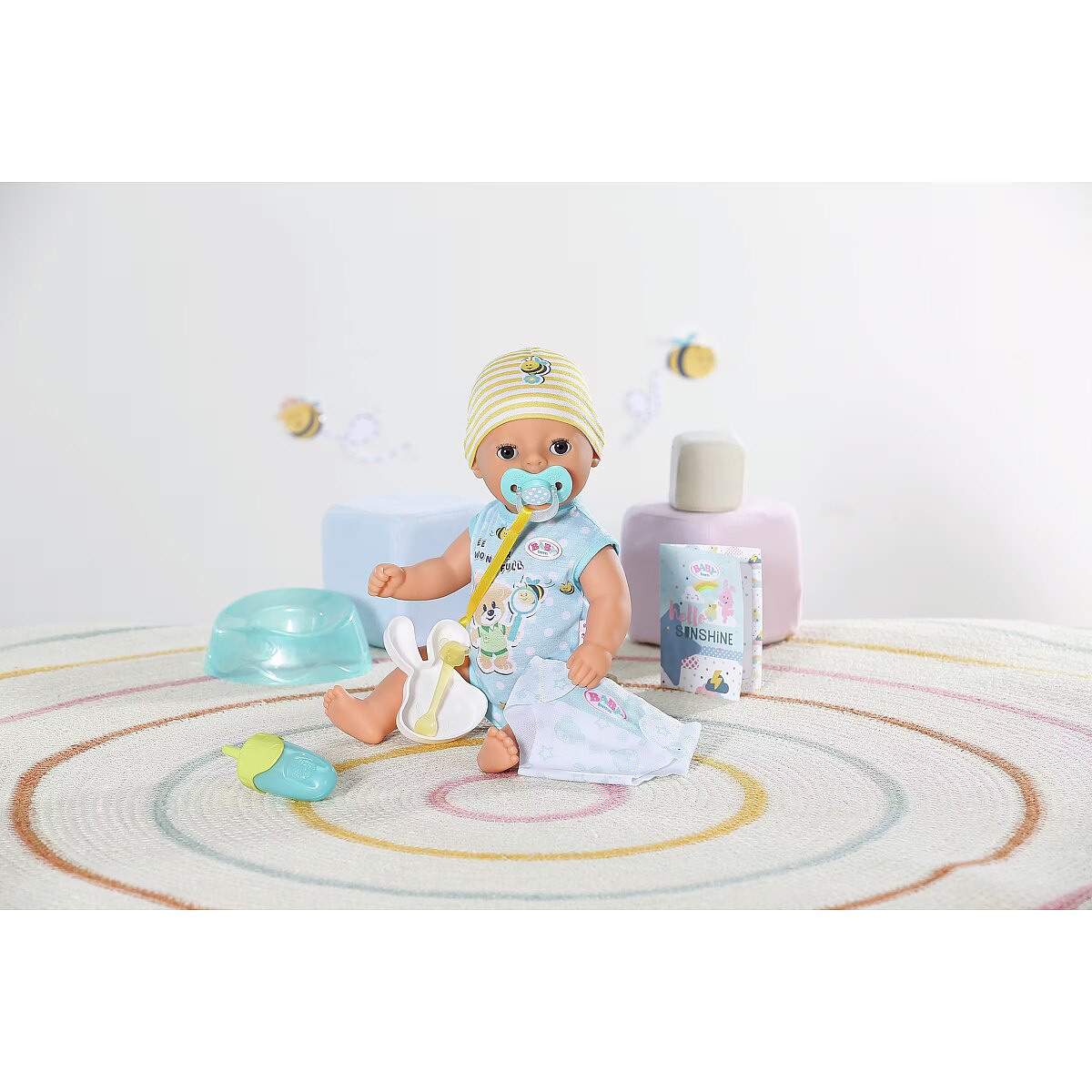 LongDesc - BABY born Little Baby Boy has 7 great functions that all work without batteries. He comes with everything he needs for this. He can drink water from his bottle, change his nappy or go on his blue potty. If you give him the dummy and turn it to the left, he closes his eyes; if you turn it to the right, he opens his eyes. If you put him to sleep in his cot, he closes his eyes even without a dummy. His arms, legs and head are super manoeuvrable and make dressing and undressing him child's play. At 36 cm, it is suitable for smaller children's hands from the age of one and is the perfect doll for starting out with varied baby play. They can even sit on the potty together and playfully help your child to get dry.
