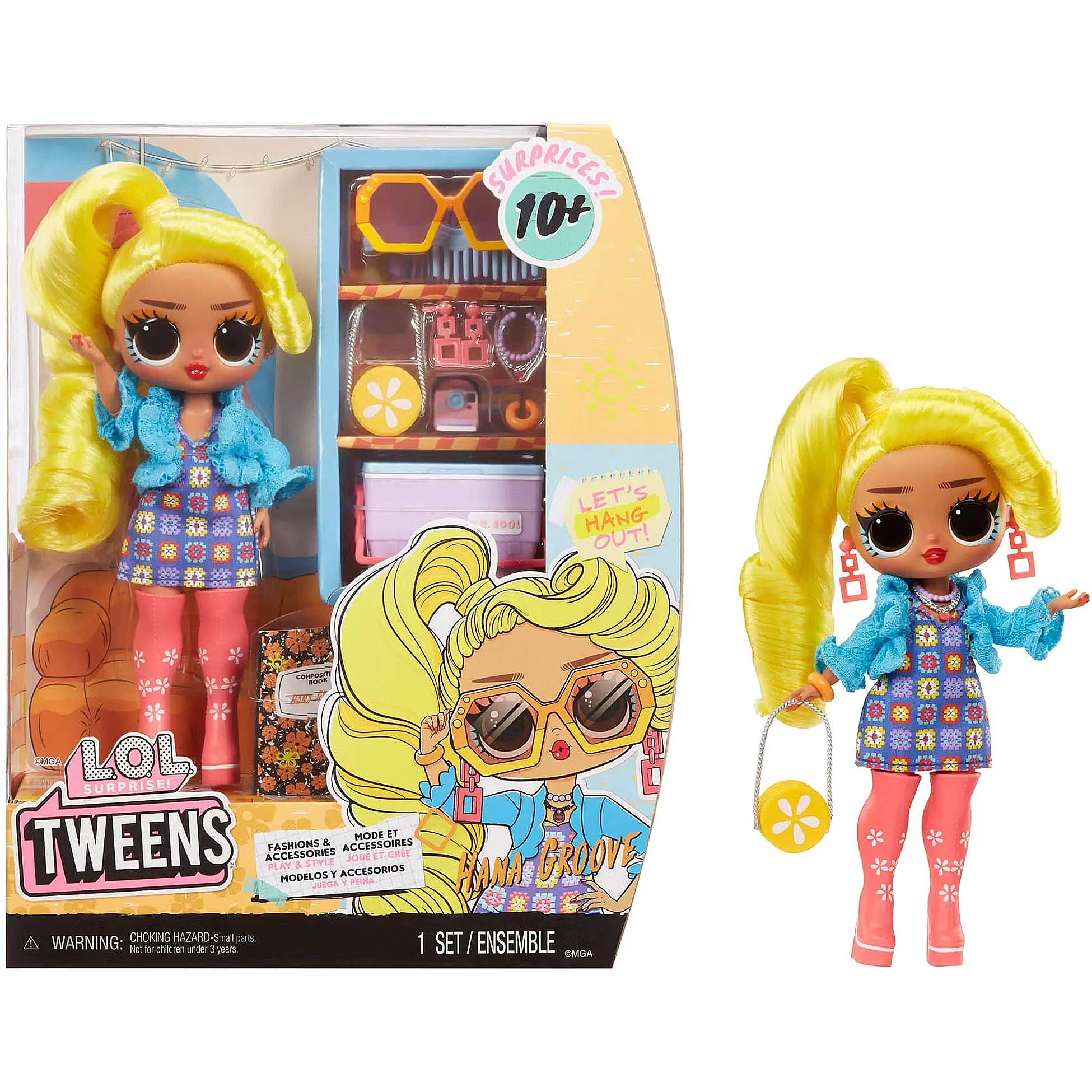LongDesc - I’m in Be Tween, but right where I wanna be. Full of surprises & unique style. Look out world, cuz here I come.Introducing the all-new L.O.L. Surprise Tweens fashion doll Hana Groove, a fan of retro style and record stores! Unbox 10+ surprises and get to know Hana Groove who loves adding to her record collection and is always ready to groove. As the life of the party, she enjoys inviting her BFFs to hang out, especially on a sunny day! Dress Hana Groove in her beautiful fashions inspired by the 70s including her stylish crocheted dress and her pink knee-high boots that were made for walkin’. Her love for a sunshine-y day can be seen in her flower print purse and trendy sunglasses! Her outfit also includes a cropped jacket with frilly embellishments, square earrings, an adorable bracelet, and cool, layered necklaces! She also comes with a cute cooler that makes the best accessory to any picnic or dance party, along with an adorable polaroid camera ready to capture every moment. She has stunning features, beautiful hair, her own fabulous style, and comes articulated for tons of posing opportunities. Each box includes a L.O.L. Surprise Tweens fashion doll, unique fashions, boots, purse, sunglasses, accessories, cooler, camera, and hairbrush. Collect all L.O.L. Surprise Tweens fashion dolls: Ellie Fly, Hana Groove, Flora Moon, and Cassie Cool! L.O.L. Surprise fashion dolls with stylish hair, outfits and many detailed accessory pieces make a perfect toy for kids, including 4 years old and up for imaginative pretend play! As gifts for any special occasion, dolls provide hours of social play with siblings and friends! From MGA Entertainment, creators of L.O.L. Surprise fashion and collectible dolls, Rainbow High™ fashion dolls, Na Na Na Surprise dolls, Bratz® fashion dolls, MGA's Dream Ella™, MGA's Glitter Babyz™, Lalaloopsy™, Baby Born® Surprise baby dolls and collectibles, Little Tikes® kids' toys and many other favorite brands.