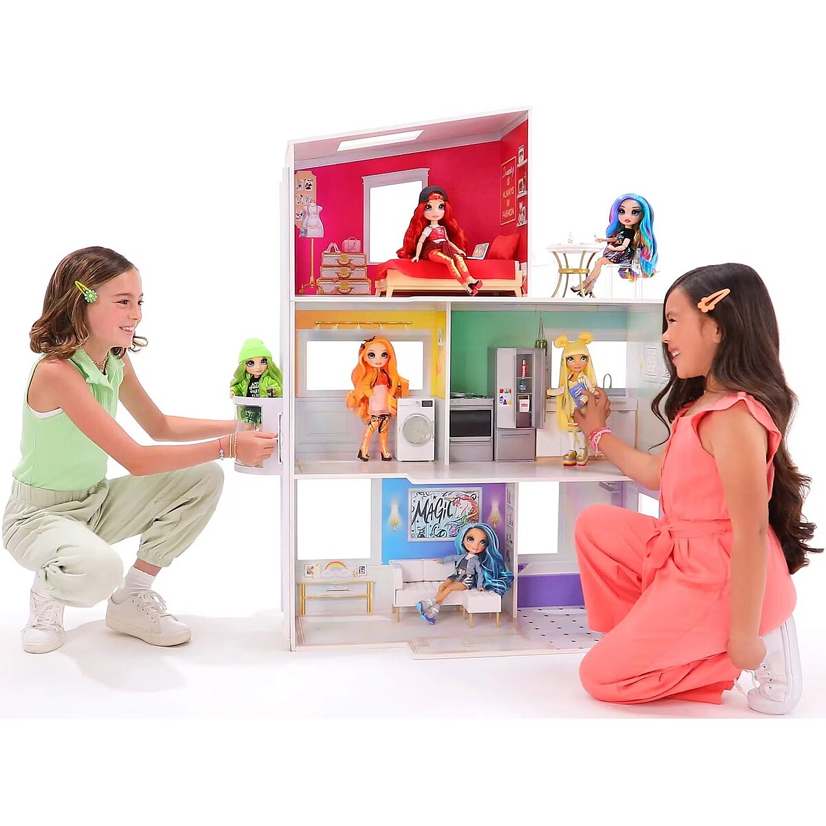 LongDesc - The Rainbow High Townhouse is a 3-Story Wood Doll House Playset that inspires creativity. This colorful, fully furnished modern house is the place for your Rainbow High fashion dolls to live and make all their creative dreams come true.