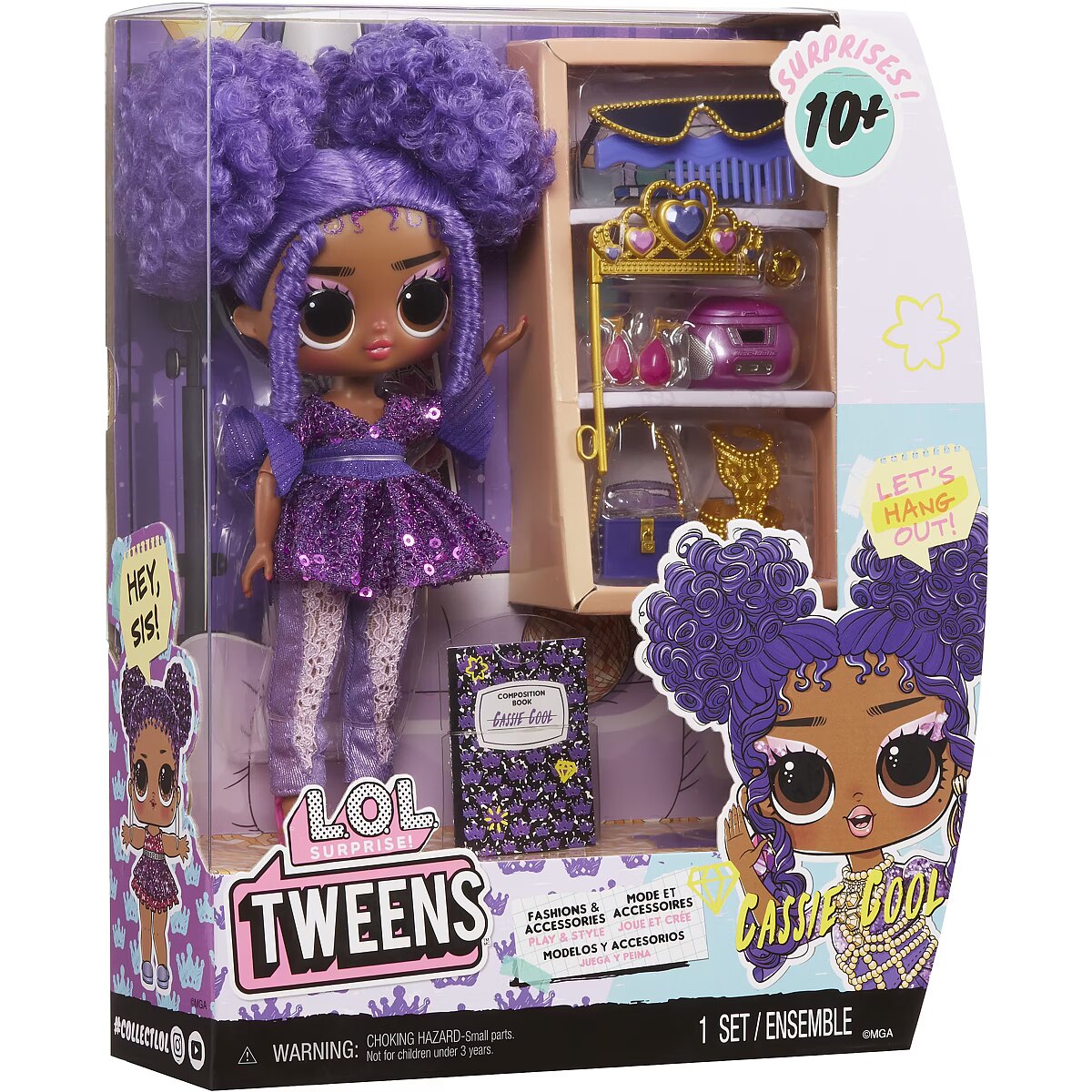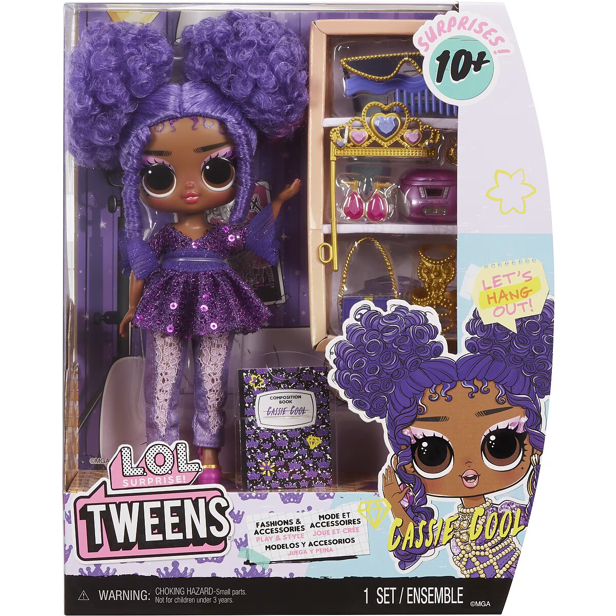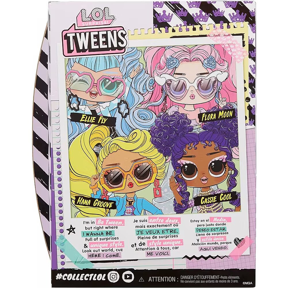 LongDesc - I’m in Be Tween, but right where I wanna be. Full of surprises & unique style. Look out world, cuz here I come.Introducing the all-new L.O.L. Surprise Tweens fashion doll Cassie Cool, a rock star in the making! Unbox 10+ surprises and get to know Cassie Cool, with her ear to the beat and her style made for the stage, she’s always coming up with the coolest new lyrics. Cassie Cool has star power and the confidence to back it! She loves to jam out and dress all in purple in her glamorous dress with her pearl body chain and lace designed pants! She reps her love for purple in everything she wears including her purple studded purse and crystal sunglasses! Her outfit also includes fabulous shoes, droplet-shaped earrings, and a princess crown prop! She also has an adorable throwback CD player to listen to all her favorite albums. She has stunning features, beautiful purple hair she loves to wear in stylish buns, her own fabulous style, and comes articulated for tons of posing opportunities. Each box includes a L.O.L. Surprise Tweens fashion doll, unique fashions, shoes, purse, sunglasses, accessories, CD player, princess crown prop, and hairbrush. Collect all L.O.L. Surprise Tweens fashion dolls: Ellie Fly, Hana Groove, Flora Moon, and Cassie Cool! L.O.L. Surprise fashion dolls with stylish hair, outfits and many detailed accessory pieces make a perfect toy for kids, including 4 years old and up for imaginative pretend play! As gifts for any special occasion, dolls provide hours of social play with siblings and friends! From MGA Entertainment, creators of L.O.L. Surprise fashion and collectible dolls, Rainbow High™ fashion dolls, Na Na Na Surprise dolls, Bratz® fashion dolls, MGA's Dream Ella™, MGA's Glitter Babyz™, Lalaloopsy™, Baby Born® Surprise baby dolls and collectibles, Little Tikes® kids' toys and many other favorite brands.
