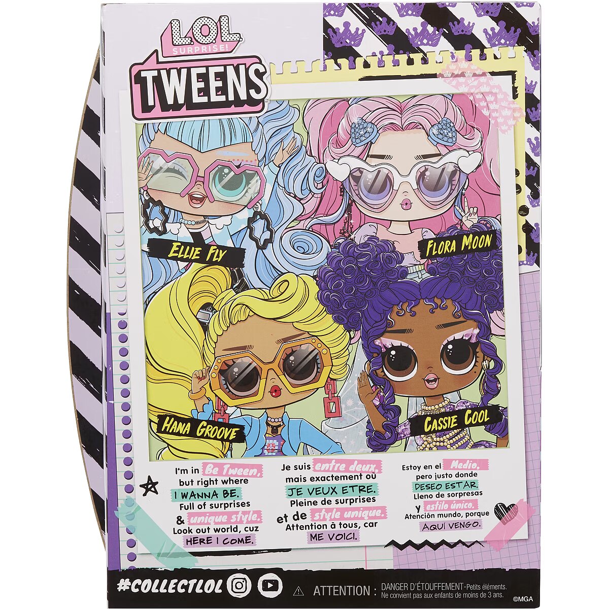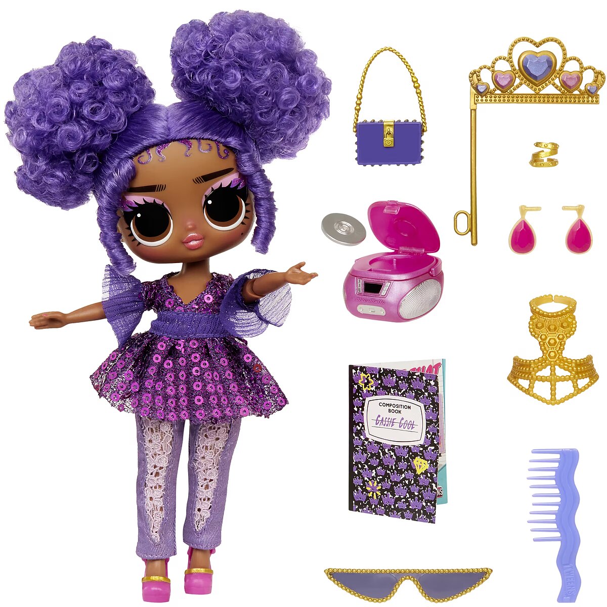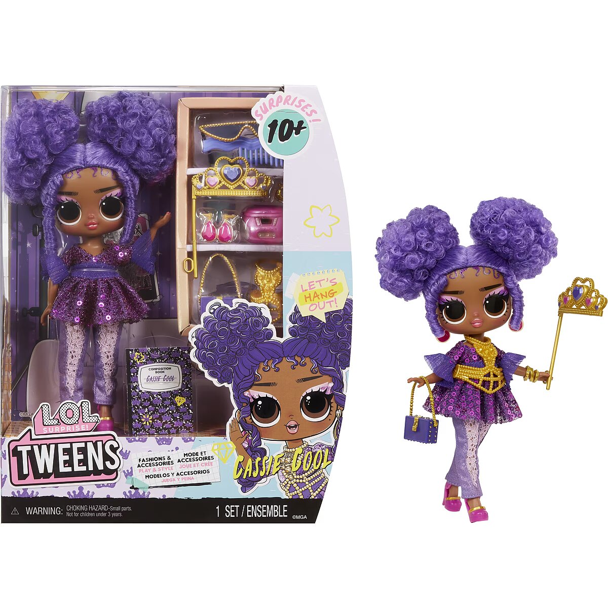 LongDesc - I’m in Be Tween, but right where I wanna be. Full of surprises & unique style. Look out world, cuz here I come.Introducing the all-new L.O.L. Surprise Tweens fashion doll Cassie Cool, a rock star in the making! Unbox 10+ surprises and get to know Cassie Cool, with her ear to the beat and her style made for the stage, she’s always coming up with the coolest new lyrics. Cassie Cool has star power and the confidence to back it! She loves to jam out and dress all in purple in her glamorous dress with her pearl body chain and lace designed pants! She reps her love for purple in everything she wears including her purple studded purse and crystal sunglasses! Her outfit also includes fabulous shoes, droplet-shaped earrings, and a princess crown prop! She also has an adorable throwback CD player to listen to all her favorite albums. She has stunning features, beautiful purple hair she loves to wear in stylish buns, her own fabulous style, and comes articulated for tons of posing opportunities. Each box includes a L.O.L. Surprise Tweens fashion doll, unique fashions, shoes, purse, sunglasses, accessories, CD player, princess crown prop, and hairbrush. Collect all L.O.L. Surprise Tweens fashion dolls: Ellie Fly, Hana Groove, Flora Moon, and Cassie Cool! L.O.L. Surprise fashion dolls with stylish hair, outfits and many detailed accessory pieces make a perfect toy for kids, including 4 years old and up for imaginative pretend play! As gifts for any special occasion, dolls provide hours of social play with siblings and friends! From MGA Entertainment, creators of L.O.L. Surprise fashion and collectible dolls, Rainbow High™ fashion dolls, Na Na Na Surprise dolls, Bratz® fashion dolls, MGA's Dream Ella™, MGA's Glitter Babyz™, Lalaloopsy™, Baby Born® Surprise baby dolls and collectibles, Little Tikes® kids' toys and many other favorite brands.