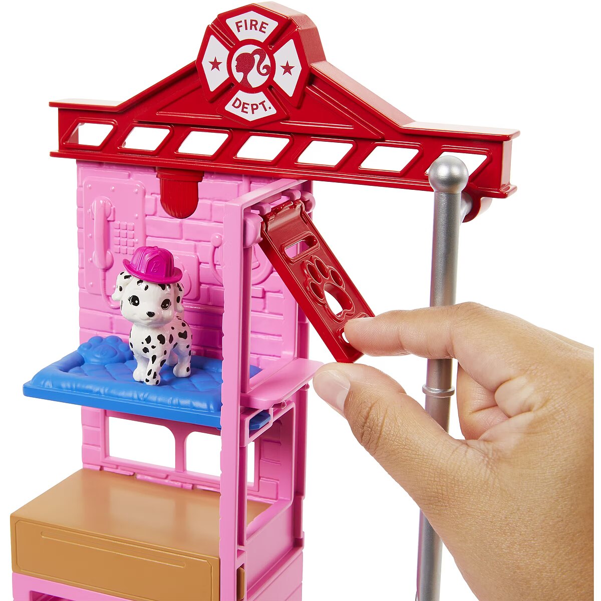 Description - Lalka strażaczka Barbie z zestawem strażackim pozwoli dzieciom wyzwolić ich wewnętrznego bohatera. Odegraj akcję ratowania kotka na drzewie lub ugaś pożar za pomocą interaktywnych elementów, takich jak ogień zmieniający kolor, drzewo z otworami na kołki, czy gaśnica, która zimną wodą ugasi pożar! Ubrana w mundur i trzymająca megafon lalka strażacka Barbie jest gotowa wyruszyć ze stacji ze swoim dalmatyńczykiem u boku - szczeniak może zjechać z masztu strażackiego. Dzieci w wieku 3 lat i starsze pokochają nieskończone możliwości bohaterskiej ekspresji!  Lalka nie może stać sama. Kolory i dekoracje mogą się różnić.
