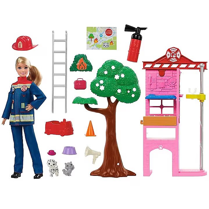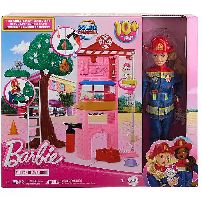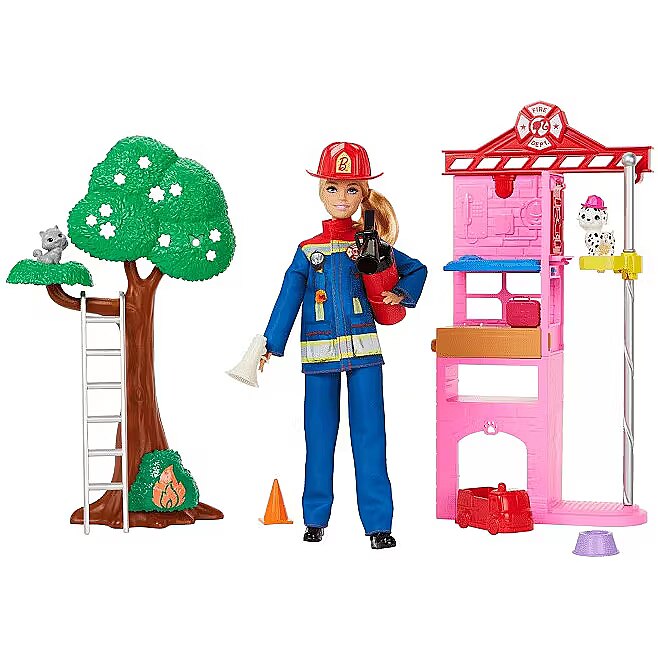 LongDesc - Barbie firefighter doll lets kids bring their inner heroes out with a fire station playset and more than 10 pieces to help save the day. Play out the rescue of a kitten in a tree or fight a fire with interactive pieces like a colour-change fire piece, a tree with peg-holes and a fire extinguisher squirt toy -- cold water puts out the fire! Wearing her uniform and carrying a bullhorn, Barbie firefighter doll is ready to head out from the station with her pet Dalmatian by her side -- the puppy can ride down the firepole and take its small firetruck to the rescue for role-play fun. Kids 3 years old and up will love the endless possibilities for heroic expression and storytelling dreams! Doll cannot stand alone. Colours and decorations may vary.