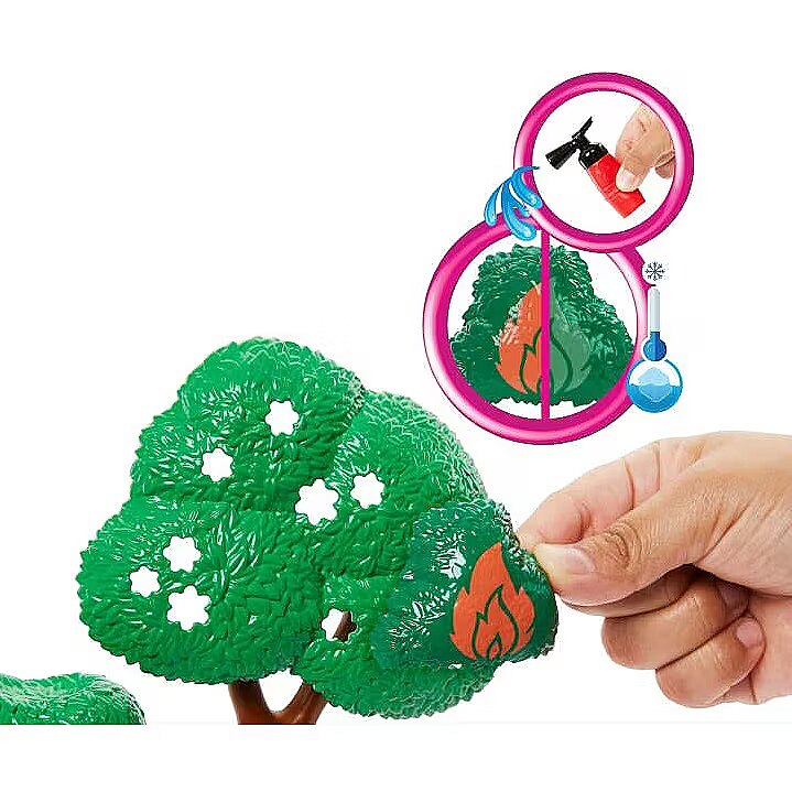 Accessories included - Lalka Barbie ubrana w dwuczęściowy mundur strażaka, czapkę i buty Remiza strażacka 2 figurki zwierząt Drzewo Element zmieniający kolor w kształcie ognia Drabina 8 dodatkowych akcesoriów