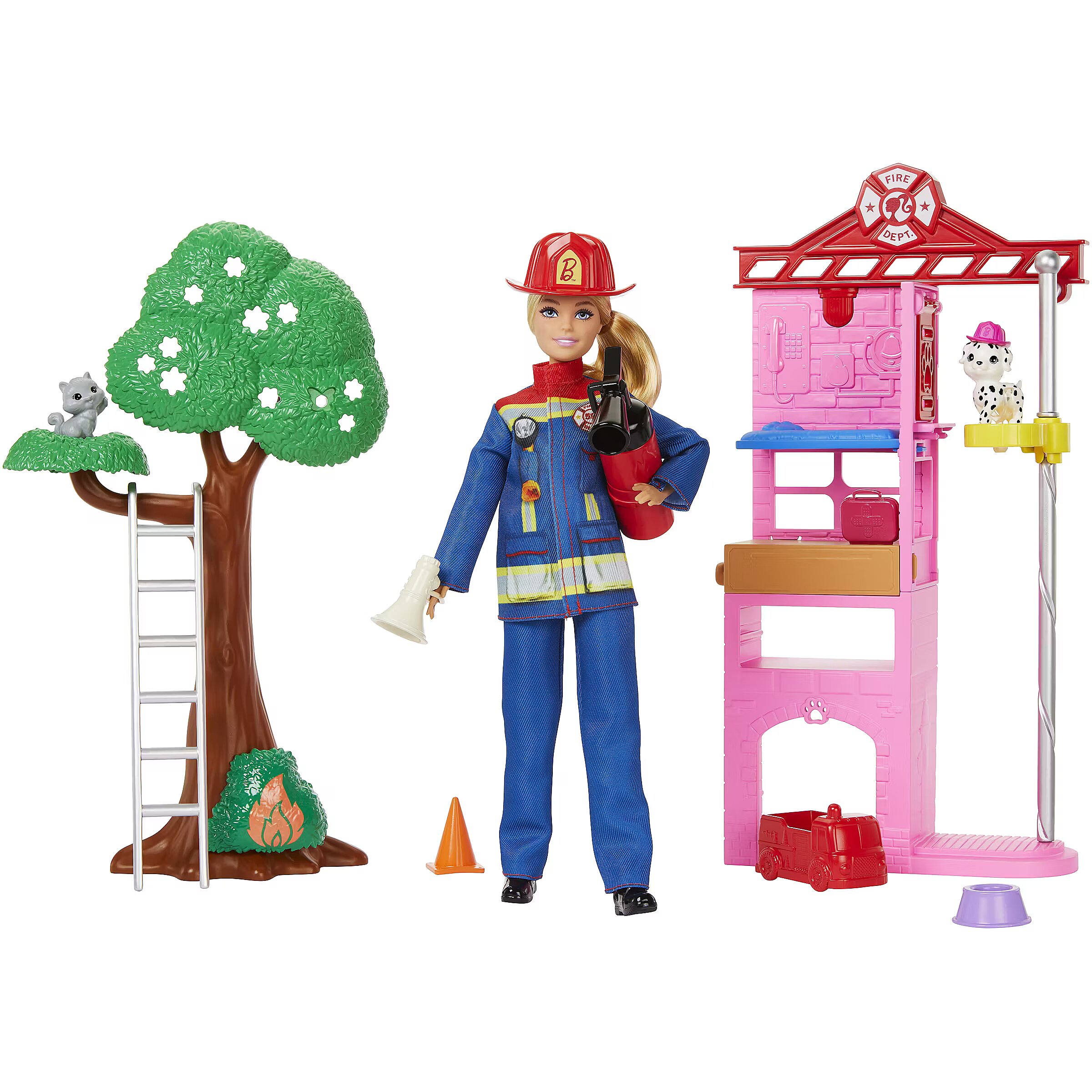 Packaging content - Packaging content - Incudes 1 Barbie doll wearing a 2-piece firefighter uniform, hat and shoes, plus fire station playset, 2 pet figures, 1 tree, 1 colour-change fire piece, 1 ladder and 8 additional accessories. Doll cannot stand alone. Colours and decorations may vary.