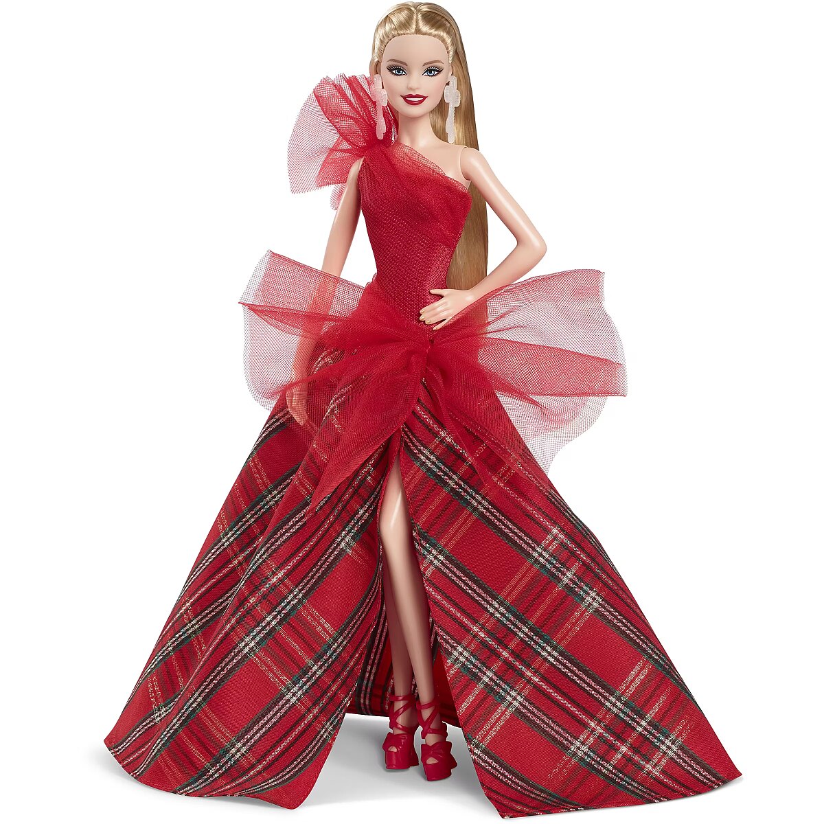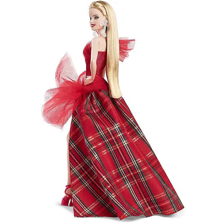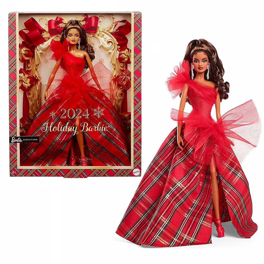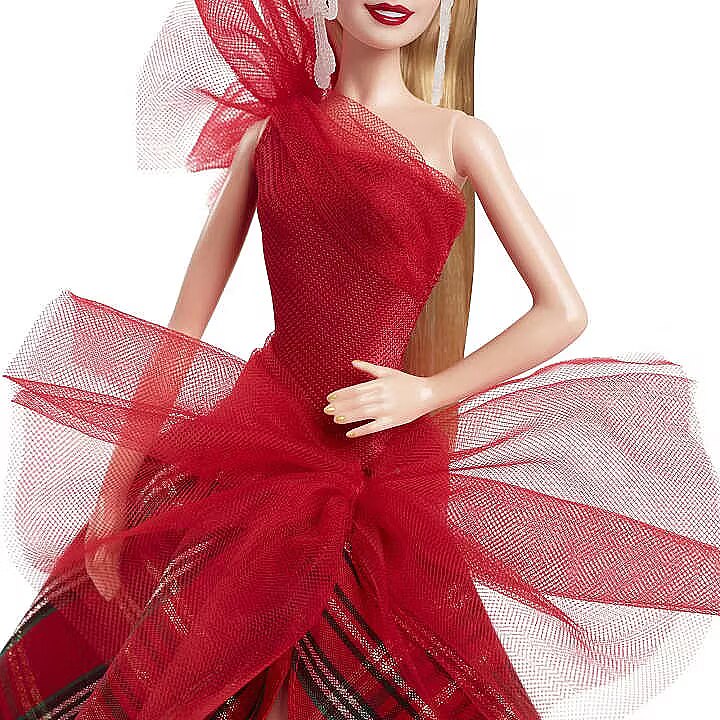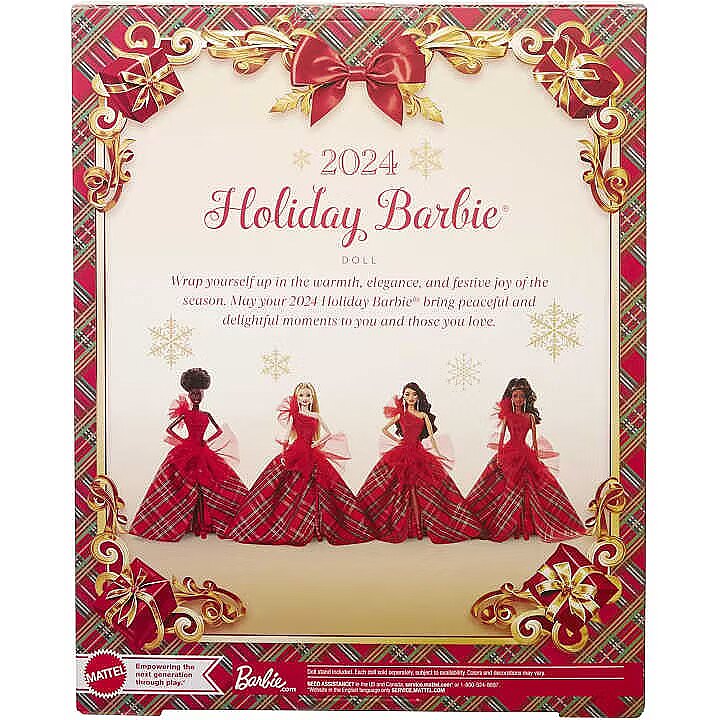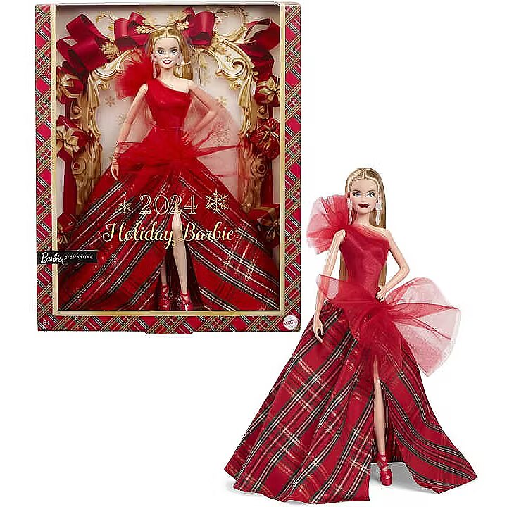 LongDesc - The 2024 Holiday Barbie doll embodies the warmth and love of the season with a festive gown and party look! Showcasing gorgeous drama, the dress pairs a draping, one-shoulder, sparkling red bodice with a full, plaid ballgown-style skirt. Big tulle accents are a modern take on a classic look. In packaging that's ideal for display, this collectible doll makes a great gift for 6 year olds and up. Includes doll stand and Certificate of Authenticity. Doll cannot stand alone. Colours and decorations may vary.