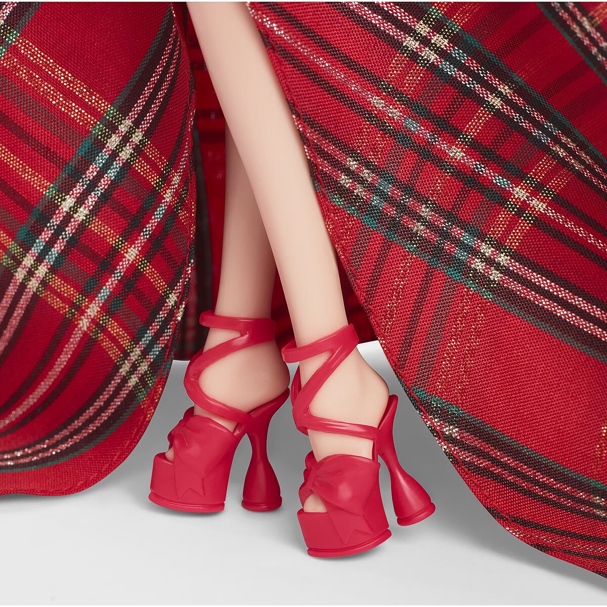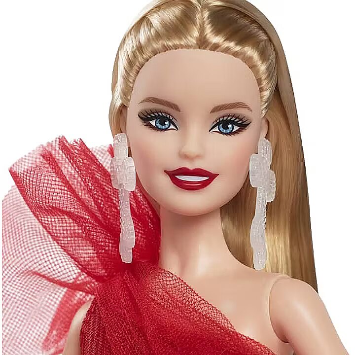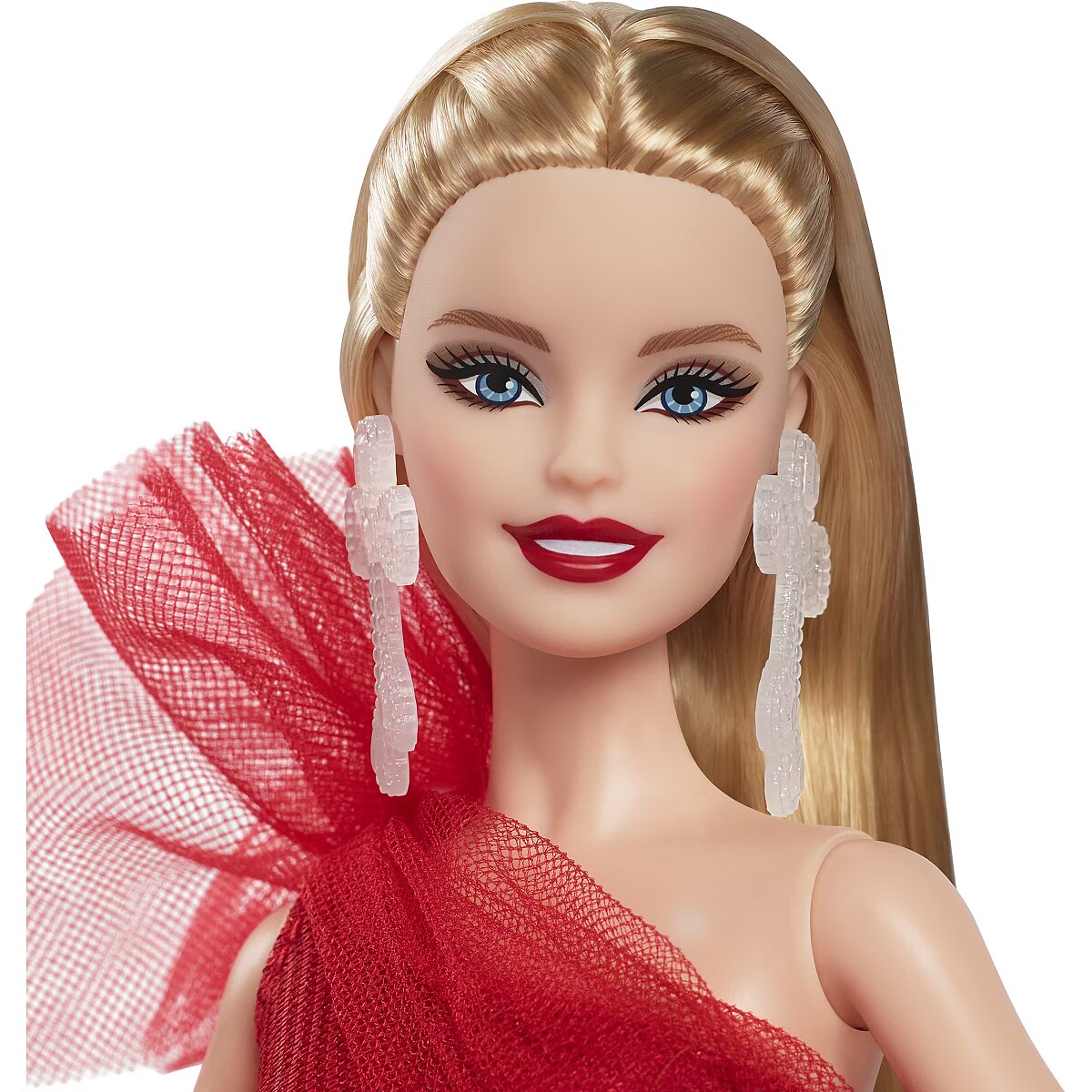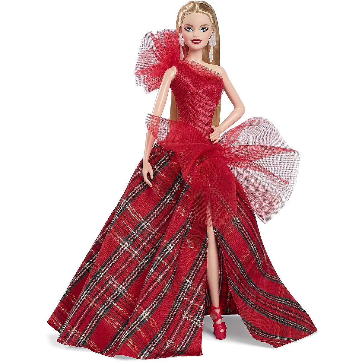 LongDesc - The 2024 Holiday Barbie doll embodies the warmth and love of the season with a festive gown and party look! Showcasing gorgeous drama, the dress pairs a draping, one-shoulder, sparkling red bodice with a full, plaid ballgown-style skirt. Big tulle accents are a modern take on a classic look. In packaging that's ideal for display, this collectible doll makes a great gift for 6 year olds and up. Includes doll stand and Certificate of Authenticity. Doll cannot stand alone. Colours and decorations may vary.