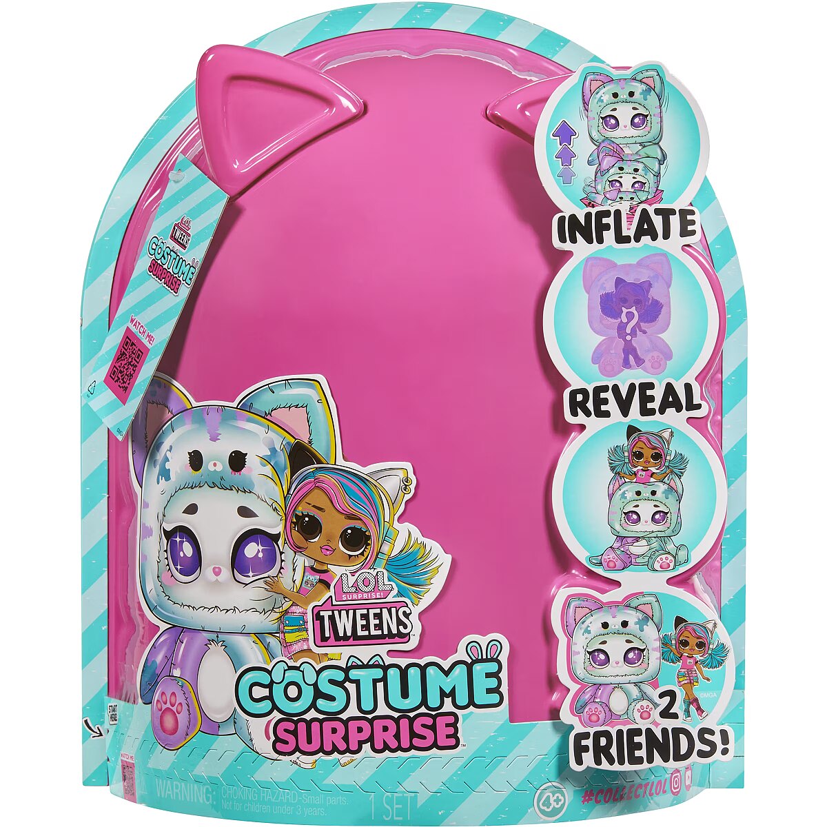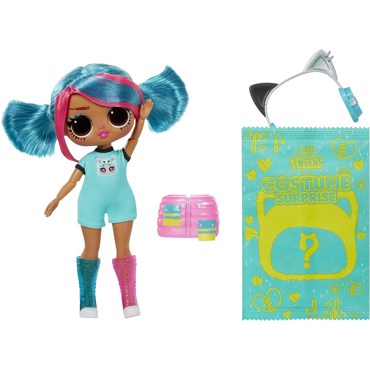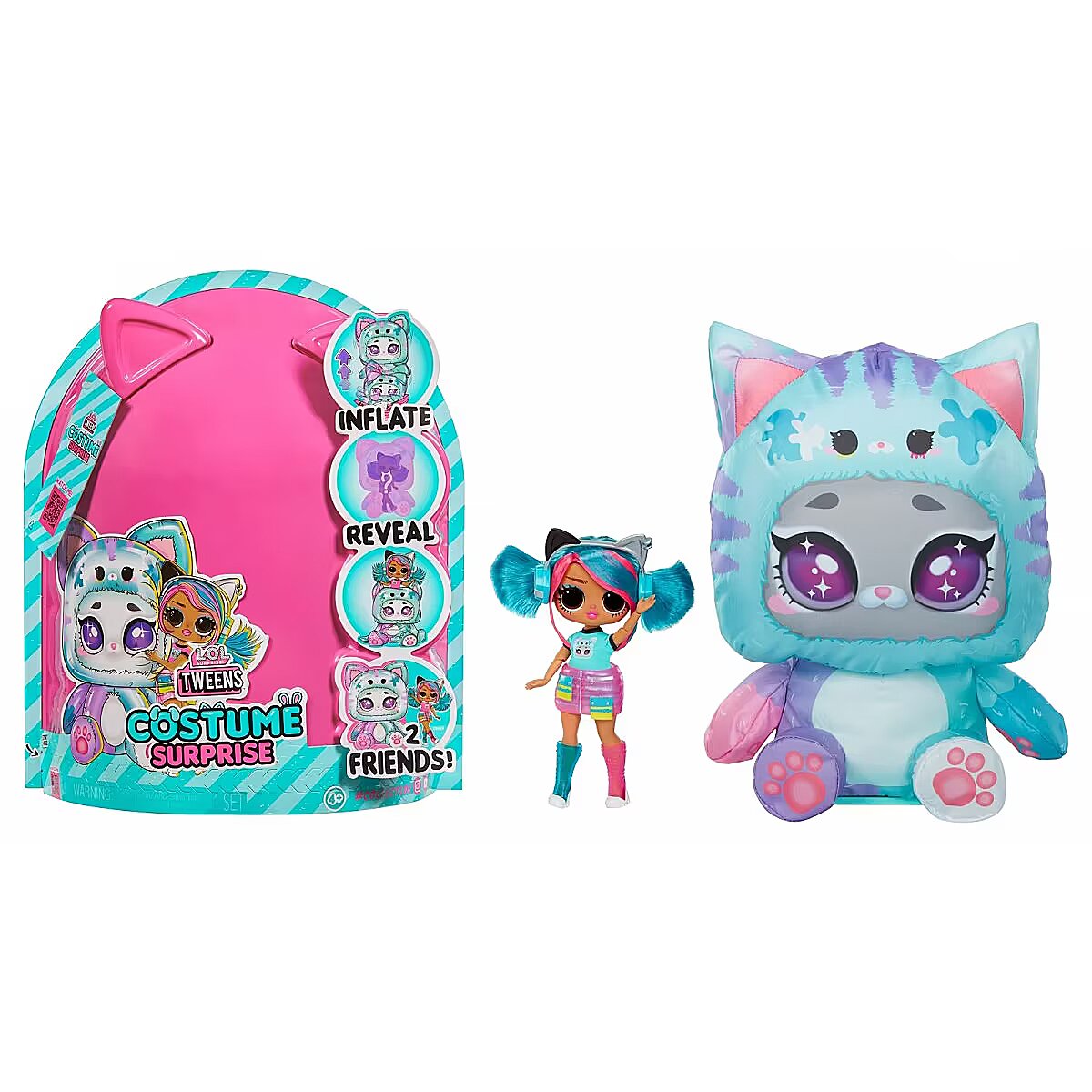 LongDesc - Adorably Awkward or Too Cool 4 School! Music Venue or Nail Salon! Stripes or Dots! – Emma Emo Get ready to unwrap the ultimate surprise and dive into an unboxing adventure like no other with the all-new L.O.L. Surprise Tweens Costume Surprise™ including fan-favorite fashion doll Emma Emo in a trendy new look and her adorable inflatable kitty costume. This outrageously fun, experiential reveal is bursting with layers of surprises, perfect for endless imaginative and storytelling play for kids. Discover what’s inside by first tearing the zipper at the bottom of the packaging and lifting up the outer pink shell to reveal a mystery wrapping paper, kicking off the first stage of the inflating process! Watch as the paper grows bigger and fuller and once completely inflated, rip open the paper to discover your charming teal kitty costume! But wait, the surprise doesn’t stop there! Undo the velcro from the back of the kitty’s head to unveil your gorgeous Tweens Emma Emo doll hidden inside! Don’t forget to unbox the cute surprises and remove the Tweens doll from her doll stand to dress her in trendy new fashions and accessories including a fashionable skirt, stylish headphones with kitty ears to match her huggable costume, and colorful chic shoes! Close up the pet costume and watch as it grows and fully inflates, giving you two best friends to play with together – Emma Emo and her kitty costume! And the fun doesn’t stop there - simply toggle the on and off switch at the bottom of your pet costume to repeat the inflating fun over and over again! Each Tweens doll has stunning features, glamorous hair, her own fabulous style, and comes articulated for tons of posing opportunities alongside her new pet costume friend! Collect all 4 dazzling L.O.L. Surprise Tweens Costume Surprise™ fashion dolls and their soft pet costumes: Aya Cherry with her bunny costume, Emma Emo with her kitty costume, Ali Dance with her puppy costume, and Hoops Cutie with her panda costume! Don’t forget to watch and catch the Tweens dolls and their pet costumes in action in the all-new L.O.L. Surprise SkateDance Movie, premiering October 2024 on YouTube Kids!