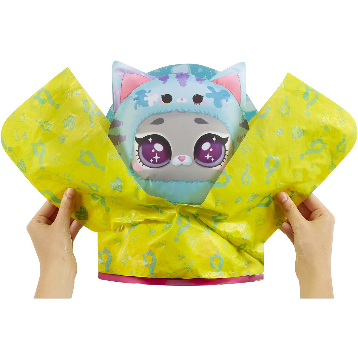 First, rip open the zip at the bottom of the package and lift up the outer pink cover to reveal mysterious wrapping paper! Watch as the paper gets bigger and fuller, and when fully inflated, tear the paper and reveal your adorable turquoise kitty costume! But wait, the surprises don't end there! Unfasten the Velcro on the back of the kitty's head to reveal the gorgeous Emo Emma Tweens doll hidden inside!