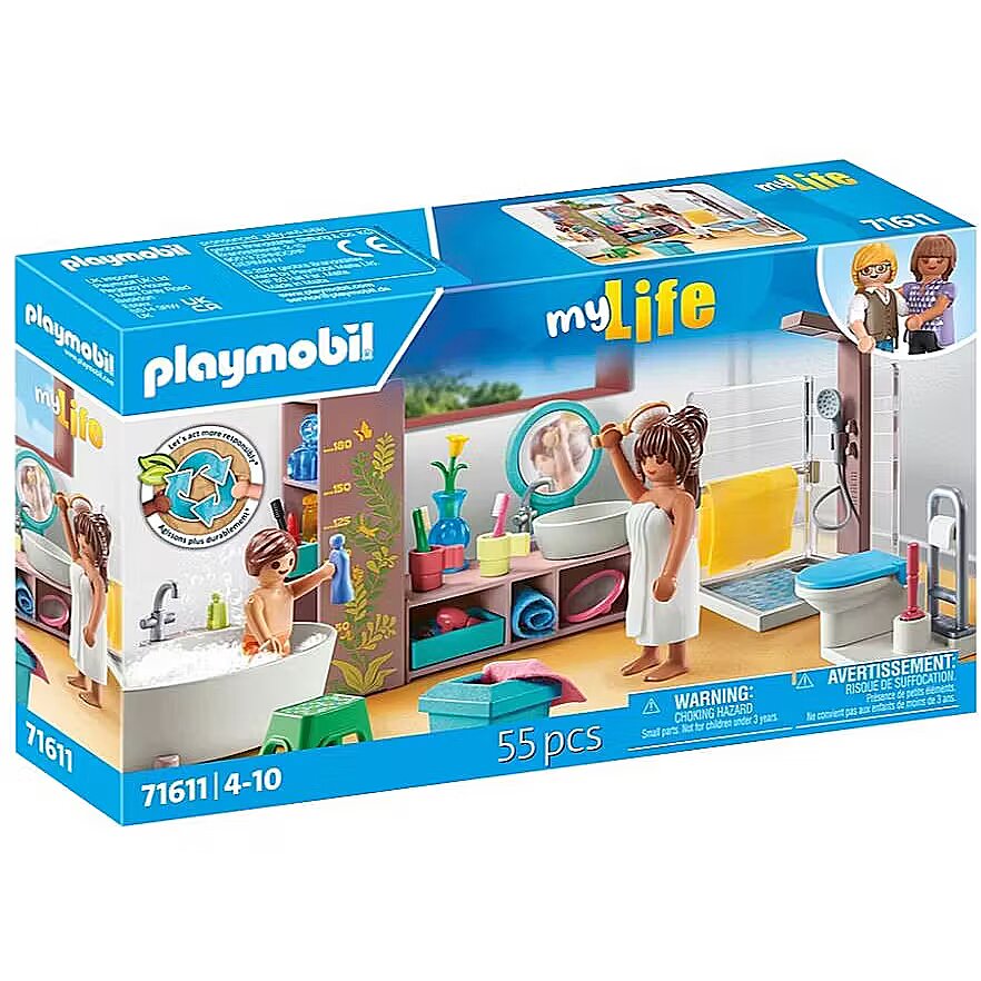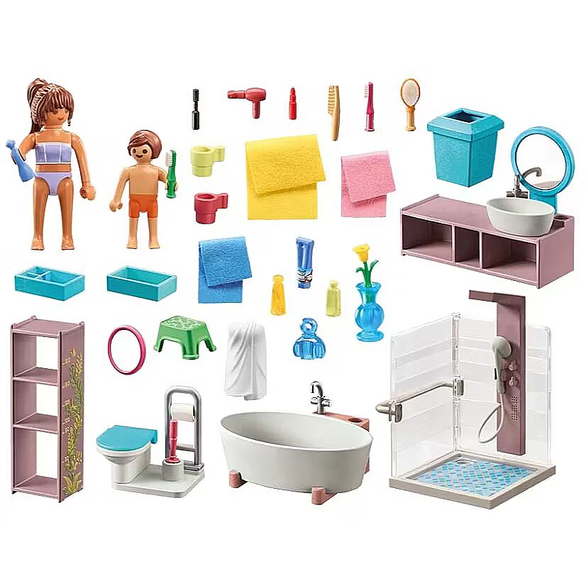 Description - Fun in the bathing oasis: PLAYMOBIL bathroom made from sustainable materials, featuring two PLAYMOBIL figures, shower, bathtub, and plenty of accessories for detailed role-playing.