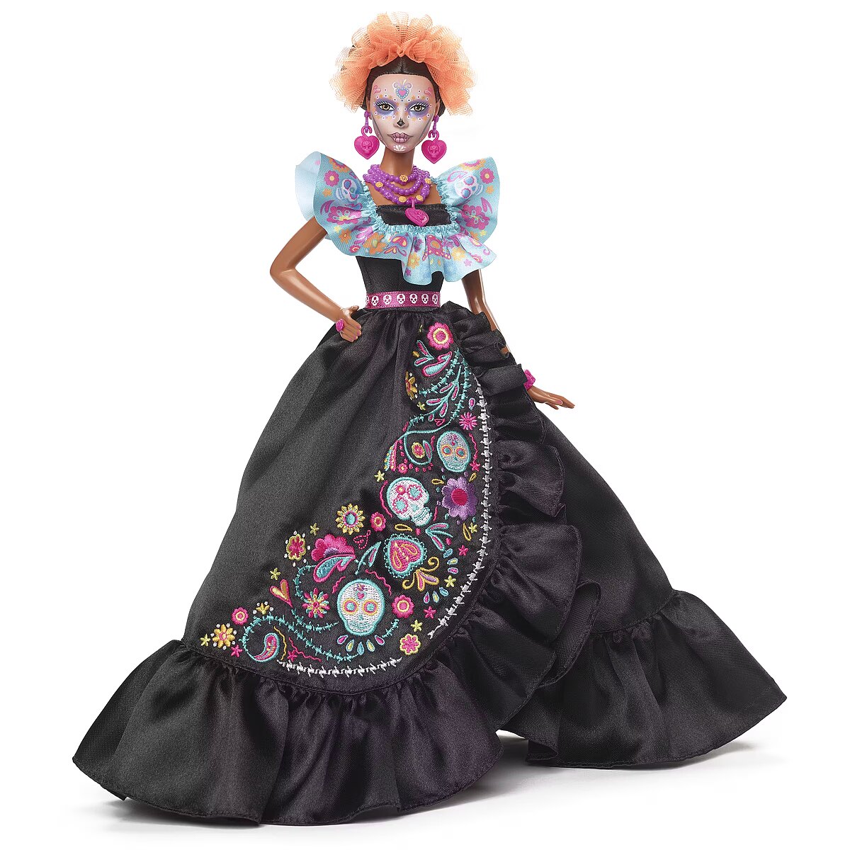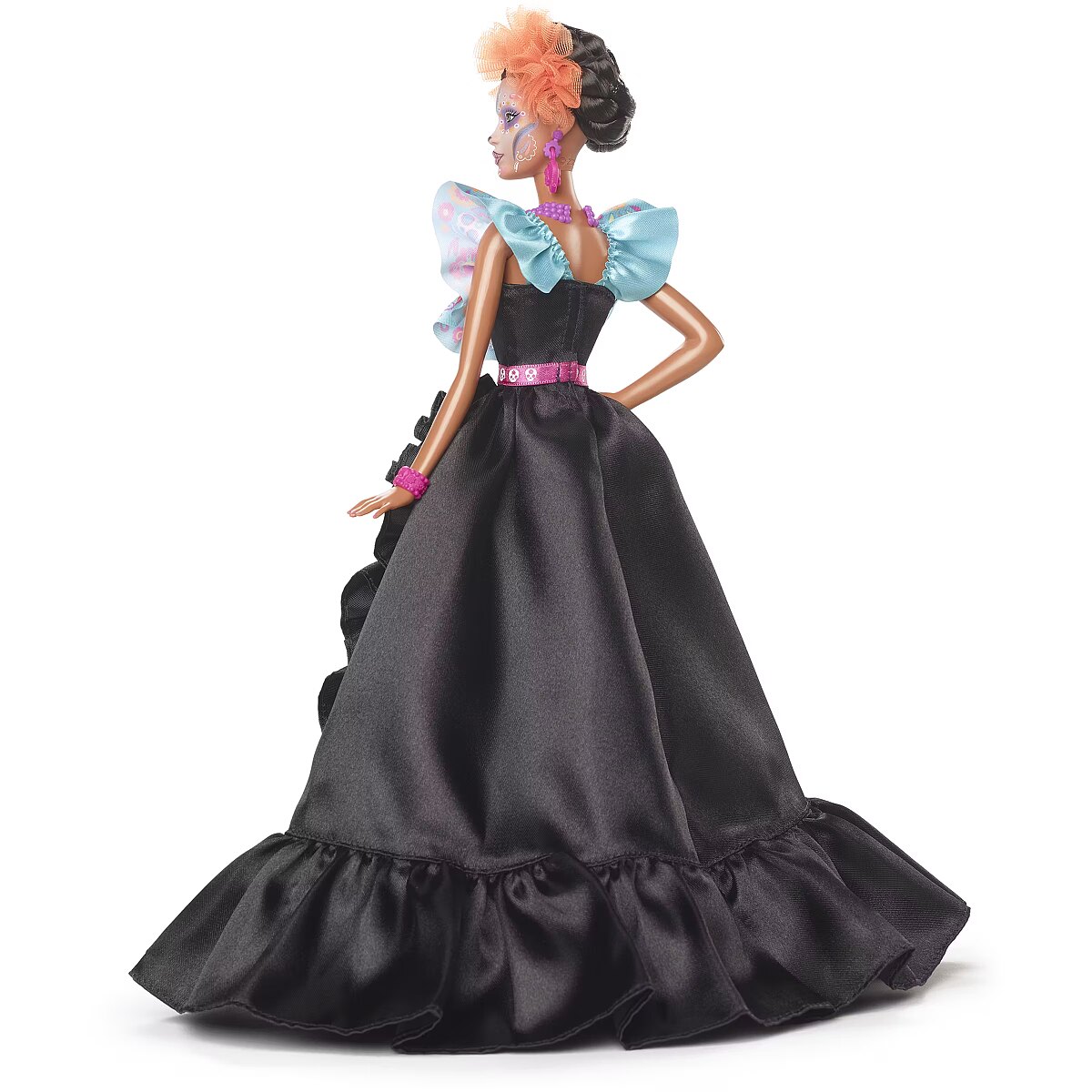 LongDesc - The Barbie Día De Muertos series honors the customs, symbols and rituals often seen throughout this festive time of remembrance. Barbie doll is a sight to behold in a beautiful black dress complemented by ruffles and embroidery-inspired artwork. A 'marigold' headpiece and statement jewelry frame her stunning calavera face paint. May the 2024 Día De Muertos Barbie doll become a treasured keepsake and holiday tradition! Includes doll stand and Certificate of Authenticity. Doll cannot stand alone. Colours and decorations may vary.