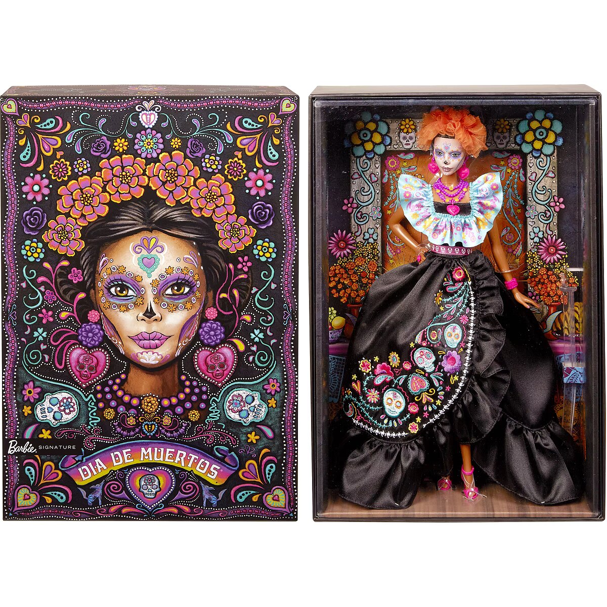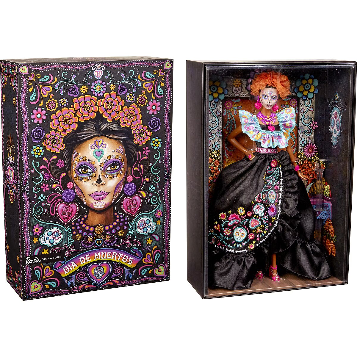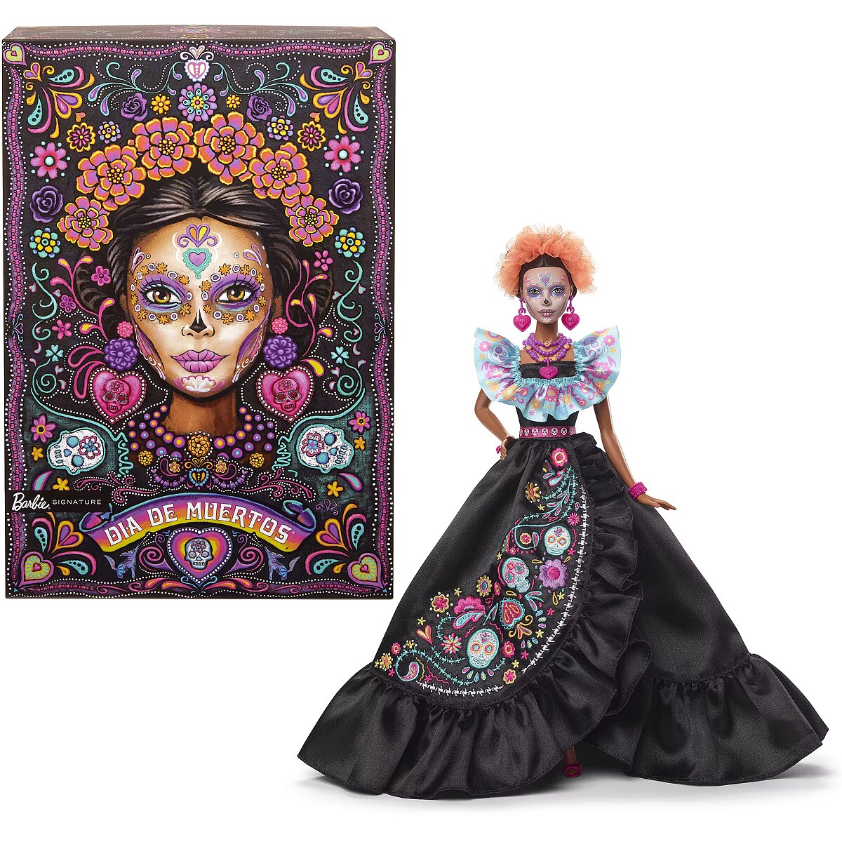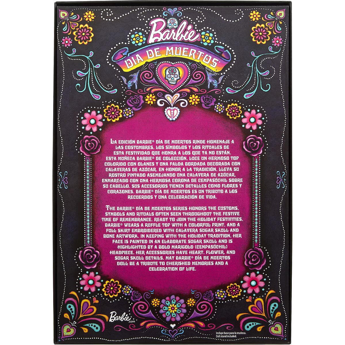 Description - Barbie Signature Día De Muertos 2024 The Barbie Día De Muertos series honors the customs, symbols and rituals often seen throughout this festive time of remembrance. Barbie doll is a sight to behold in a beautiful black dress complemented by ruffles and embroidery-inspired artwork. A "marigold" headpiece and statement jewelry frame her stunning calavera face paint. May the 2024 Día De Muertos Barbie doll become a treasured keepsake and holiday tradition! Includes doll stand and Certificate of Authenticity. Doll cannot stand alone. Colors and decorations may vary. Barbie continues its Día De Muertos series in 2024 with a lovingly designed doll. Her festive fashion is infused with references to the traditions, symbols, and rituals of this time-honored holiday. Barbie doll's satiny black dress is accented by a sky-blue ruffled bodice and rose-pink ribbon belt. Vibrant "embroidery" of bones, flowers, and sugar skulls bloom across the top and skirt. Her headpiece is made of gathered fabric and mimics the shape of marigold petals. Its rich orange hue beautifully complements the shimmering lilac color in her traditional calavera face paint. Sugar skull corazón earrings, a chunky candy-colored necklace, and a pink flower ring add an extra dash of sweetness to her holiday look. The 2024 Barbie Día De Muertos doll comes in gorgeously illustrated packaging that is perfect for display and gifting. May she bring joy to your household as you celebrate the memories of loved ones!