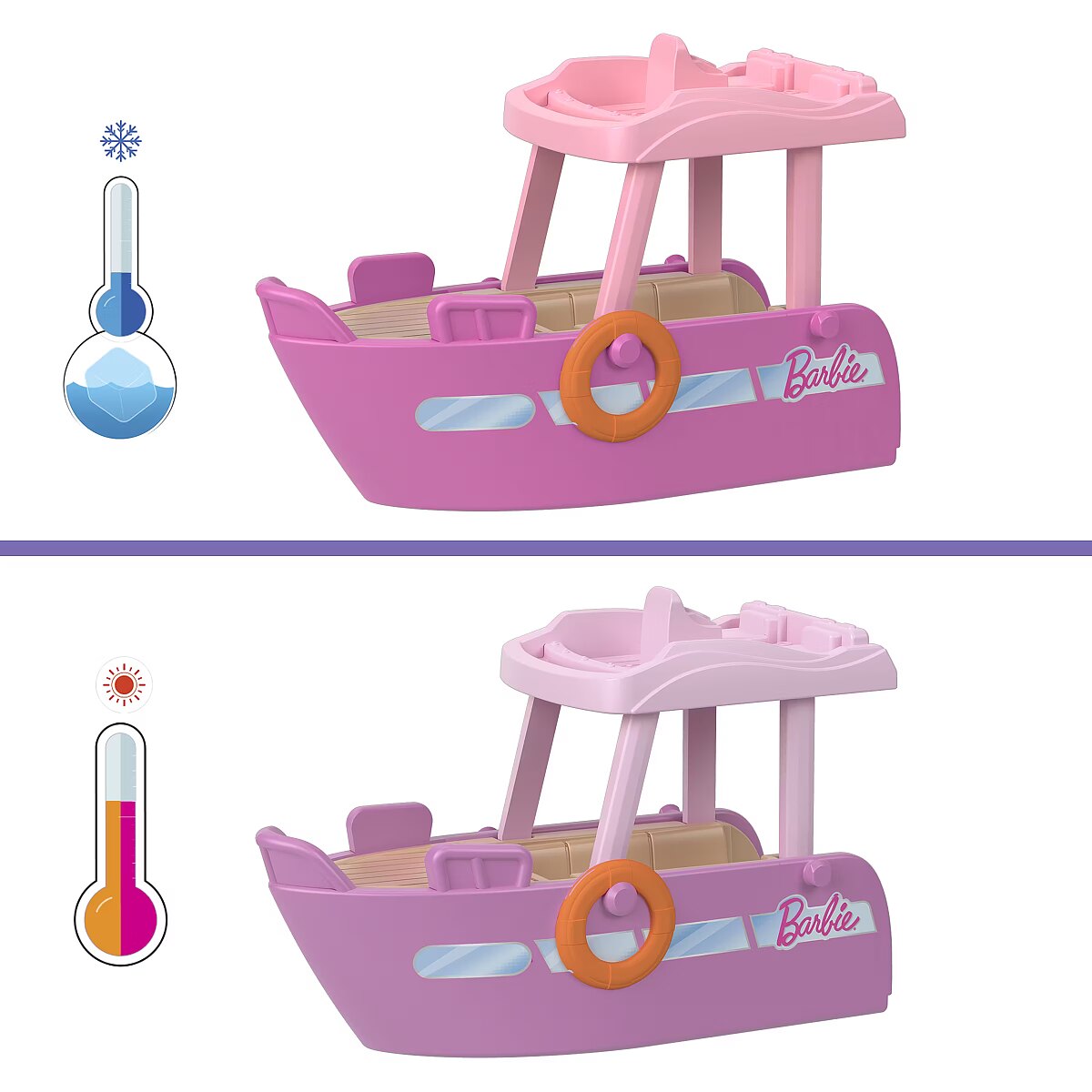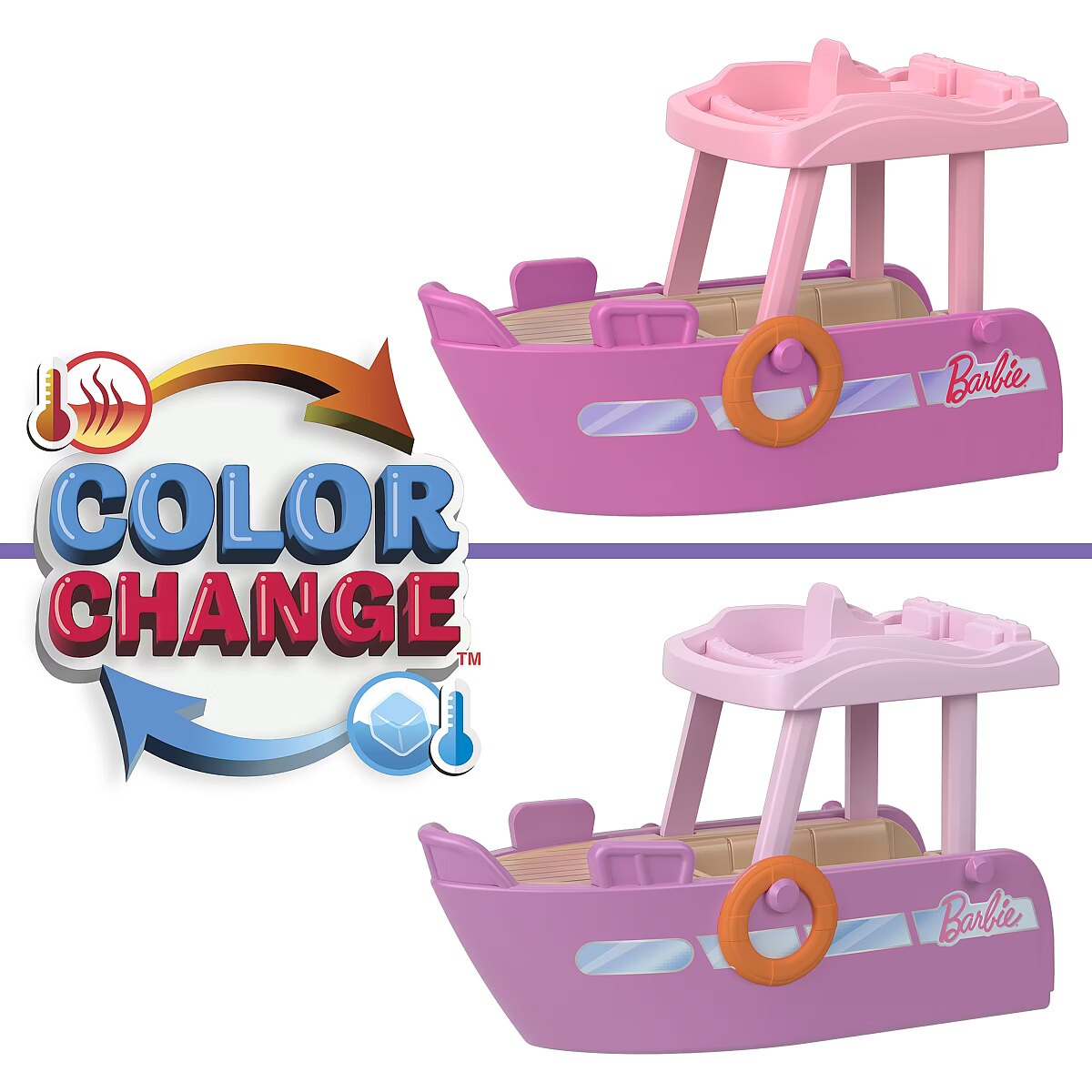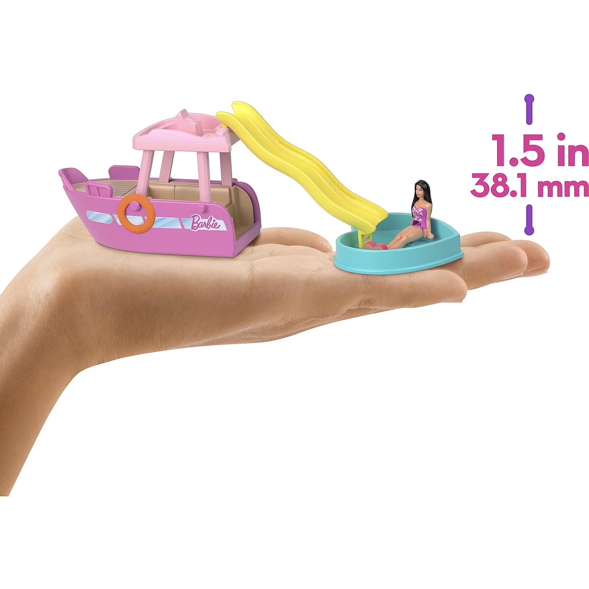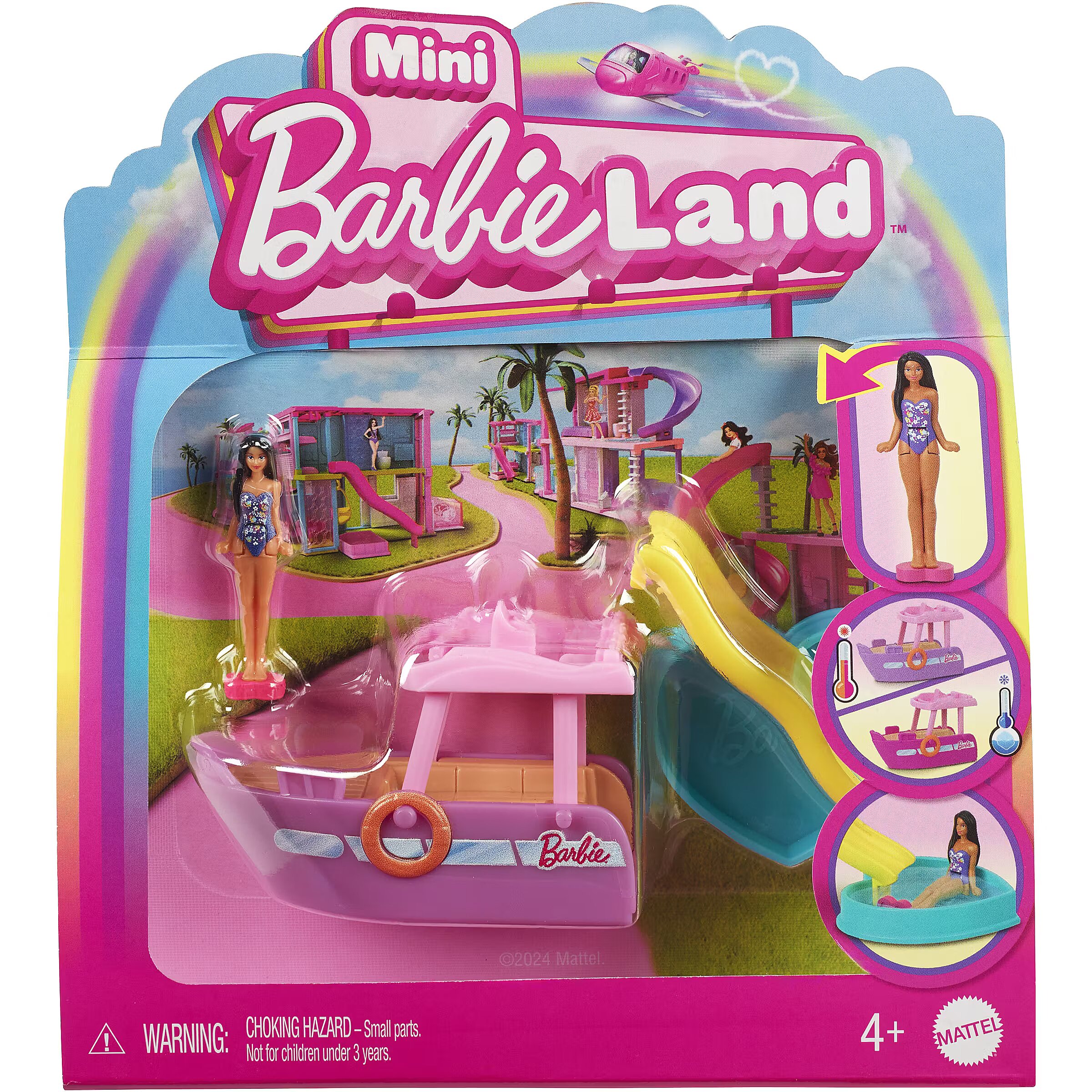 LongDesc - Enter the world of Barbie doll with Mini BarbieLand -- a place to imagine big and Dream in Mini! Sweet rides made with surprise, these mini vehicle sets are ready for play or display. This small-scale recreation of the iconic Barbie Dream Boat features a pool with slide and a splashy colour-change transformation! The set comes with an adorably styled 1.5-inch Barbie doll that bends at the waist so she can sit and cruise toward big adventures in Mini BarbieLand. Fans ages 4 years and older will want to collect all these cute wheels to build their own mini world! Each sold separately, subject to availability. Colours and decorations may vary.
