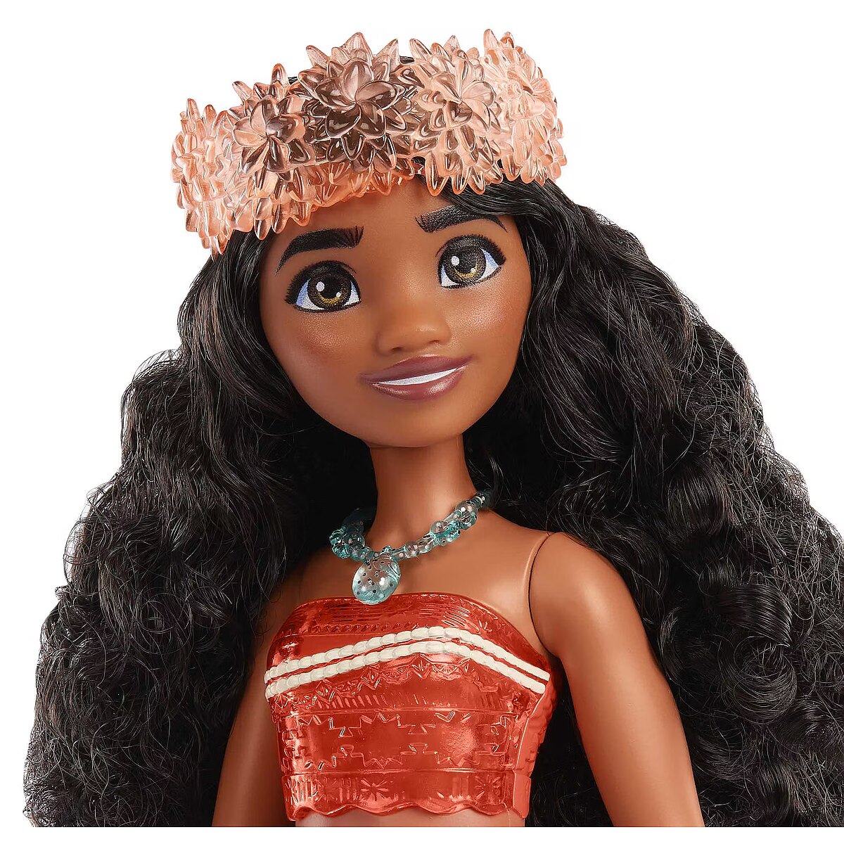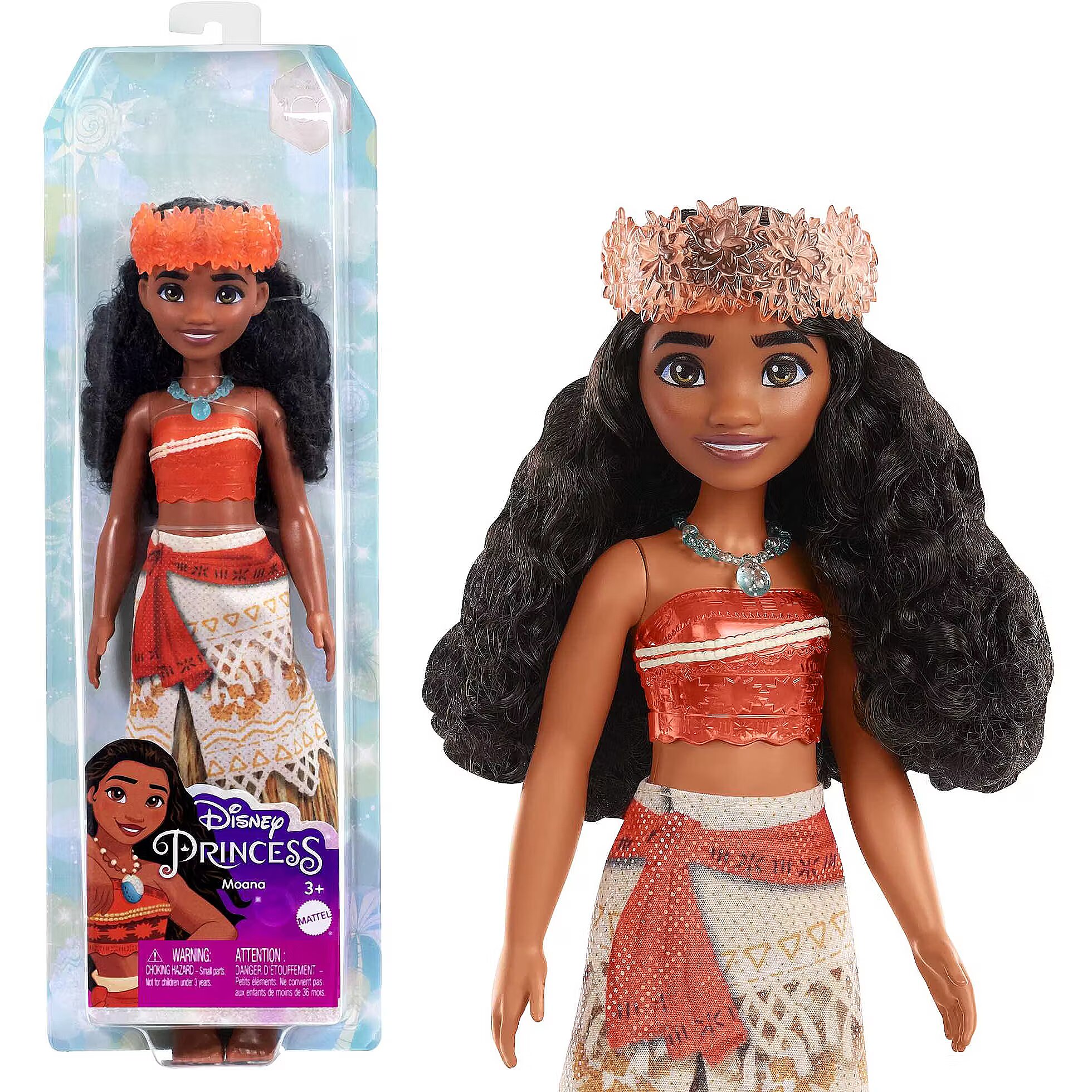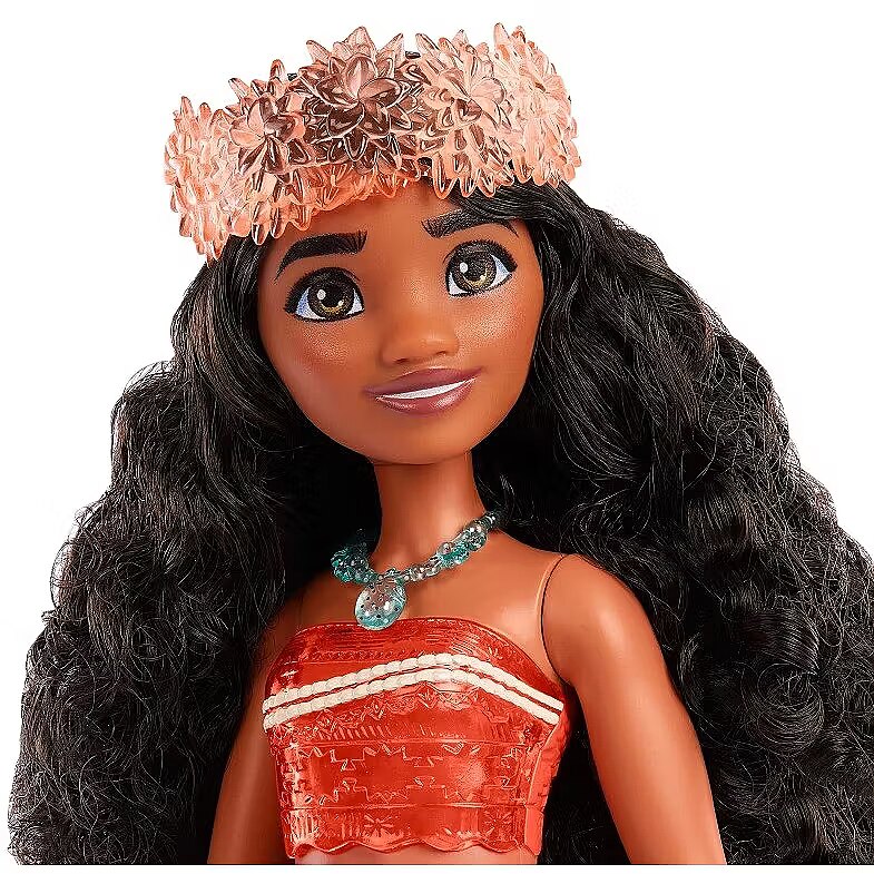 LongDesc - Meet this Disney Princess Moana doll, inspired by the driven and independent heroine from the popular Disney movie! This posable fashion doll is shown in a sparkling outfit and accessories that include a headband and necklace. In her signature look inspired by the movie, this Moana doll is ready for any adventure! Doll cannot stand alone. Colours and decorations may vary.