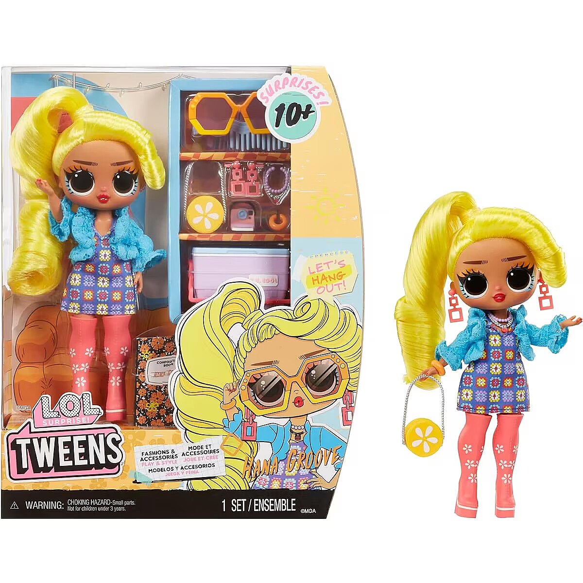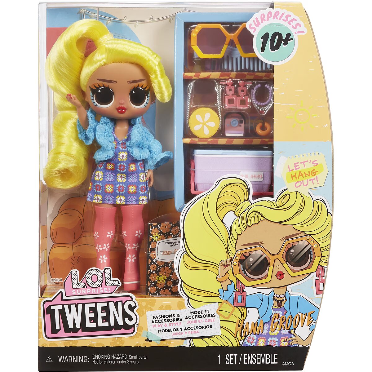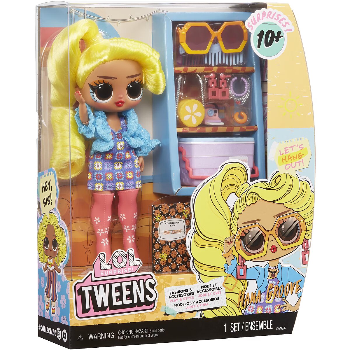 LongDesc - I’m in Be Tween, but right where I wanna be. Full of surprises & unique style. Look out world, cuz here I come.Introducing the all-new L.O.L. Surprise Tweens fashion doll Hana Groove, a fan of retro style and record stores! Unbox 10+ surprises and get to know Hana Groove who loves adding to her record collection and is always ready to groove. As the life of the party, she enjoys inviting her BFFs to hang out, especially on a sunny day! Dress Hana Groove in her beautiful fashions inspired by the 70s including her stylish crocheted dress and her pink knee-high boots that were made for walkin’. Her love for a sunshine-y day can be seen in her flower print purse and trendy sunglasses! Her outfit also includes a cropped jacket with frilly embellishments, square earrings, an adorable bracelet, and cool, layered necklaces! She also comes with a cute cooler that makes the best accessory to any picnic or dance party, along with an adorable polaroid camera ready to capture every moment. She has stunning features, beautiful hair, her own fabulous style, and comes articulated for tons of posing opportunities. Each box includes a L.O.L. Surprise Tweens fashion doll, unique fashions, boots, purse, sunglasses, accessories, cooler, camera, and hairbrush. Collect all L.O.L. Surprise Tweens fashion dolls: Ellie Fly, Hana Groove, Flora Moon, and Cassie Cool! L.O.L. Surprise fashion dolls with stylish hair, outfits and many detailed accessory pieces make a perfect toy for kids, including 4 years old and up for imaginative pretend play! As gifts for any special occasion, dolls provide hours of social play with siblings and friends! From MGA Entertainment, creators of L.O.L. Surprise fashion and collectible dolls, Rainbow High™ fashion dolls, Na Na Na Surprise dolls, Bratz® fashion dolls, MGA's Dream Ella™, MGA's Glitter Babyz™, Lalaloopsy™, Baby Born® Surprise baby dolls and collectibles, Little Tikes® kids' toys and many other favorite brands.