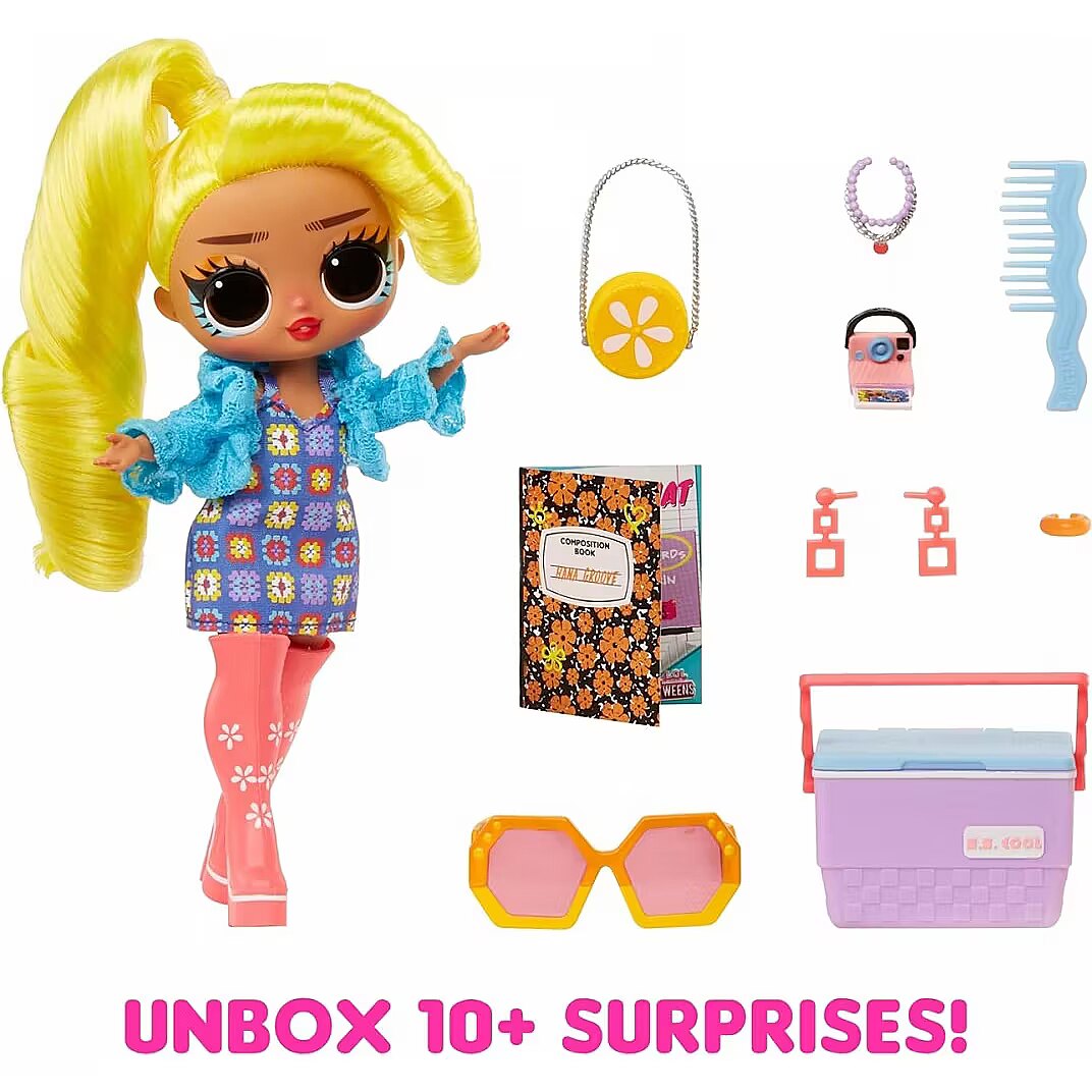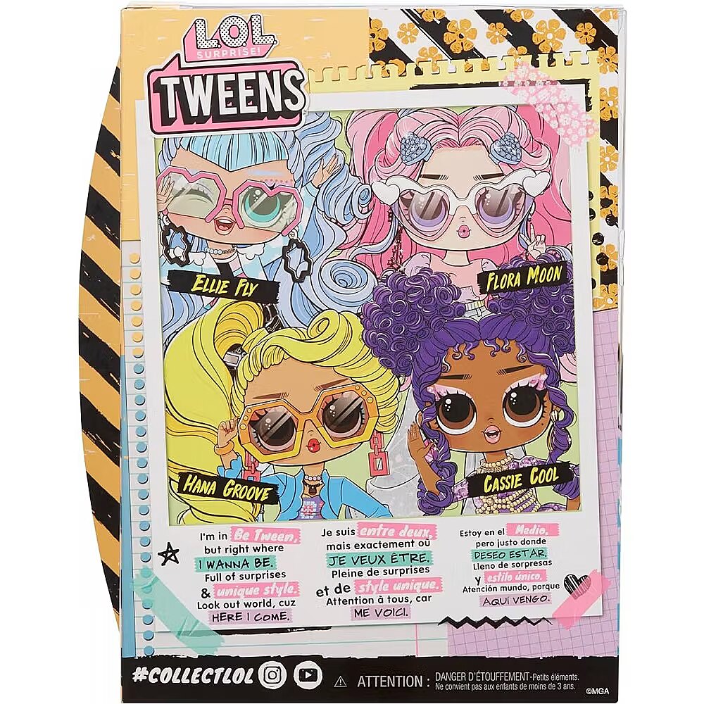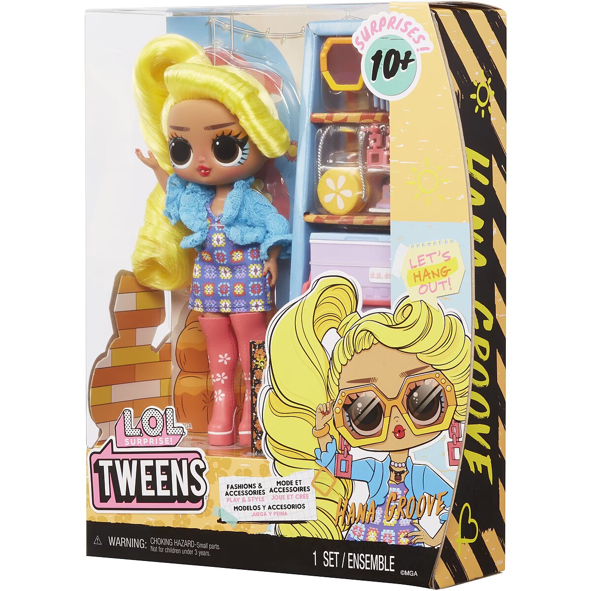 LongDesc - I’m in Be Tween, but right where I wanna be. Full of surprises & unique style. Look out world, cuz here I come.Introducing the all-new L.O.L. Surprise Tweens fashion doll Hana Groove, a fan of retro style and record stores! Unbox 10+ surprises and get to know Hana Groove who loves adding to her record collection and is always ready to groove. As the life of the party, she enjoys inviting her BFFs to hang out, especially on a sunny day! Dress Hana Groove in her beautiful fashions inspired by the 70s including her stylish crocheted dress and her pink knee-high boots that were made for walkin’. Her love for a sunshine-y day can be seen in her flower print purse and trendy sunglasses! Her outfit also includes a cropped jacket with frilly embellishments, square earrings, an adorable bracelet, and cool, layered necklaces! She also comes with a cute cooler that makes the best accessory to any picnic or dance party, along with an adorable polaroid camera ready to capture every moment. She has stunning features, beautiful hair, her own fabulous style, and comes articulated for tons of posing opportunities. Each box includes a L.O.L. Surprise Tweens fashion doll, unique fashions, boots, purse, sunglasses, accessories, cooler, camera, and hairbrush. Collect all L.O.L. Surprise Tweens fashion dolls: Ellie Fly, Hana Groove, Flora Moon, and Cassie Cool! L.O.L. Surprise fashion dolls with stylish hair, outfits and many detailed accessory pieces make a perfect toy for kids, including 4 years old and up for imaginative pretend play! As gifts for any special occasion, dolls provide hours of social play with siblings and friends! From MGA Entertainment, creators of L.O.L. Surprise fashion and collectible dolls, Rainbow High™ fashion dolls, Na Na Na Surprise dolls, Bratz® fashion dolls, MGA's Dream Ella™, MGA's Glitter Babyz™, Lalaloopsy™, Baby Born® Surprise baby dolls and collectibles, Little Tikes® kids' toys and many other favorite brands.