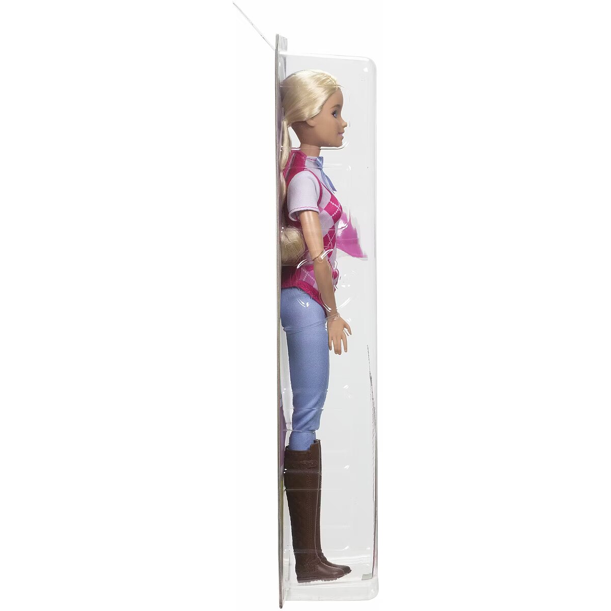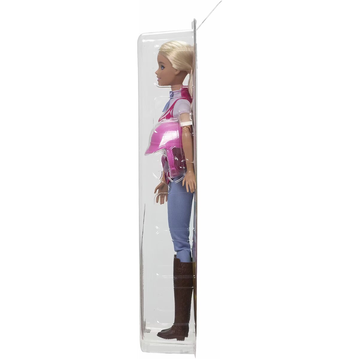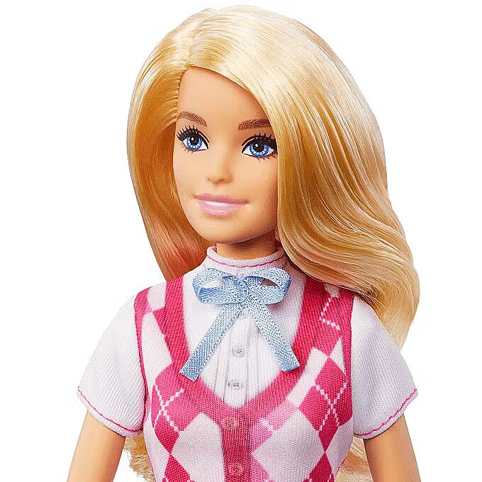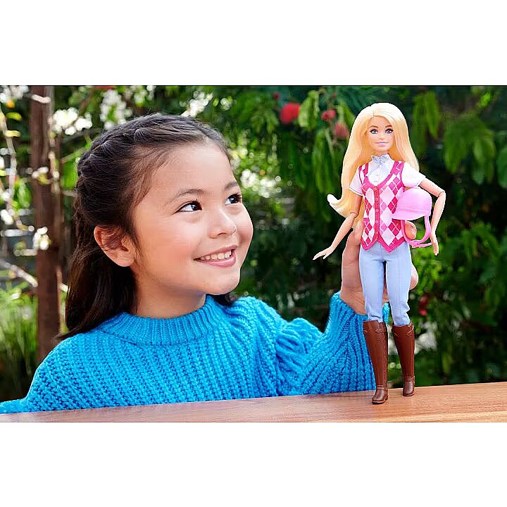 LongDesc - Barbie 'Malibu' doll is ready for horseback riding adventures! With a stylish riding outfit, she looks just like her character from the Netflix series, Barbie Mysteries: The Great Horse Chase. The fashion doll wears a removable shirt and vest, pants, boots, and helmet -- and bends at the elbows, wrists, and knees for realistic riding play! Doll cannot stand alone. Colours and decorations may vary.