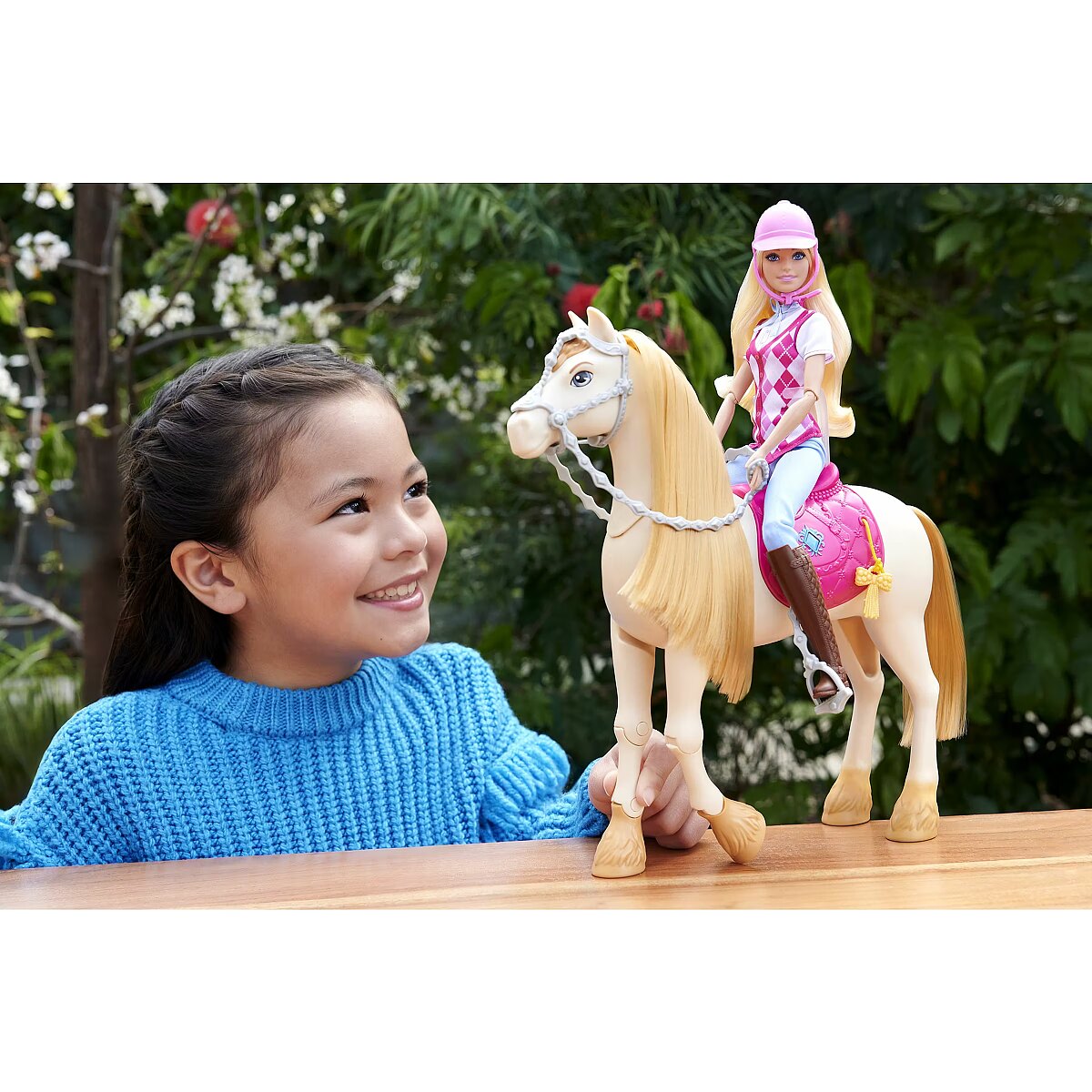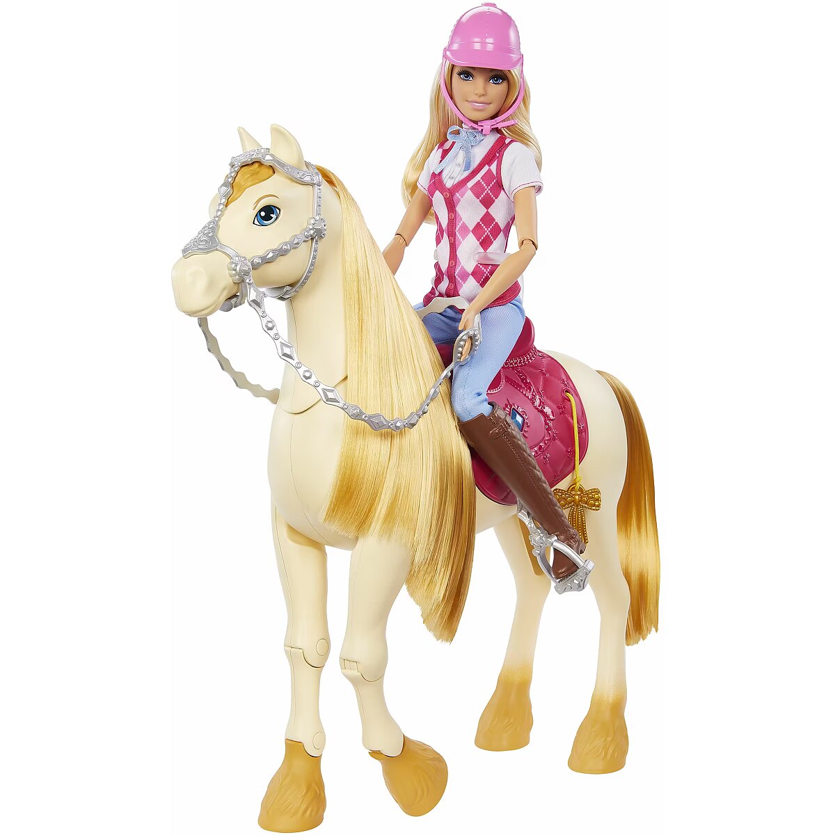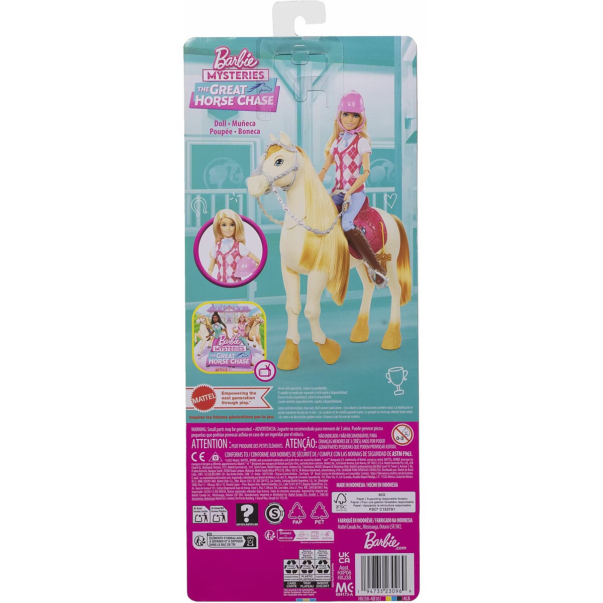 LongDesc - Barbie 'Malibu' doll is ready for horseback riding adventures! With a stylish riding outfit, she looks just like her character from the Netflix series, Barbie Mysteries: The Great Horse Chase. The fashion doll wears a removable shirt and vest, pants, boots, and helmet -- and bends at the elbows, wrists, and knees for realistic riding play! Doll cannot stand alone. Colours and decorations may vary.