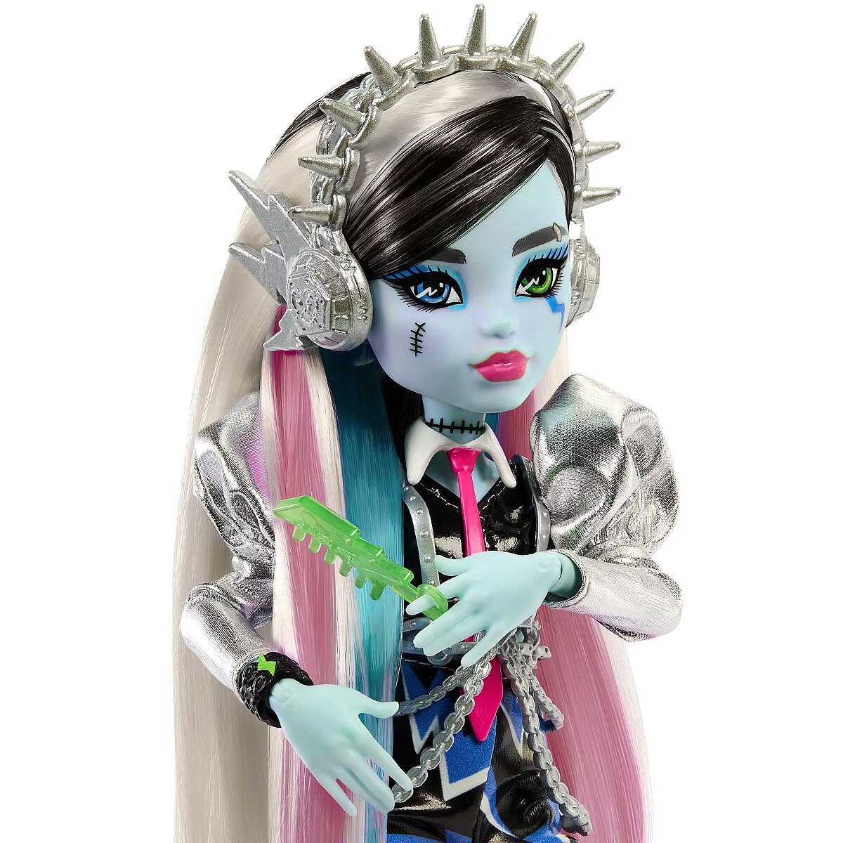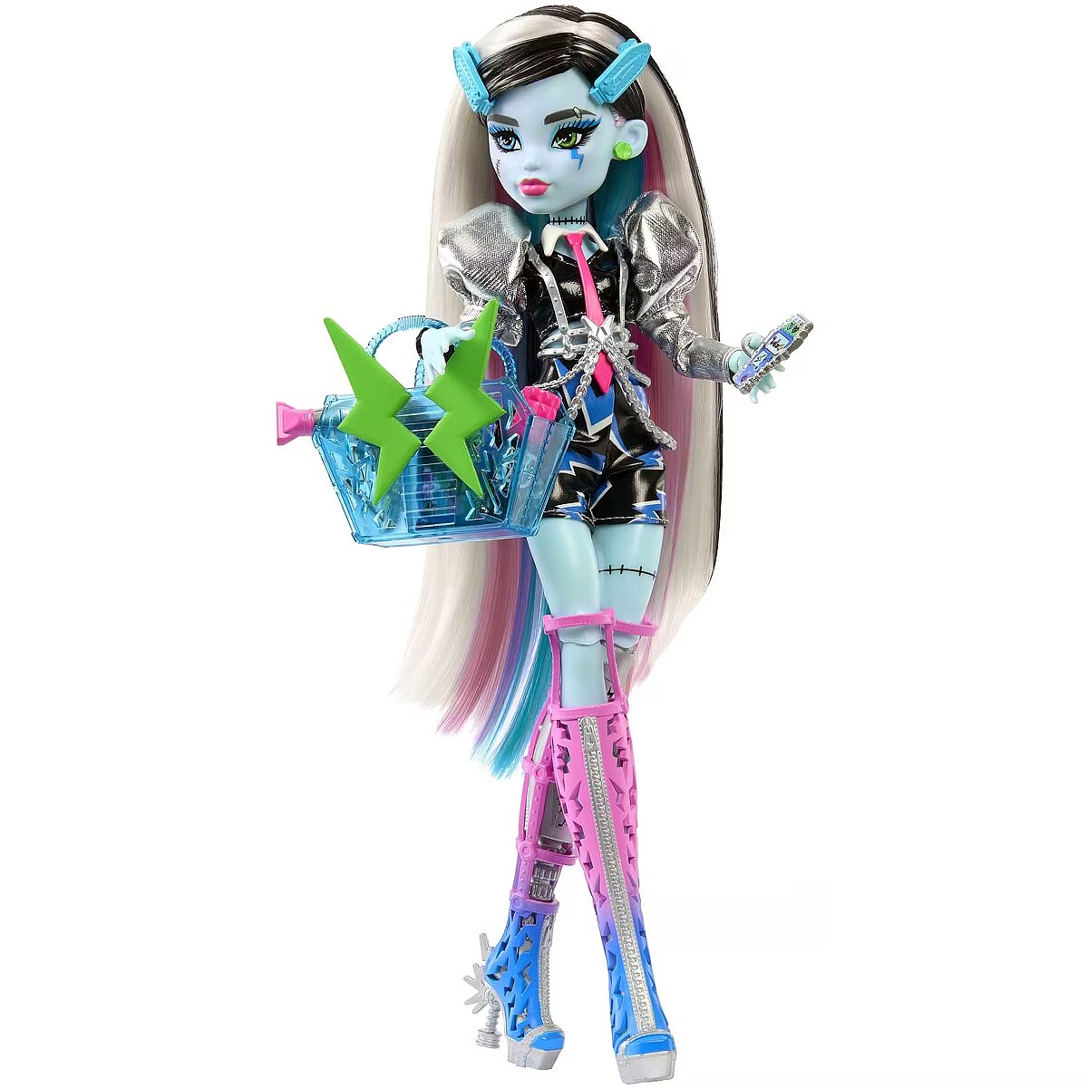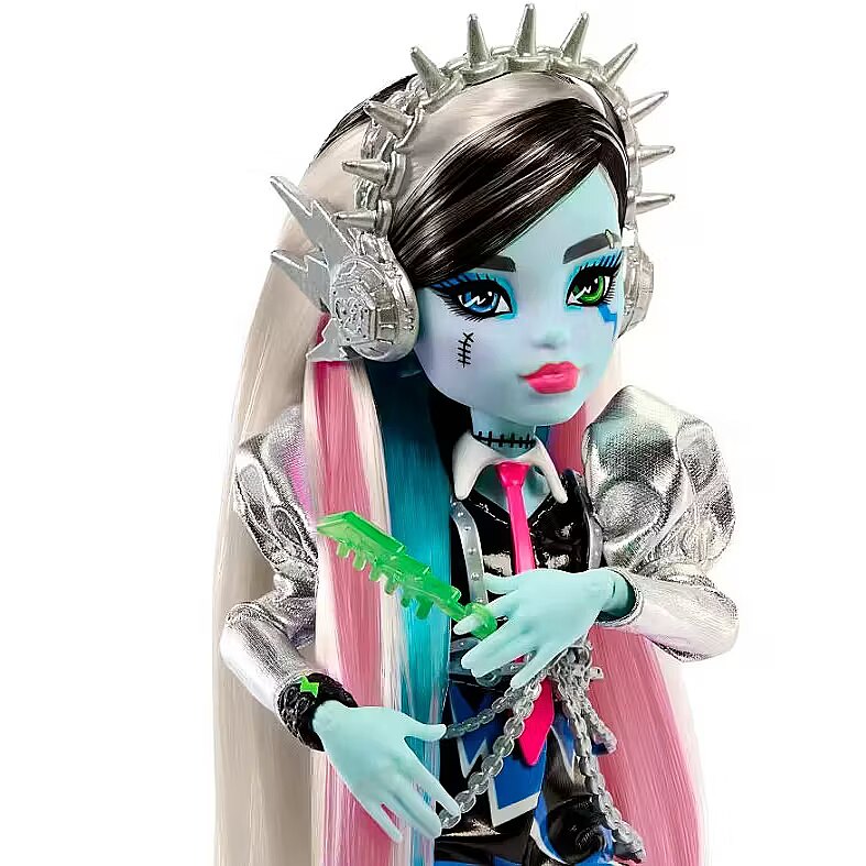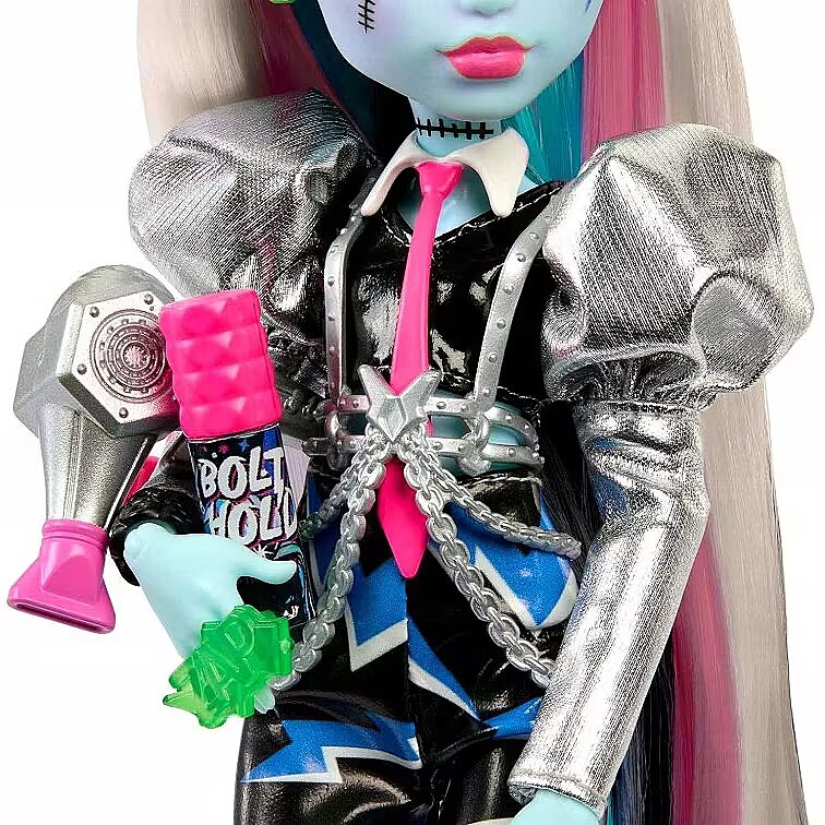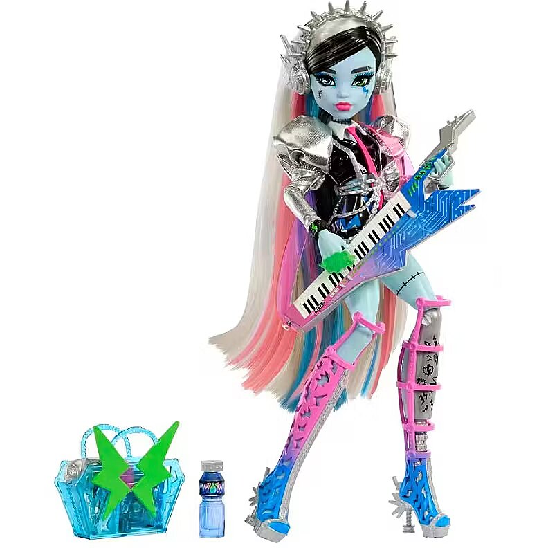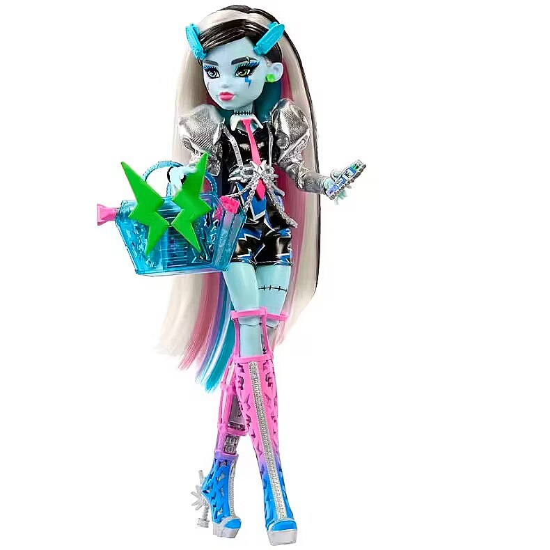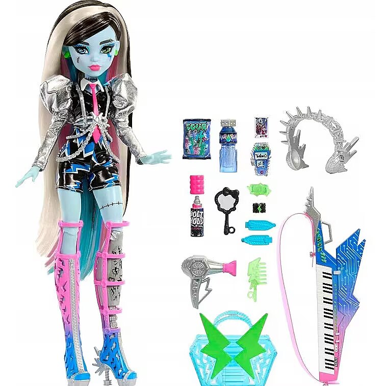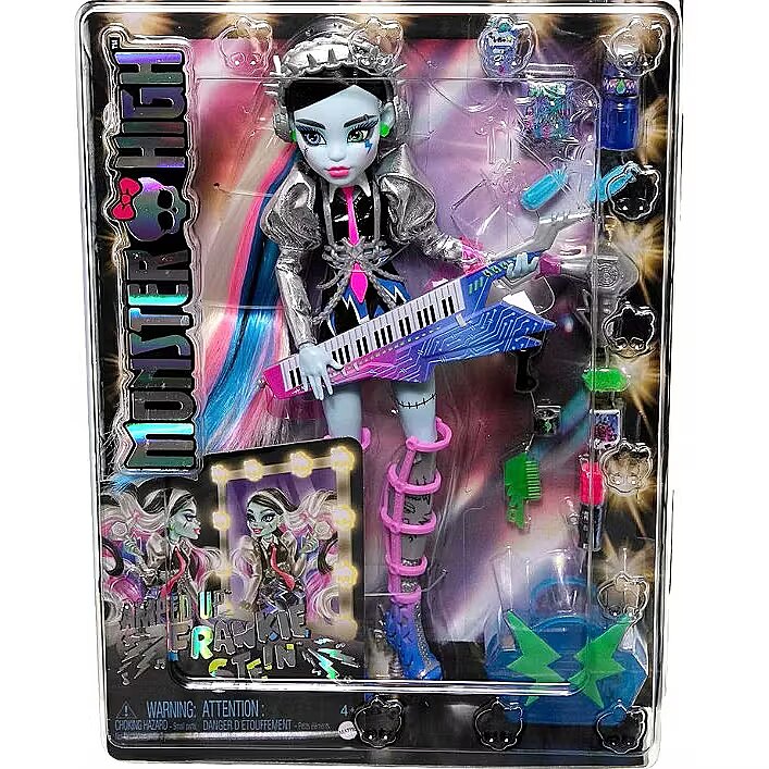 Description - This Monster High doll is ready to rock! As soon as Frankie Stein gets on stage, they send spooktacular shockwaves across the clawditorium with an electrifying performance. Their gore-geously glam outfit, instrument, and backstage essentials set the scene for a creeperific rock 'n roll show. Kids 4 years old and up will love jamming out monster-style with Amped Up Frankie Stein! Fully articulated. Doll cannot stand alone. Colors and decorations may vary. Amped Up Frankie Stein doll sparks to life on stage! They give off major mon-star vibes with a voltageous fashion and performance-themed accessories. Their lurk channels preppy-punk energy with metallic puff sleeves, faux-leather lightning bolt shorts, and a draped chain harness. Peep-toe boots feature zipper details and spiky hardware heels, while a chunky ring, bracelet, and earrings enhance their electrifying ensemble! First, Frankie Stein doll gets ready backstage! They come with all the beauty essentials to style their rocker-glam hair: bolt hold hairspray, a blow dryer, comb, mirror, and clips. Once Frankie Stein slips on their headphones and keytar instrument, its time to rock on stage! They zap the audience with a zolt of electric music energy. Storytelling pieces spark imagination! Refuel after the show with candy and a drink, and carry must-haves like an iCoffin and a photo of the boos in the freaky-fab tote! This Frankie Stein rocker doll makes a creeptastically cool gift. Kids can collect other Monster High dolls and playsets for more frightful fun! Each sold separately, subject to availability.
